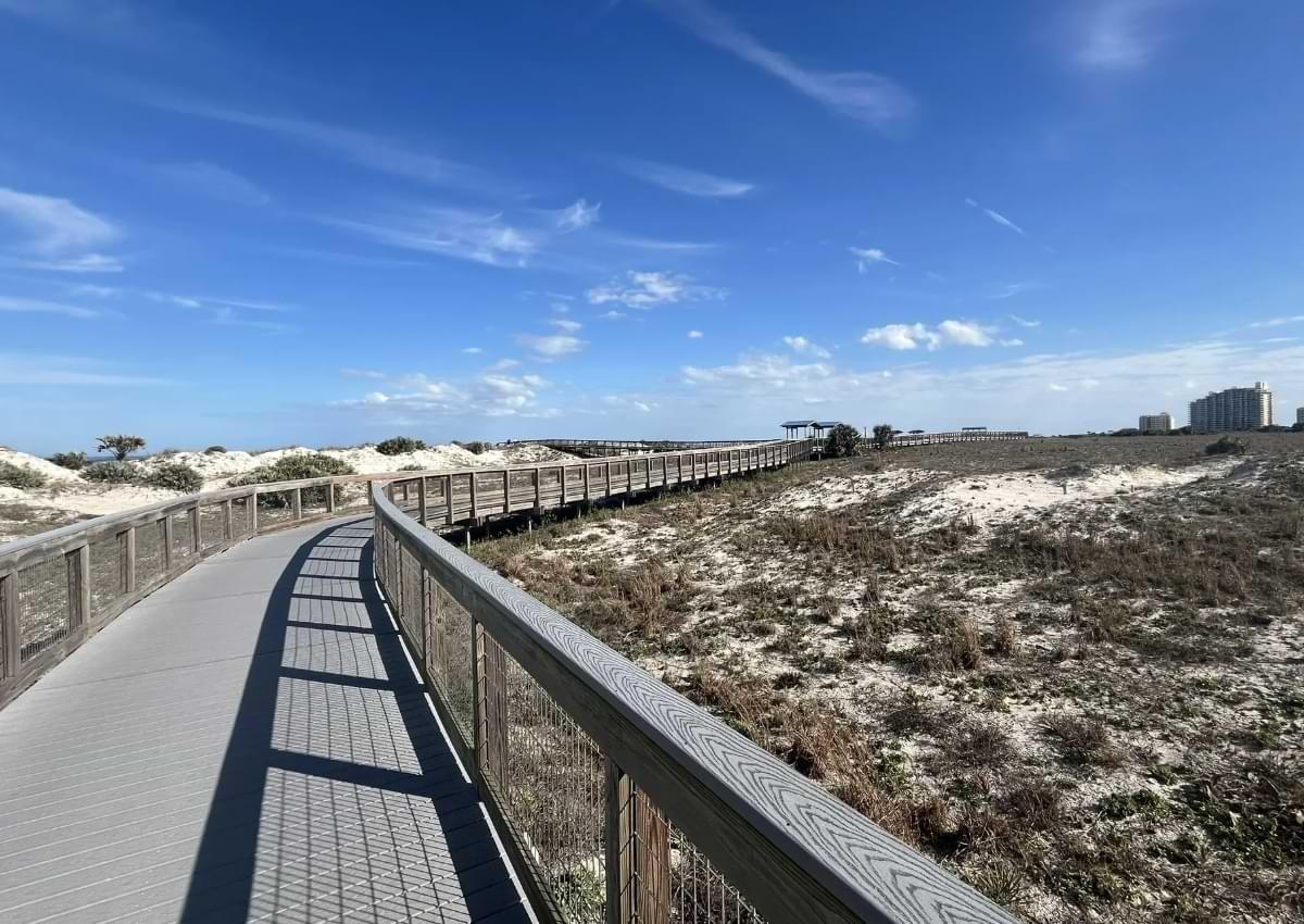 Smyrna Dunes Park features a long, wheelchair-accessible boardwalk that leads to the beach and inlet jetties. It offers open views of the ocean, the Ponce Inlet Lighthouse, and frequent wildlife sightings, along with multiple access points to the shoreline.