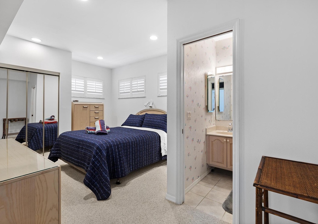 On the bottom floor, you will find two spacious bedrooms that share a nicely appointed bathroom with a walk-in shower. Dressed with soft linens, one room is furnished with a king-size bed, the other a queen. There is ample dresser space for all your personals. A washer and dryer are also located on the ground floor.