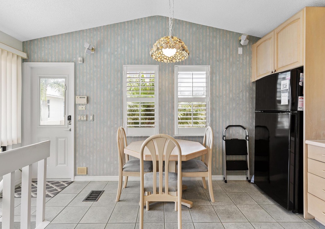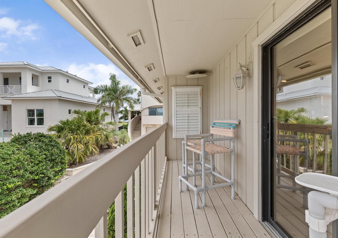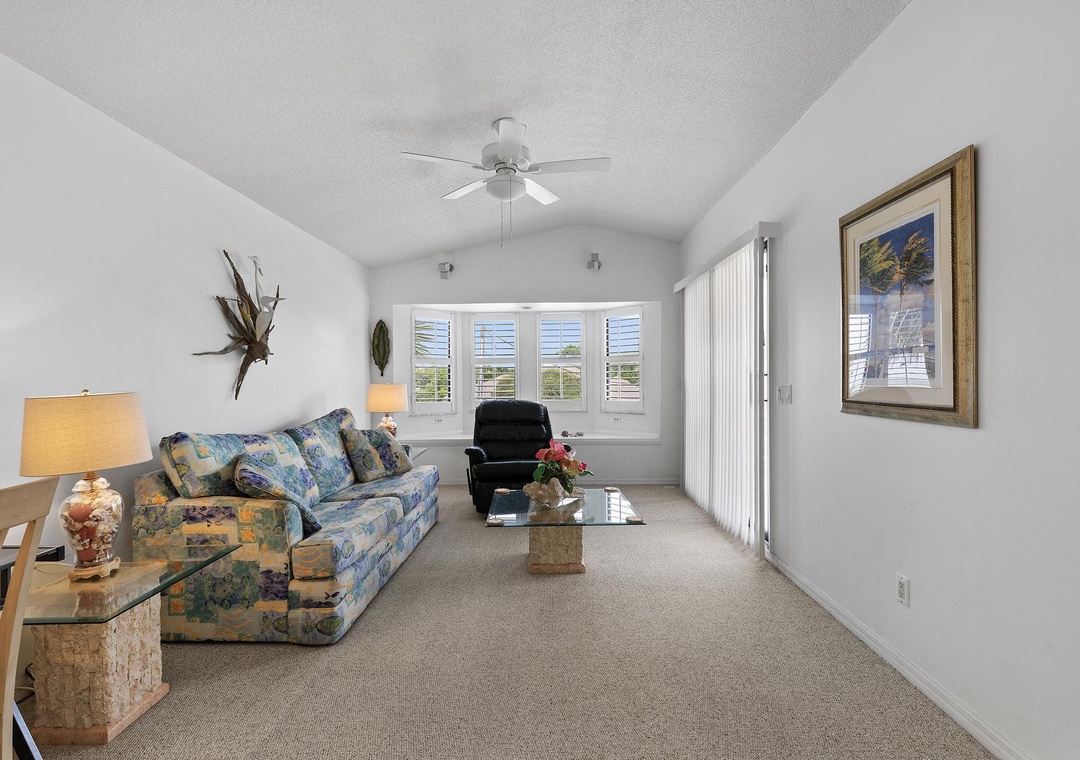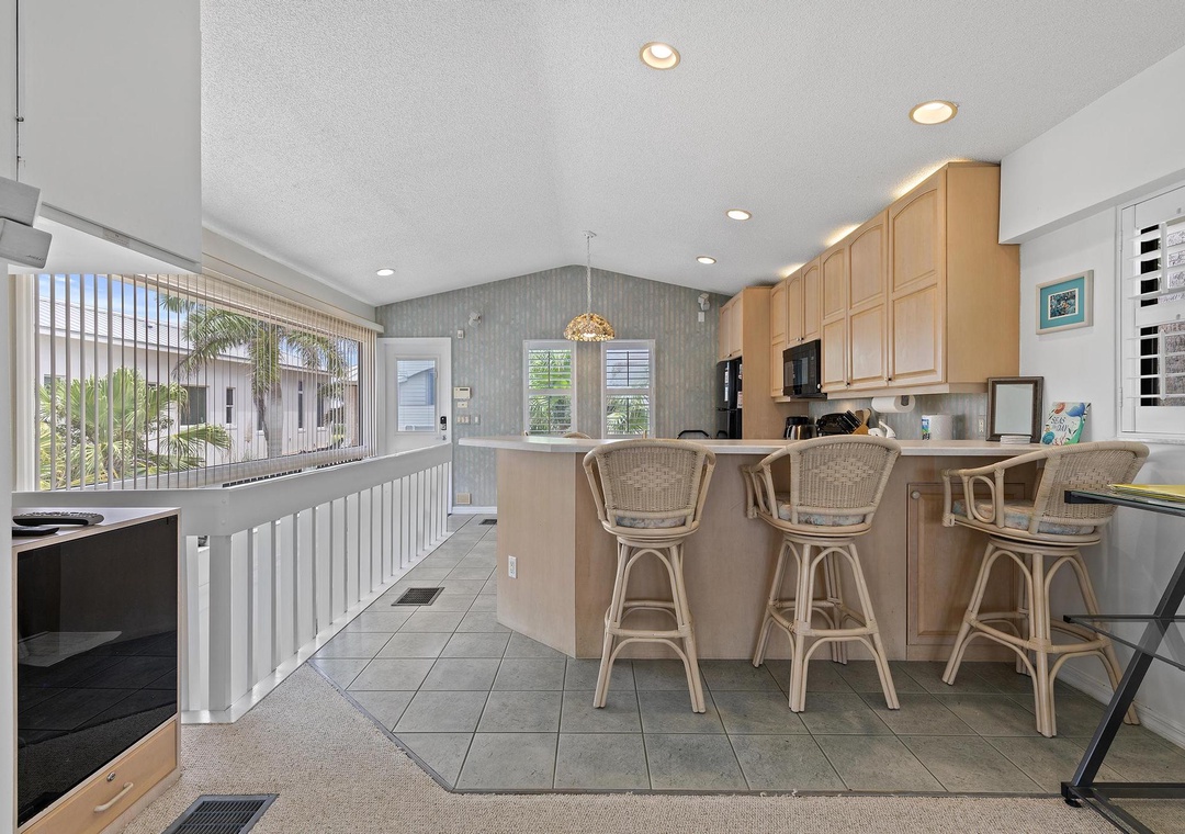 This well-maintained two-story guest house is surrounded by Florida palm trees, exotic flowers and landscape lighting. The living quarters are upstairs and include an open eat-in kitchen and bar with a large picture window, perfect for enjoying the view of the ocean and Florida sunshine. The kitchen is well-equipped with all the major appliances and a wide variety of cookware making you feel right at home. In the living room, you'll find comfortable furniture and an in-wall swiveled pull-out 36" Samsung smart HD tv equipped with Direct TV and a Yamaha cinematic receiver, inclusive with a Bose sound system. A furnished balcony offers a nice retreat for reading and relaxing.