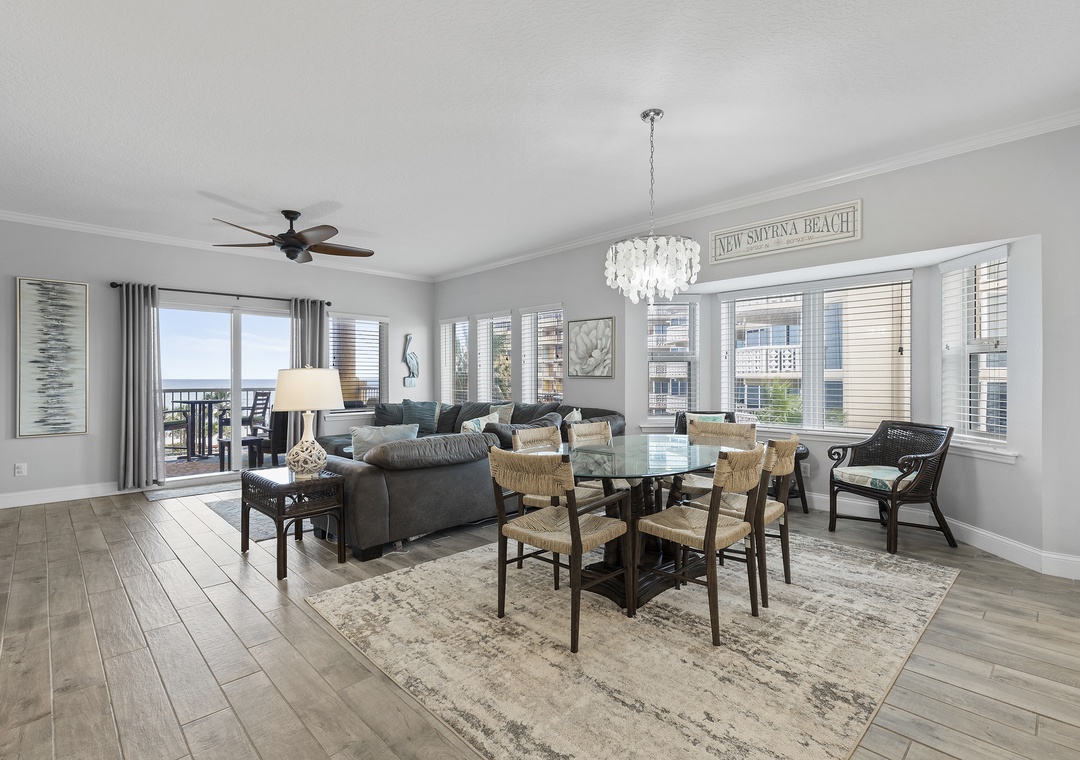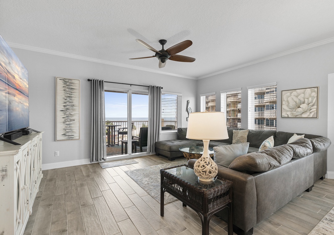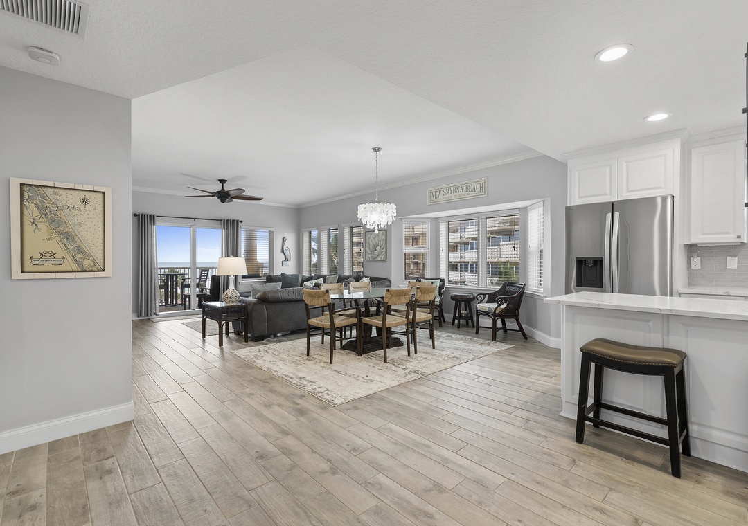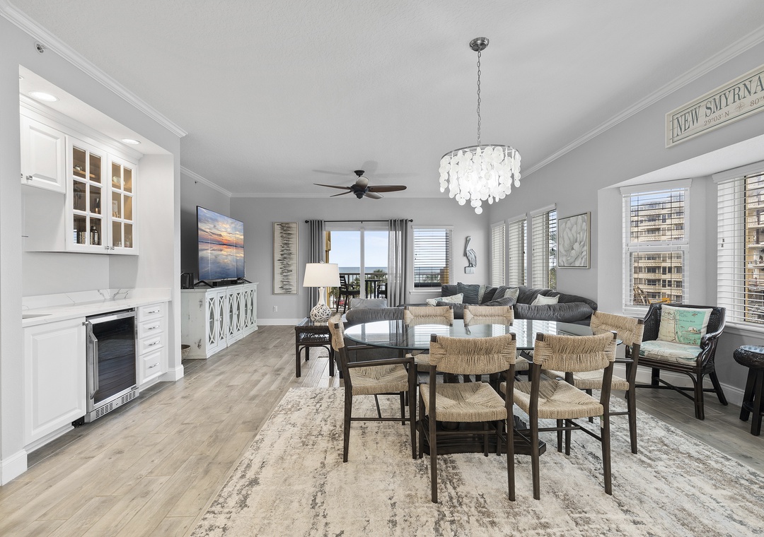 Atlantic Villas 303 is spacious, tranquil, and beautifully decorated! The moment you step into this three-bedroom, three-bath beauty you know it is going to be a vacation to remember. This high-end property comfortably sleeps 7 and has amazing views of the Atlantic Ocean. The main living space encompasses the living room, dining area, and gourmet kitchen, perfect for entertaining. A large leather sectional is nicely situated so you can enjoy watching a movie on the flat-screen TV or take in the ocean view through the large windows and sliding glass door. The condo boasts two private balconies that are beautifully furnished and offer an inviting space to stargaze. The dining area is part of this open floor plan and includes a wet bar with a wine cooler. The primary bedroom has a king bed and access to the balcony with breathtaking ocean views. The en-suite bathroom is complete with double sinks and walk-in shower, Guest bedroom 1 has a queen bed and guest bedroom 2 has twin/full bunk beds. Come see why the fun never stops at Atlantic Villas 303!