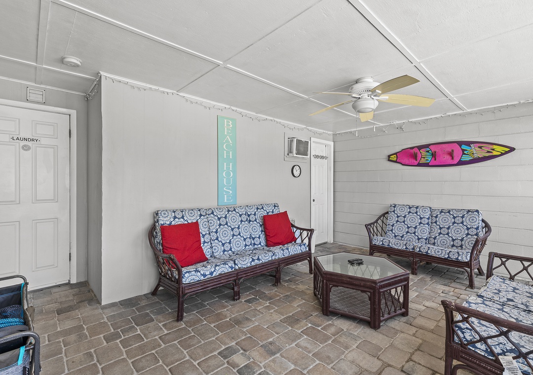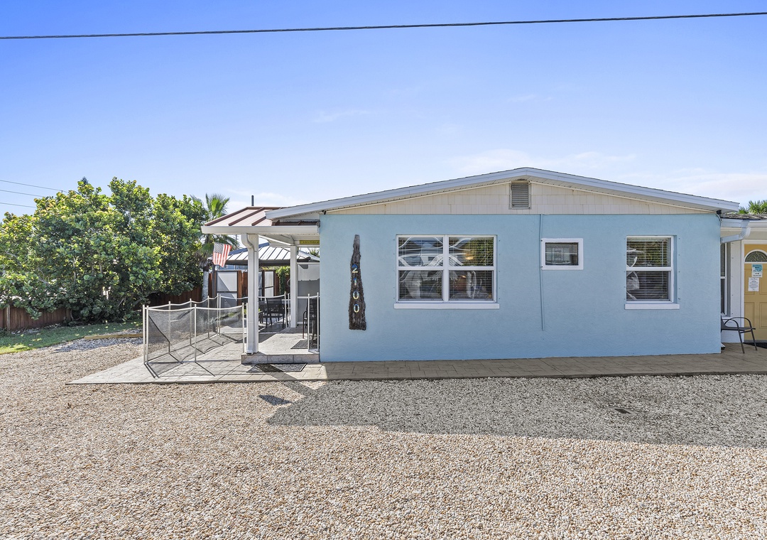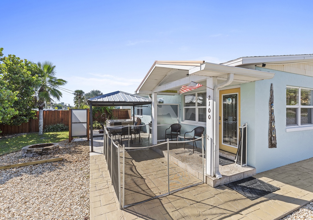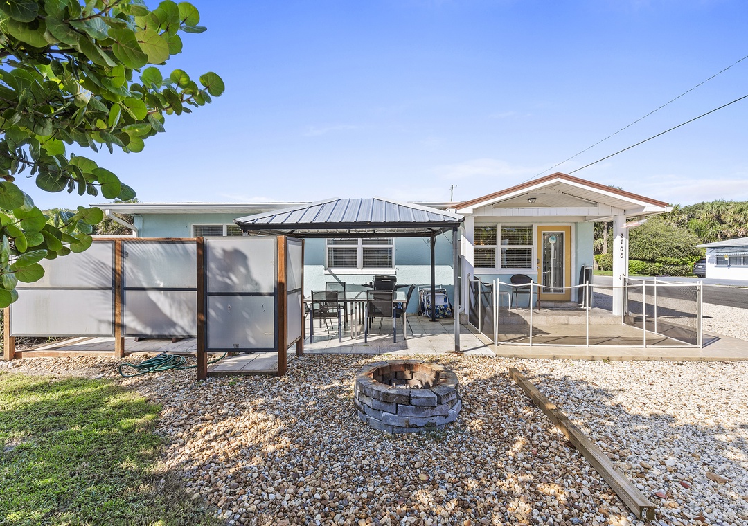 Beachside Oasis is the largest unit of the Grand Oasis triplex, located directly across from the beach. This renovated, three-bedroom, one-bath retreat comfortably sleeps six and offers outdoor amenities like a fire pit, covered patio, hot tub, outdoor shower, and a communal screened-in porch. It’s perfect for a beach getaway and can be rented individually or combined with the Poolside Oasis for larger groups. The triplex offers six bedrooms, three bathrooms, private entrances, and ample parking, all within walking distance of grocery stores, the beach, and restaurants.