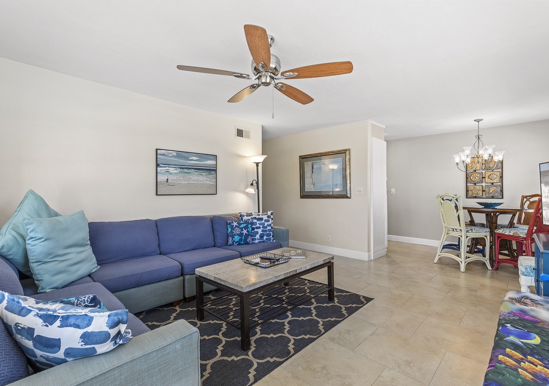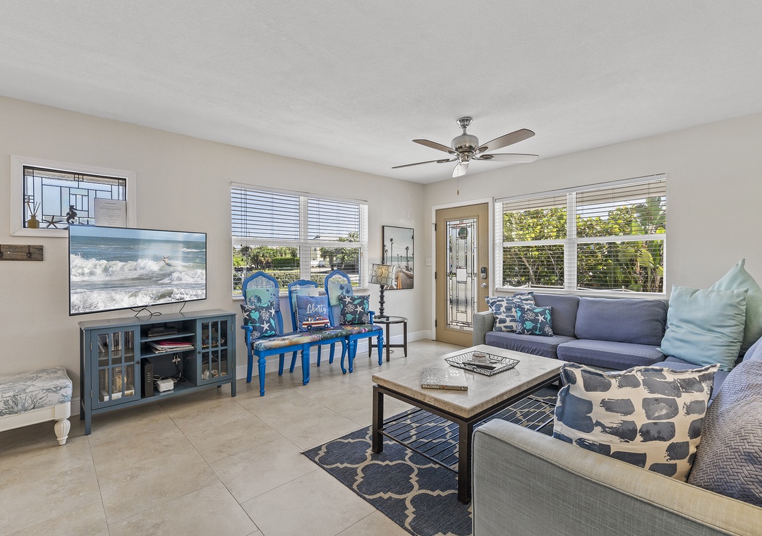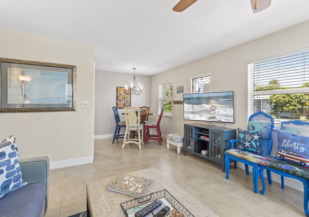 Inside, the bright living space includes a cozy sectional, dining area, and a modern galley kitchen with granite countertops and updated appliances. The primary bedroom has a queen bed and flat-screen TV, while the second bedroom features another queen bed, and the third has two twin beds. All bedrooms share an updated bathroom with a bathtub, shower, and ample towels. Additional perks include a washer and dryer, free Wi-Fi, cable TV, beach towels, and more for a convenient and comfortable stay.