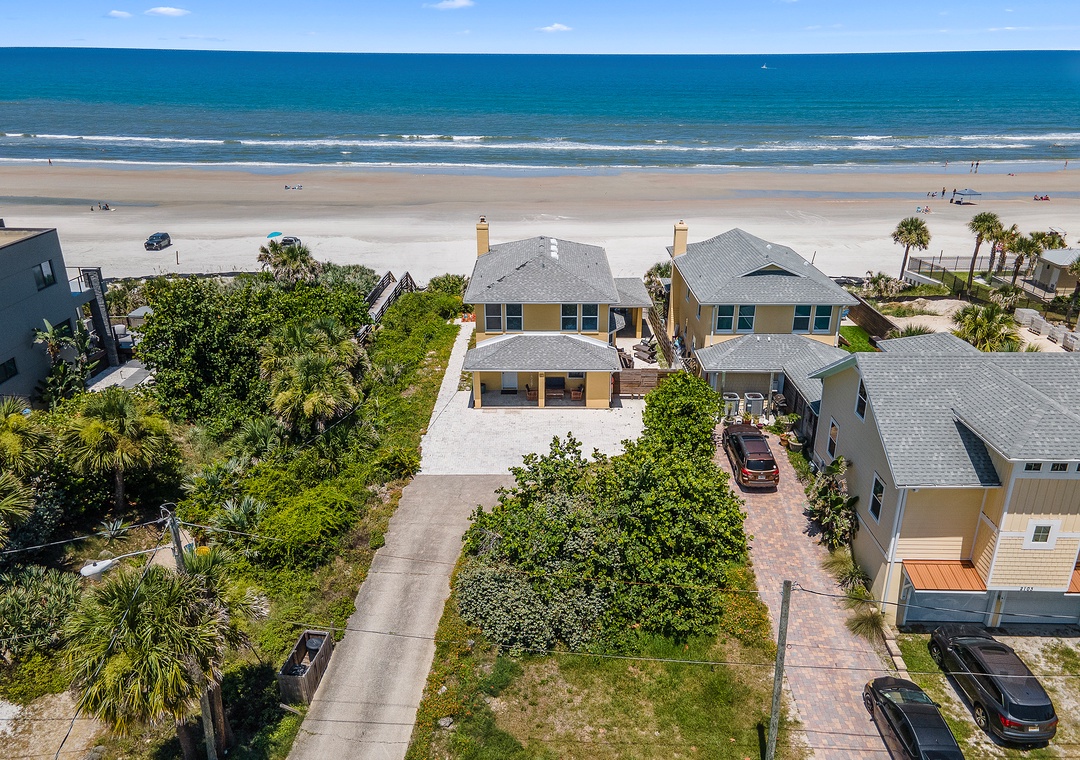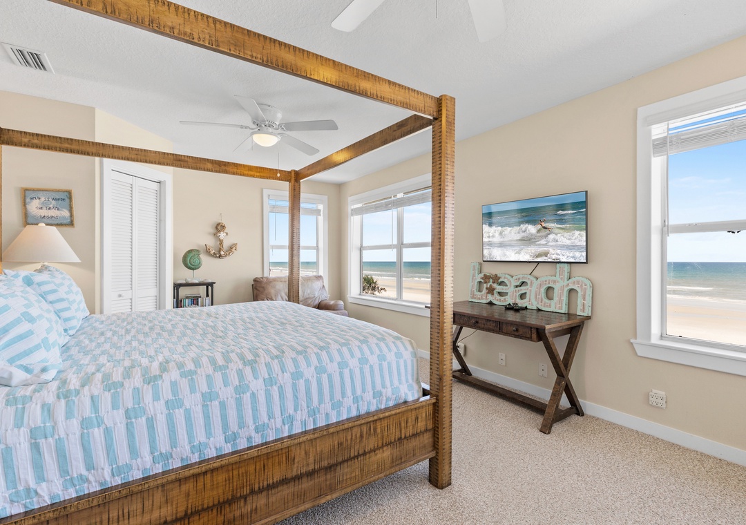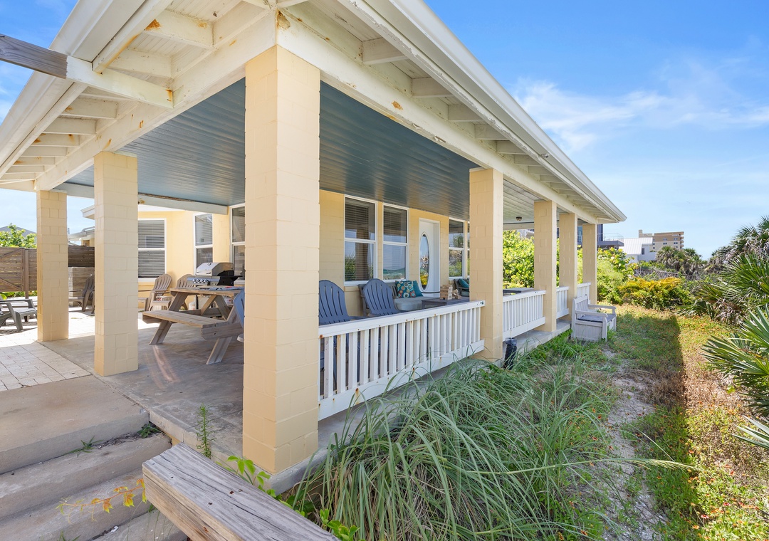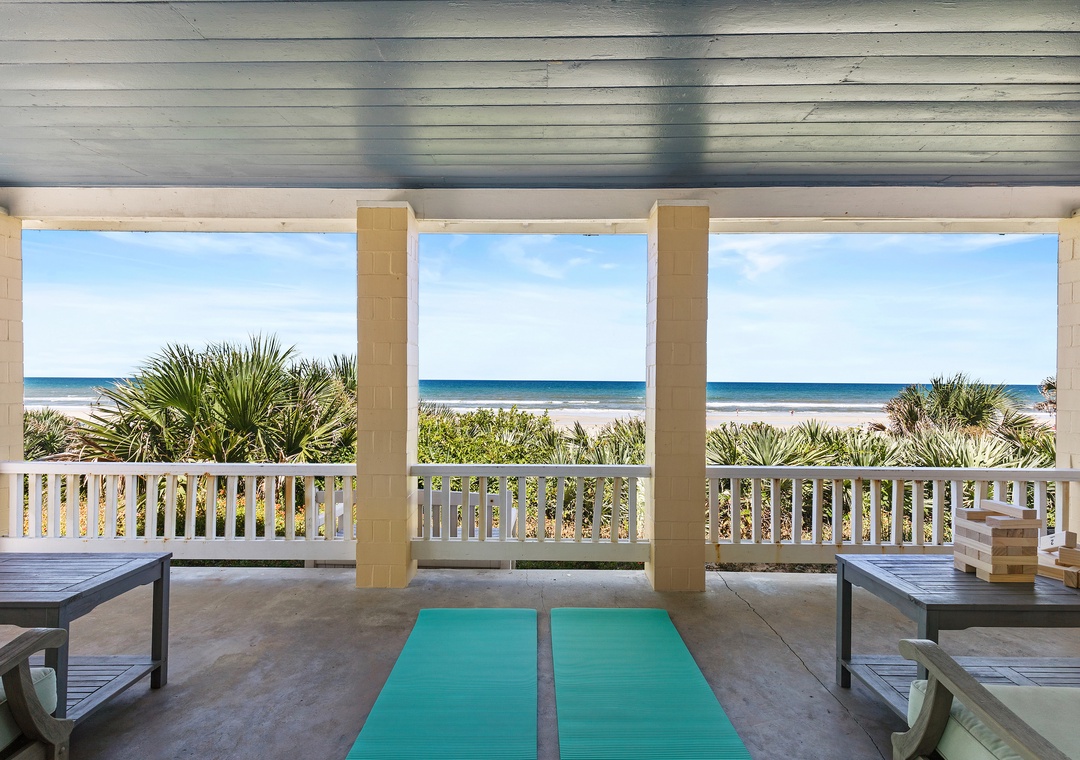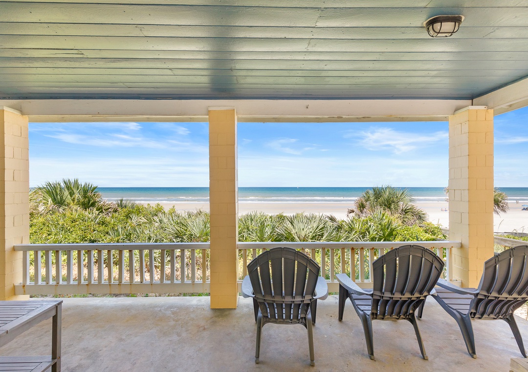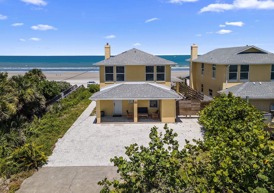 Beachside Vista offers lush landscapes and breathtaking ocean views, providing a beachside retreat in New Smyrna Beach. This two-story, 4-bedroom, 3-bathroom oceanfront home accommodates up to 10 guests, offering the perfect setting for a family or group getaway. The fully stocked galley kitchen on the first floor is bright and inviting, with ample counter space and views of palm trees. Enjoy meals in the open concept dining room while taking in panoramic Atlantic views, or relax in the huge living room, featuring plush sectional seating, and a flat-screen TV, with French doors leading to the 1st floor primary bedroom suite with a queen bed and private bathroom, all with stunning views of the ocean. Step out onto the spacious veranda to enjoy morning coffee or stargazing by the sea.