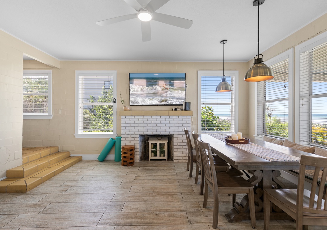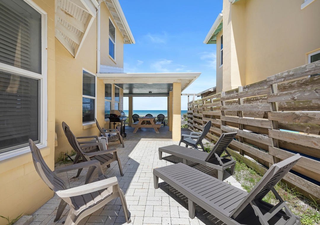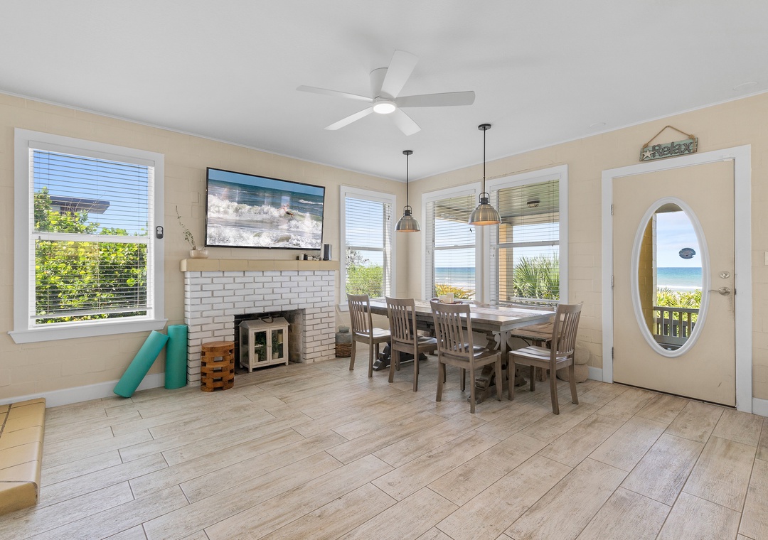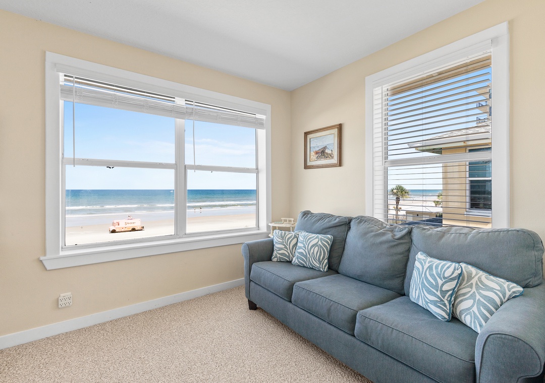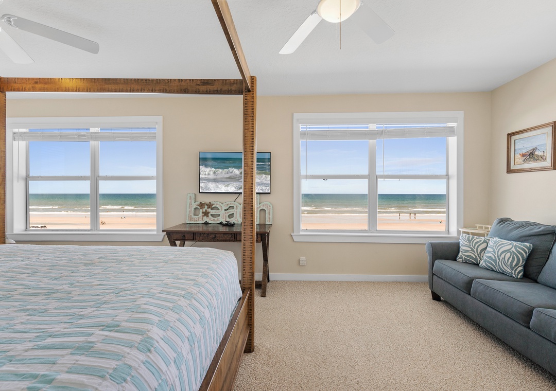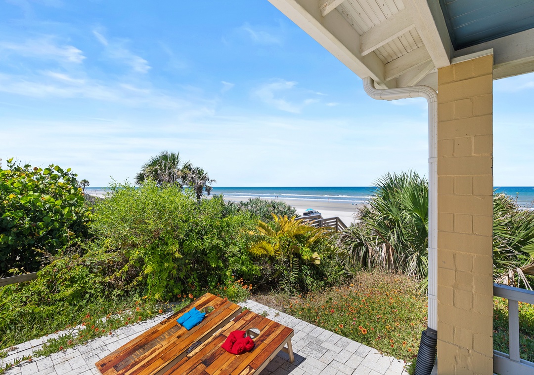 Beachside Vista offers lush landscapes and breathtaking ocean views, providing a beachside retreat in New Smyrna Beach. This two-story, 4-bedroom, 3-bathroom oceanfront home accommodates up to 10 guests, offering the perfect setting for a family or group getaway. The fully stocked galley kitchen on the first floor is bright and inviting, with ample counter space and views of palm trees. Enjoy meals in the open concept dining room while taking in panoramic Atlantic views, or relax in the huge living room, featuring plush sectional seating, and a flat-screen TV, with French doors leading to the 1st floor primary bedroom suite with a queen bed and private bathroom, all with stunning views of the ocean. Step out onto the spacious veranda to enjoy morning coffee or stargazing by the sea.