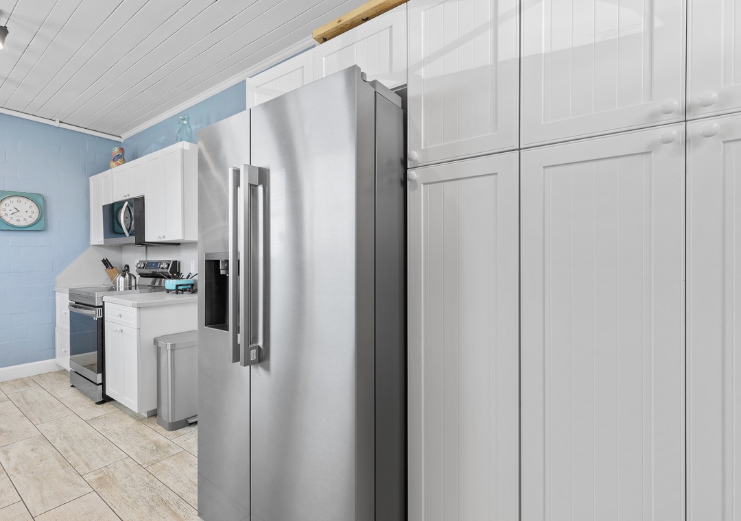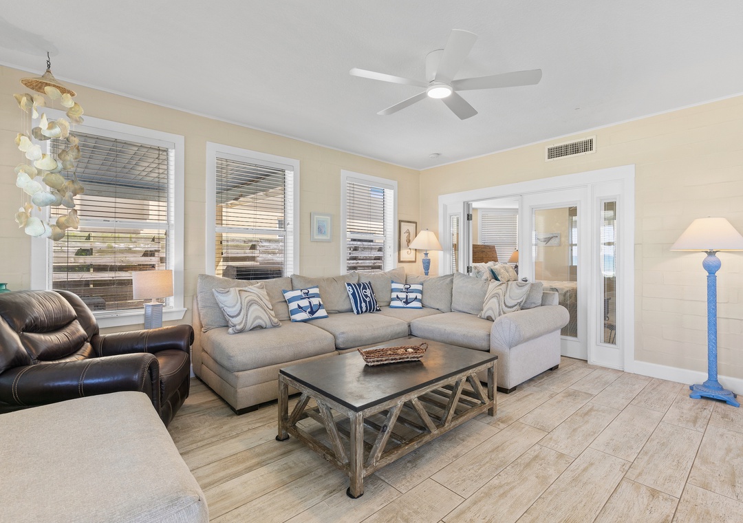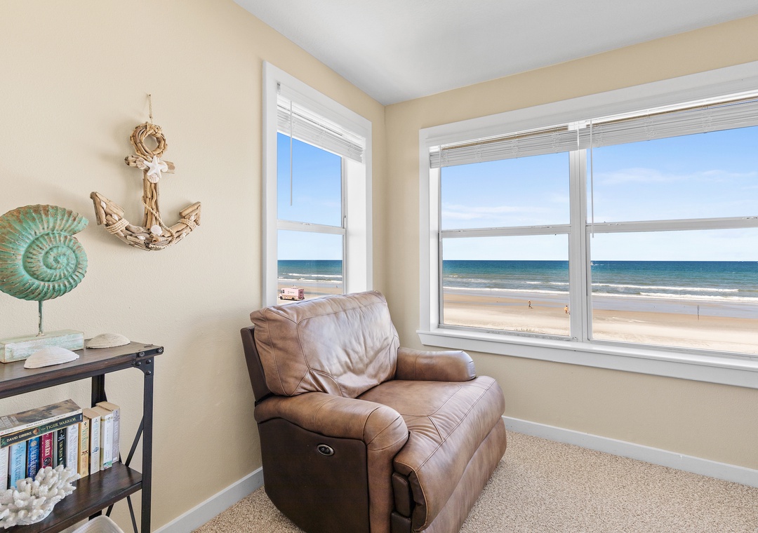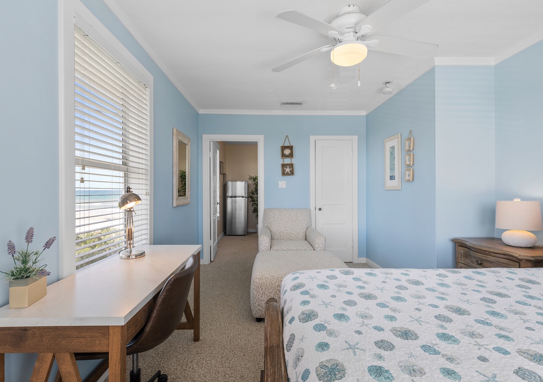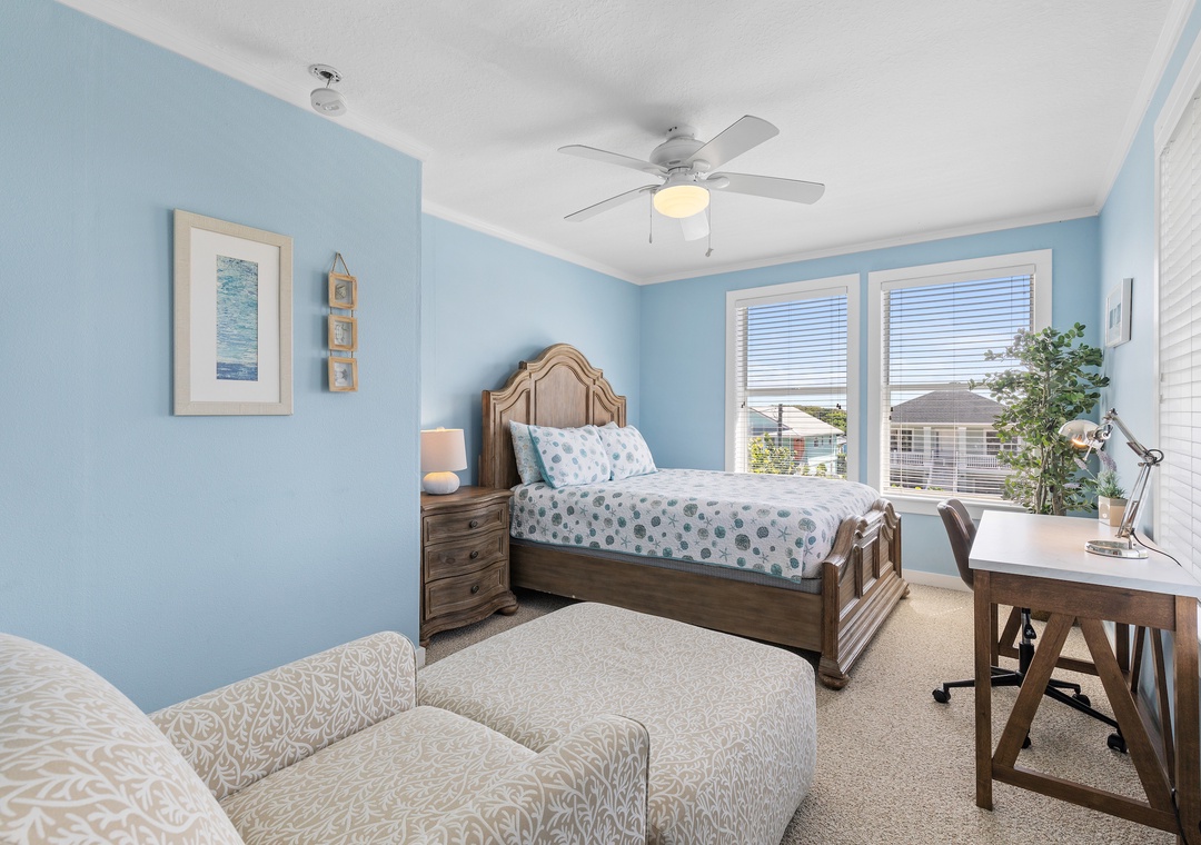 Upstairs, the comfy beach house vibe continues with the ocean facing 2nd floor primary master suite, featuring a king bed, seating area, flat-screen TV and ensuite bathroom. The third bedroom offers a queen bed with soothing blue décor, while the fourth bedroom has two full beds. A third full bathroom completes the upstairs. Each room is thoughtfully designed for comfort, and the home provides high-speed internet access and workspaces for remote work. Pets are welcome, and the property boasts ample parking, making it an ideal beach escape. Recently renovated and tastefully furnished, Beachside Vista promises a relaxing and unforgettable coastal vacation.