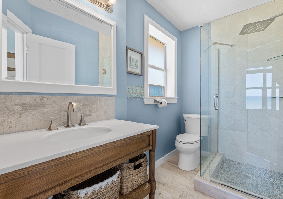Beautiful view of the ocean! Great location, private, plenty of seating on the porch where we enjoyed listening to and watching the waves throughout the day. Ocean breeze made it pleasant to be outside. Beautiful beach and great waves for body surfing. Upstairs bathrooms were tight and stairs in/out of kitchen was awkward. Plenty of room otherwise; high quality furnishings, kitchen well-stocked with pot, pans, plates, utensils, etc. Highly recommend!- Reviewed On: 7/14/2021