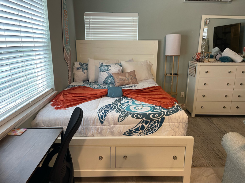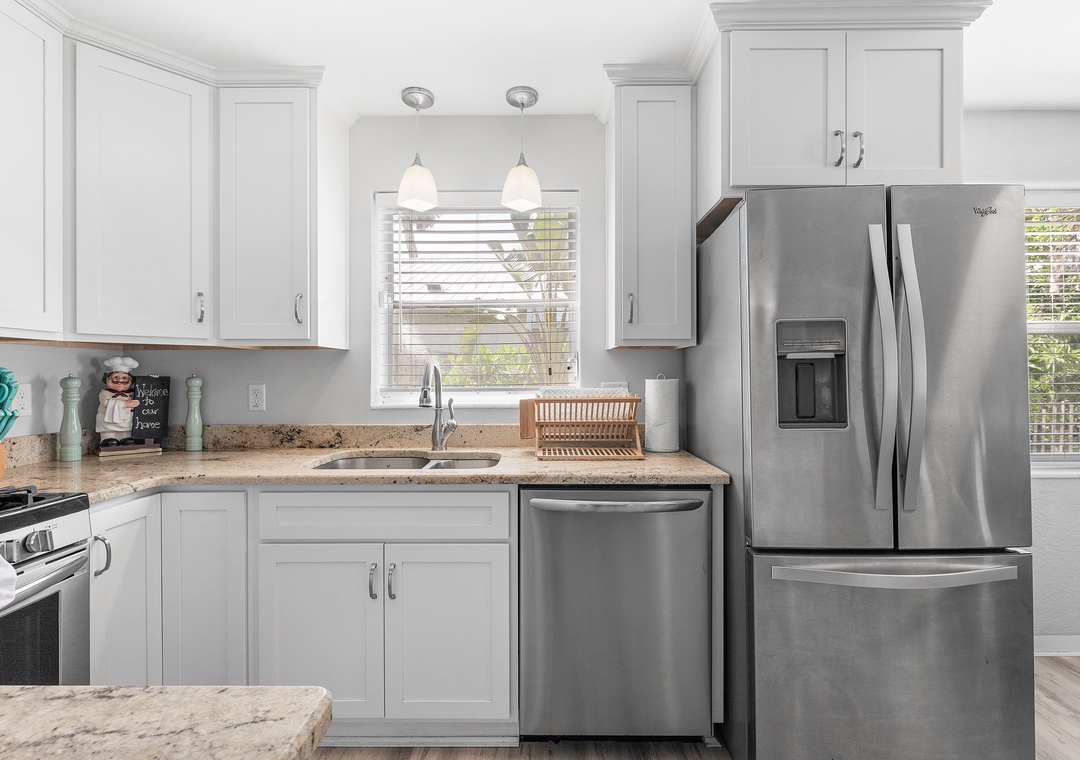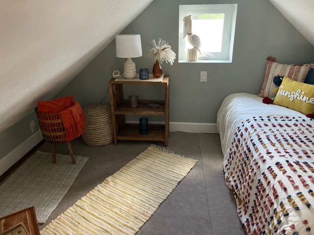 The main cottage features two cozy bedrooms (queen in the primary, full in the guest), while the guest house in the back includes its own private bedroom, a loft with an additional bed, a kitchenette with full size fridge, and a comfortable living space — perfect for visitors or those who want a little extra privacy.