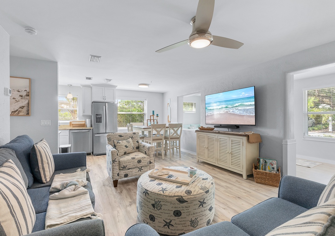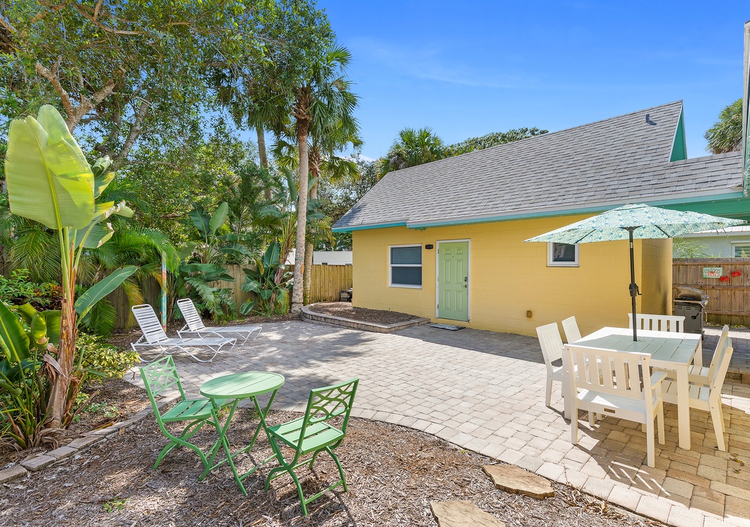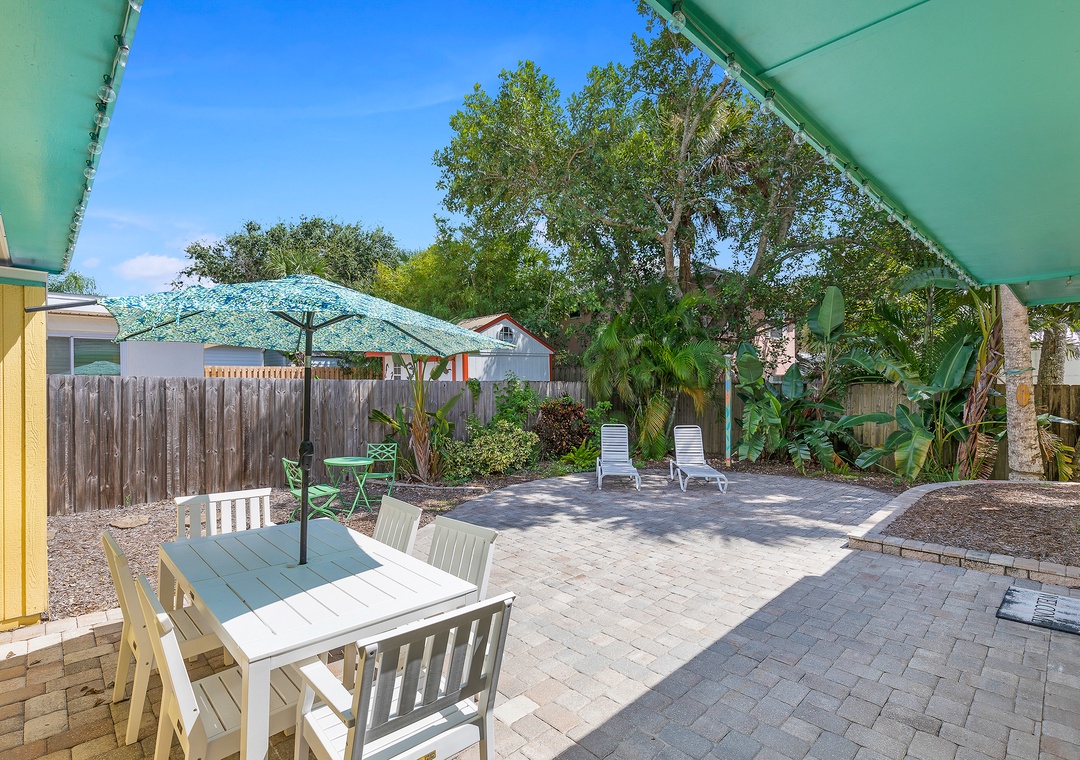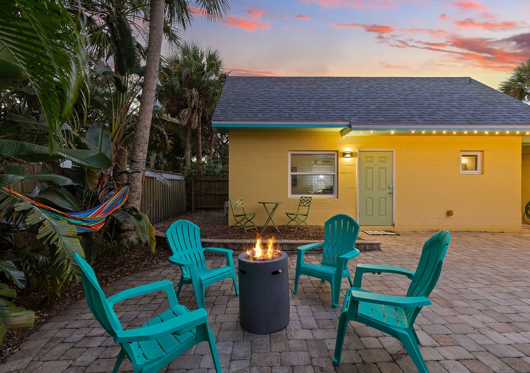 Step outside into a private courtyard-style backyard, fully paved for a clean, low-maintenance feel, yet surrounded by lush tropical landscaping along the privacy fence — creating a serene and secluded atmosphere. Twinkling string lights hang around the roof and accent the hammock, firepit with Adirondack chairs, loungers, a dining table, and a grill, offering a perfect space to relax or entertain. A refreshing outdoor shower is also available after your beach days. For even more fun and convenience, the home comes with 5 bikes and beach chairs, making it easy to explore and enjoy everything this charming coastal town has to offer.