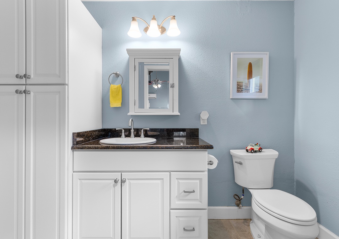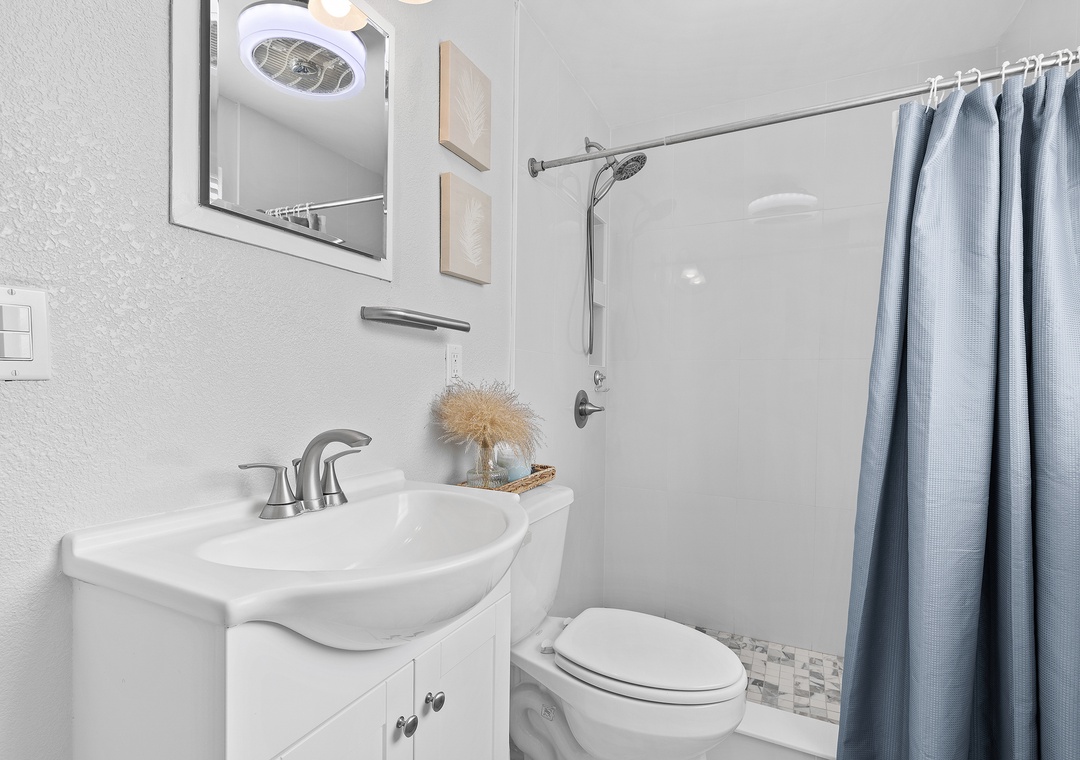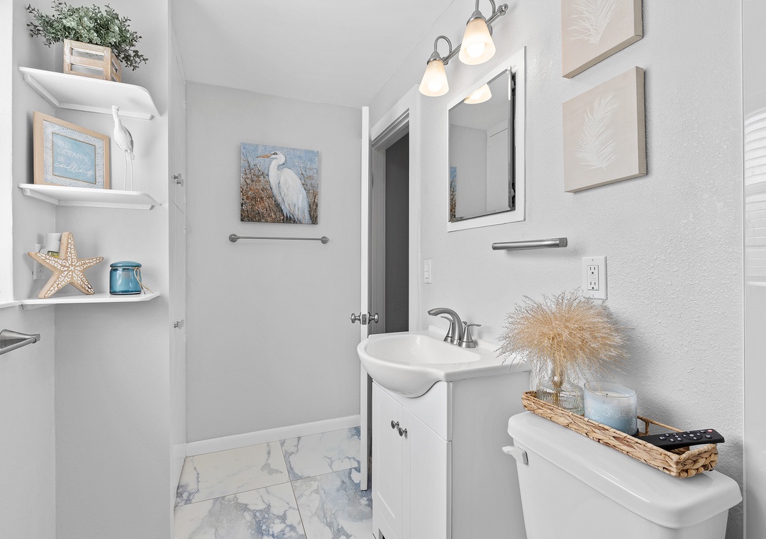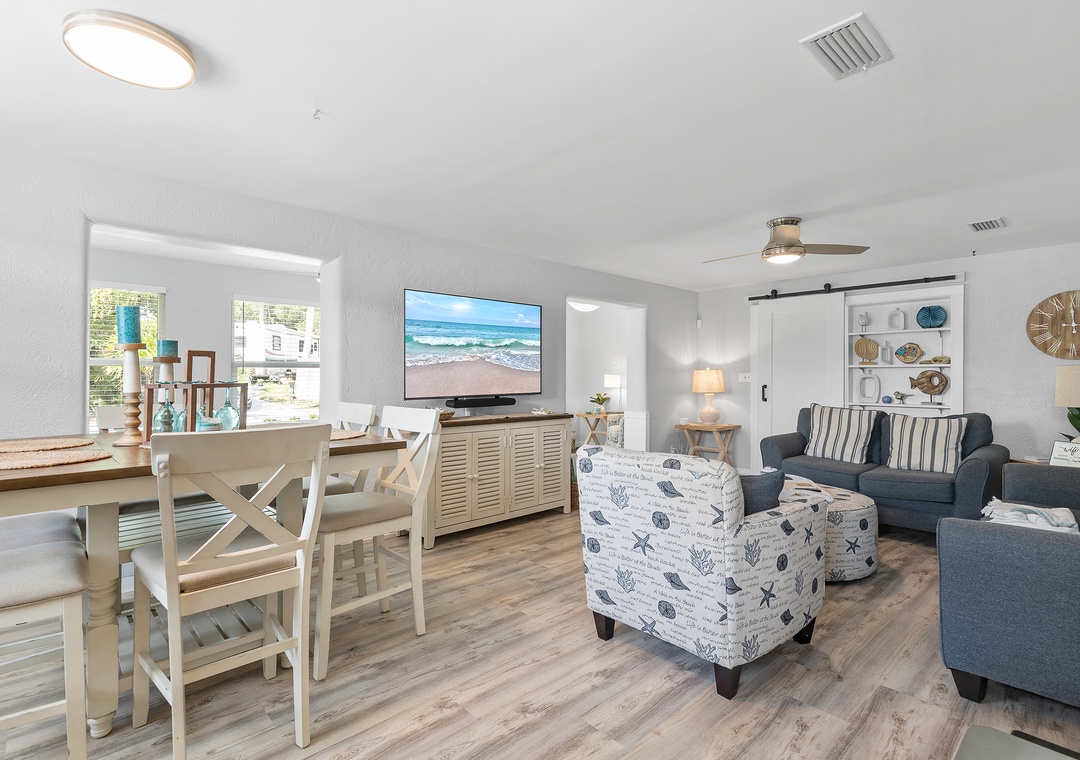 Step outside into a private courtyard-style backyard, fully paved for a clean, low-maintenance feel, yet surrounded by lush tropical landscaping along the privacy fence — creating a serene and secluded atmosphere. Twinkling string lights hang around the roof and accent the hammock, firepit with Adirondack chairs, loungers, a dining table, and a grill, offering a perfect space to relax or entertain. A refreshing outdoor shower is also available after your beach days. For even more fun and convenience, the home comes with 5 bikes and beach chairs, making it easy to explore and enjoy everything this charming coastal town has to offer.