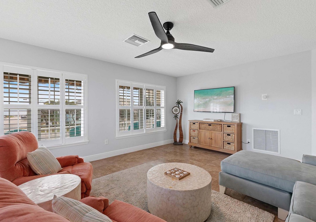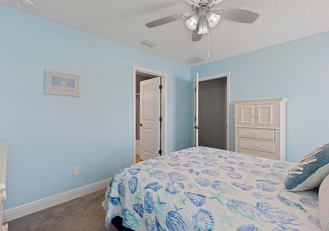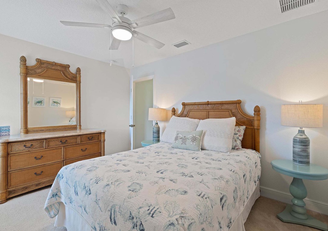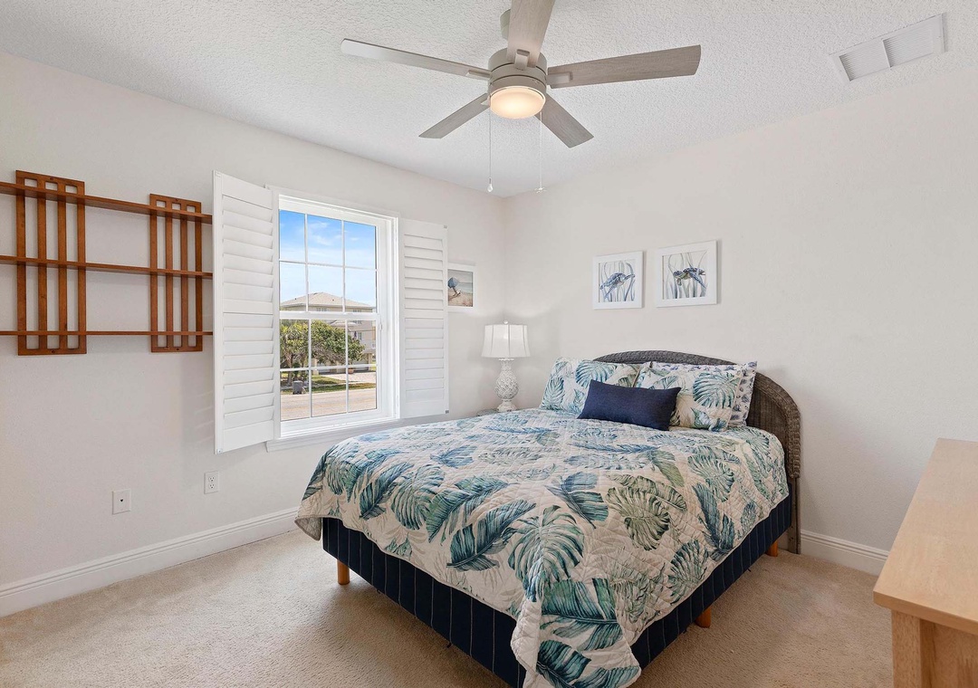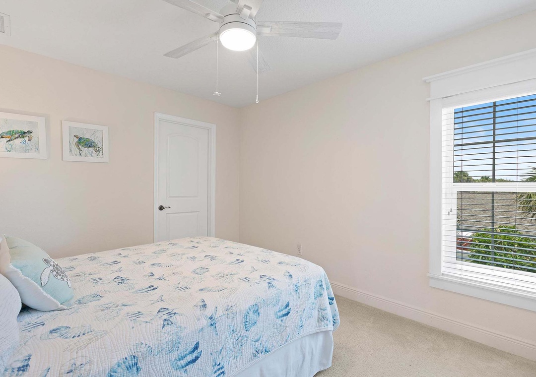 Upstairs, you’ll find four spacious bedrooms, including a primary king ensuite with a walk-in closet and private bath, and a queen ensuite with a hallway-accessible tub/shower combo. Two additional queen bedrooms and ocean-view family room, with balcony access and seating, round out the upper level. Every bedroom, the upstairs family room, and the outdoor dining area include ceiling fans for added comfort. Casa Honu is pet-friendly for one dog under 50 lbs (fees apply) and is within walking distance to local favorites like Izzy’s Island Tacos, Mi Mexico, and Dollar General Market. Thoughtful touches such as starter toiletries, paper goods, snacks, and coffee pods are provided to help jumpstart a stress-free stay.