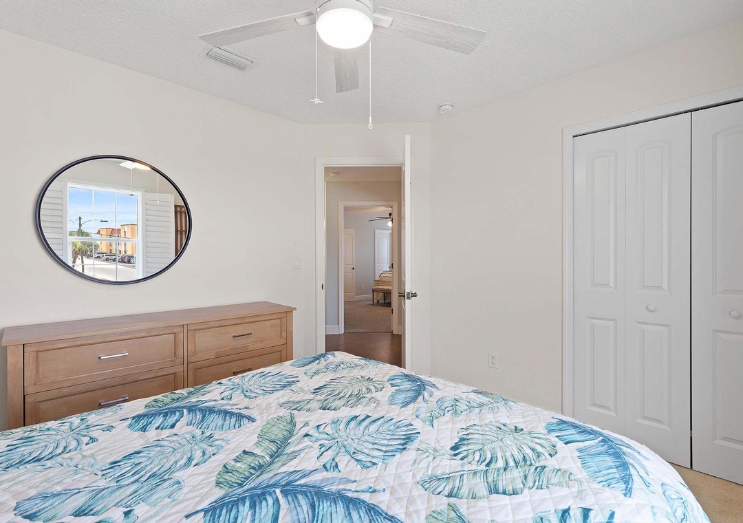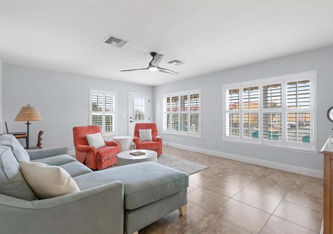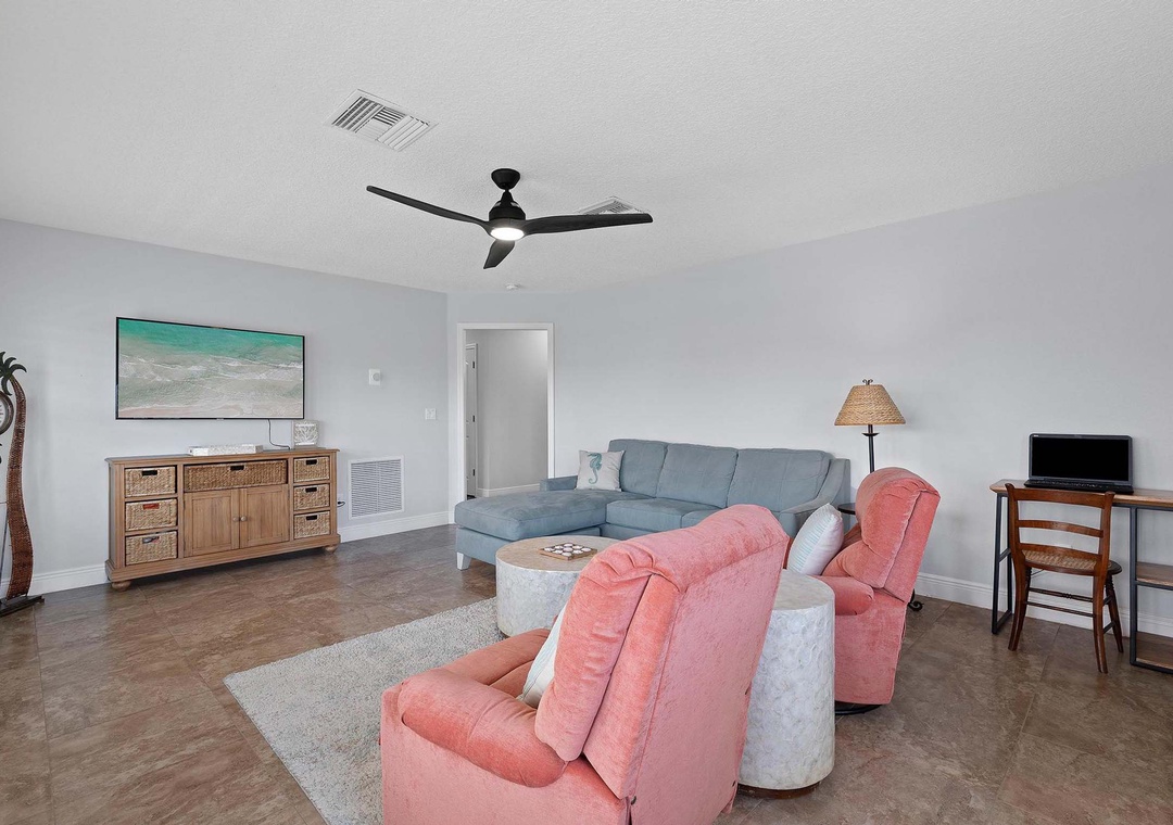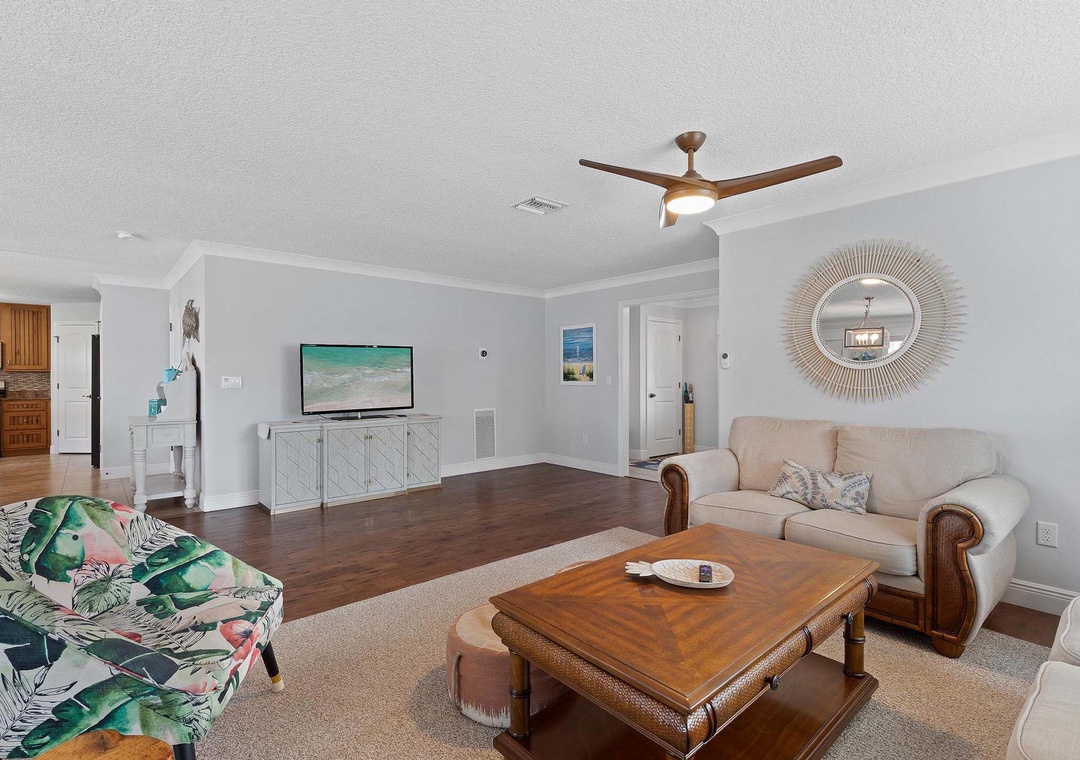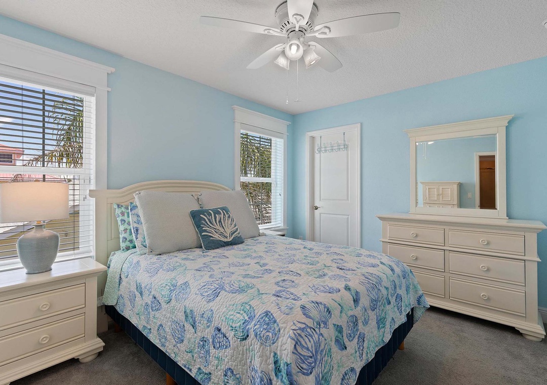 Upstairs, you’ll find four spacious bedrooms, including a primary king ensuite with a walk-in closet and private bath, and a queen ensuite with a hallway-accessible tub/shower combo. Two additional queen bedrooms and ocean-view family room, with balcony access and seating, round out the upper level. Every bedroom, the upstairs family room, and the outdoor dining area include ceiling fans for added comfort. Casa Honu is pet-friendly for one dog under 50 lbs (fees apply) and is within walking distance to local favorites like Izzy’s Island Tacos, Mi Mexico, and Dollar General Market. Thoughtful touches such as starter toiletries, paper goods, snacks, and coffee pods are provided to help jumpstart a stress-free stay.