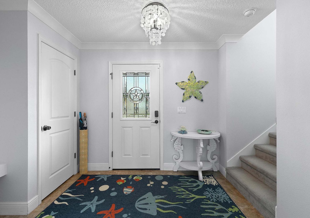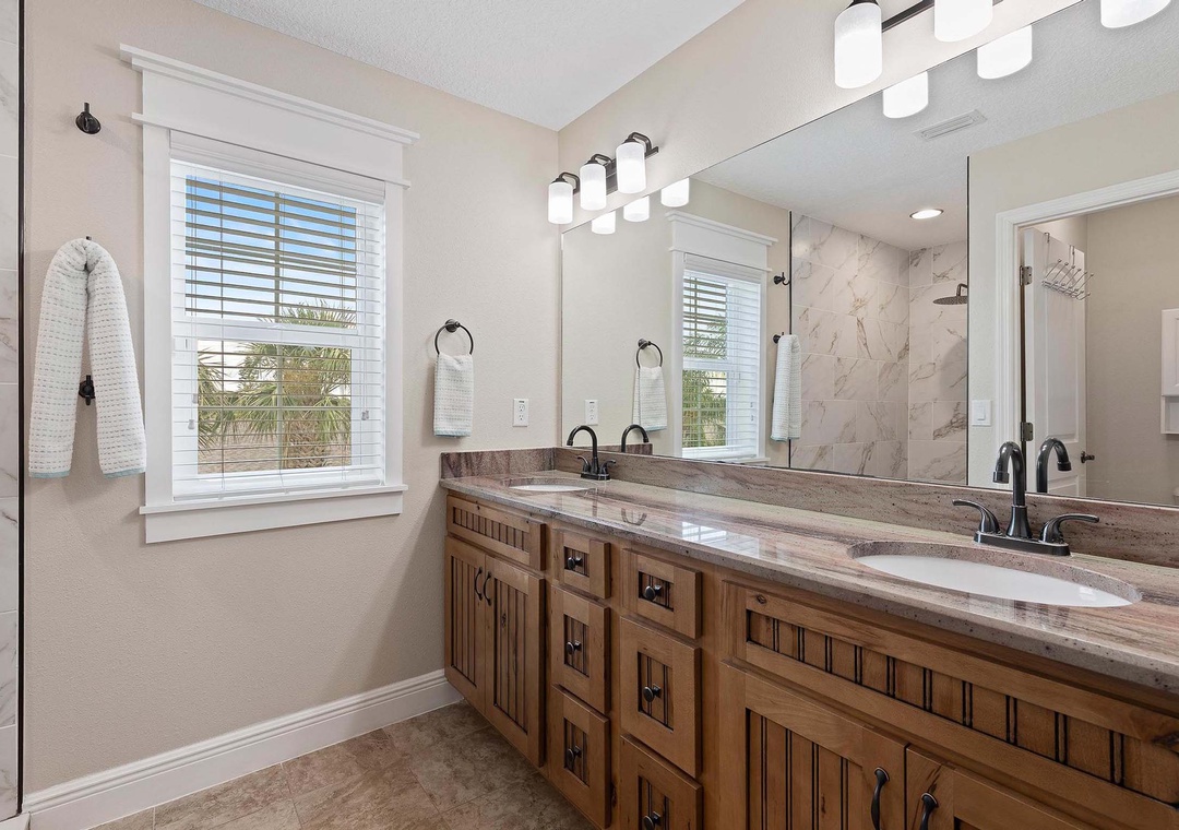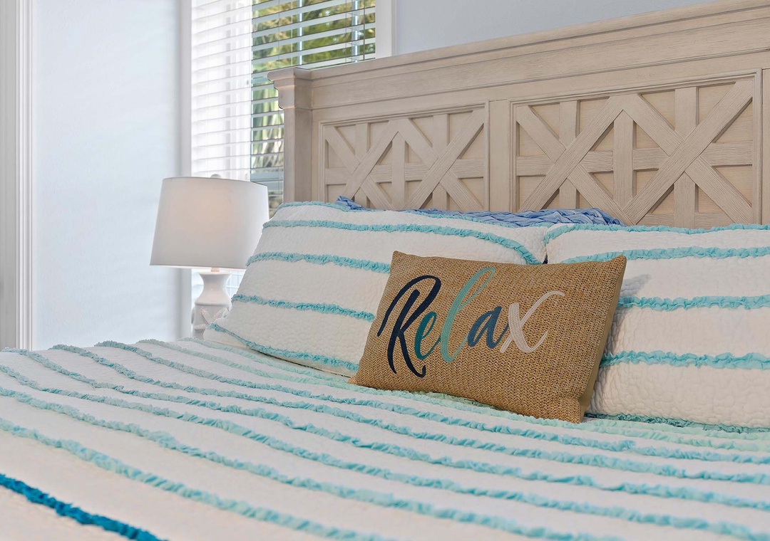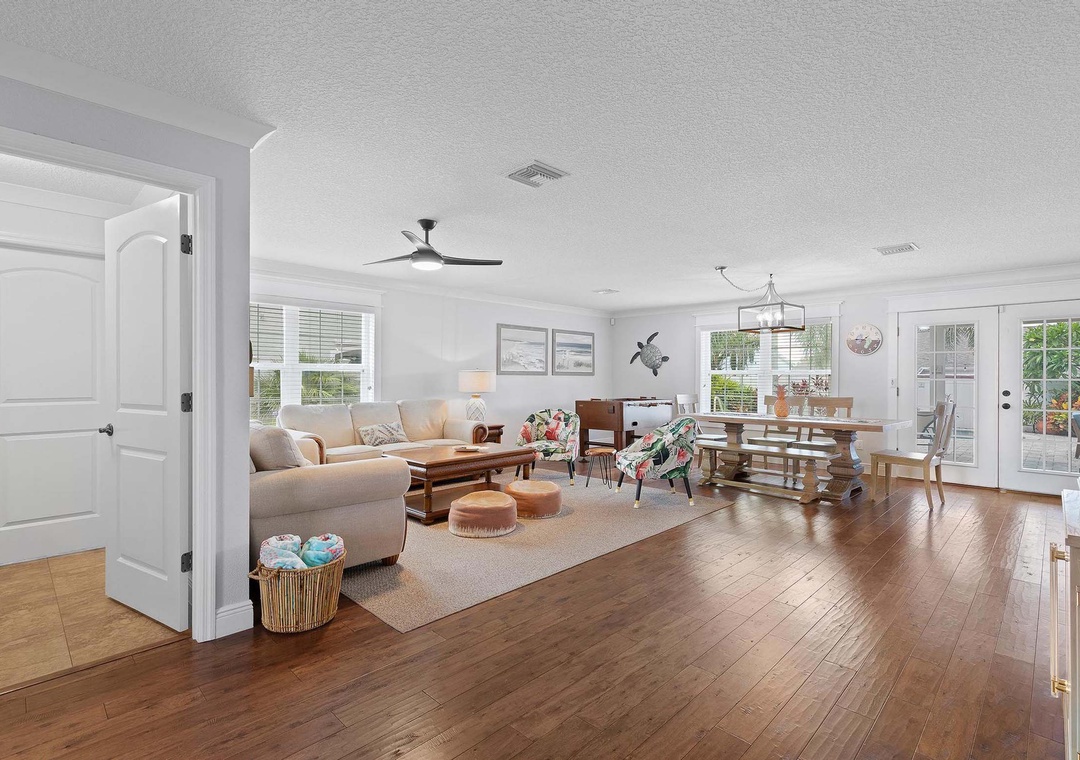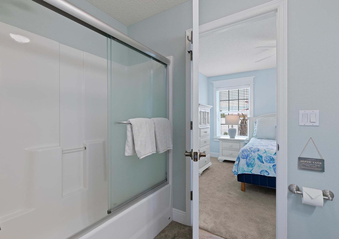 Upstairs, you’ll find four spacious bedrooms, including a primary king ensuite with a walk-in closet and private bath, and a queen ensuite with a hallway-accessible tub/shower combo. Two additional queen bedrooms and ocean-view family room, with balcony access and seating, round out the upper level. Every bedroom, the upstairs family room, and the outdoor dining area include ceiling fans for added comfort. Casa Honu is pet-friendly for one dog under 50 lbs (fees apply) and is within walking distance to local favorites like Izzy’s Island Tacos, Mi Mexico, and Dollar General Market. Thoughtful touches such as starter toiletries, paper goods, snacks, and coffee pods are provided to help jumpstart a stress-free stay.