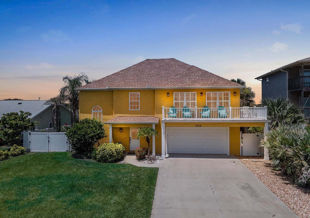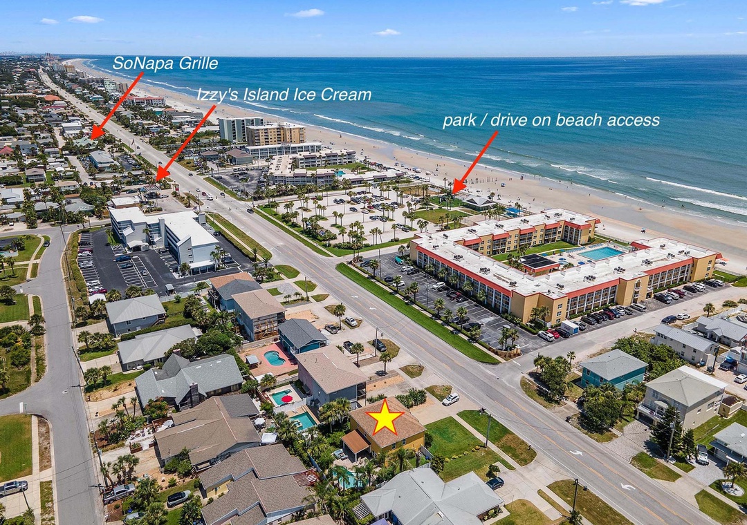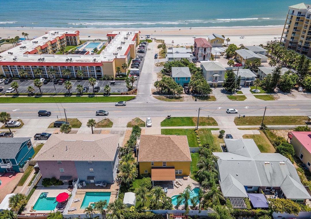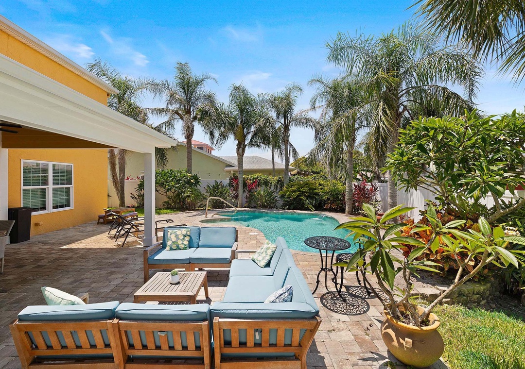Welcome to Casa Honu, your ultimate beach retreat directly across from the 29th Ave public beach access in New Smyrna Beach. This thoughtfully designed coastal home offers ocean views, a private heated pool, and a lush backyard oasis complete with tropical landscaping, outdoor dining, loungers, and a grill. French doors from the main living area open to this inviting space, perfect for relaxing after a day in the sun. The main level features an open-concept kitchen, dining, and living area with ceiling fans throughout, plus a convenient half bath. The garage houses beach gear, toys, and bicycles for guest use, as well as two washers and a dryer. Rinse off in the outdoor shower with hot and cold water after enjoying the beach, then head up to the east-facing balcony for a gorgeous Atlantic sunrise.