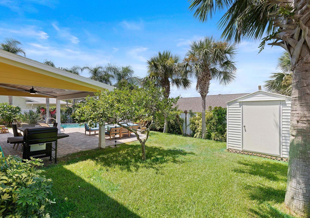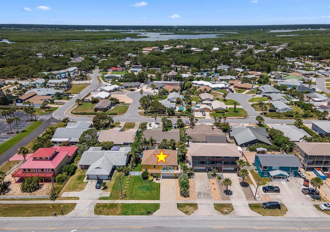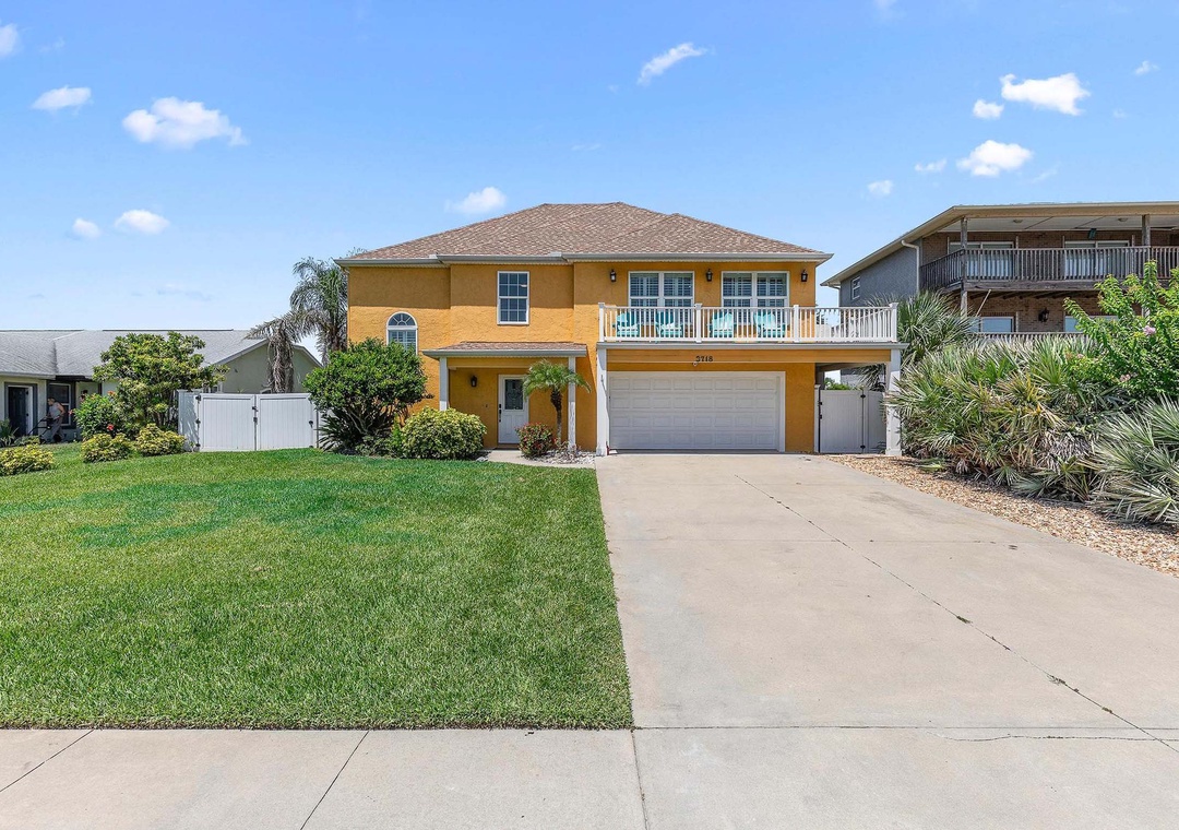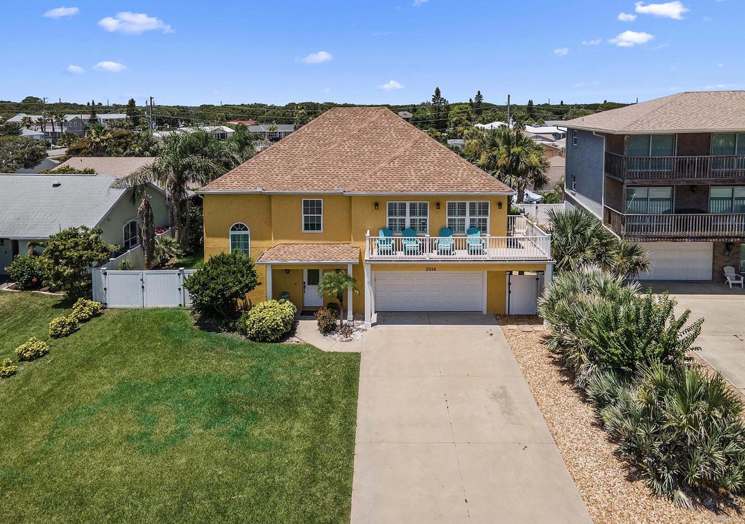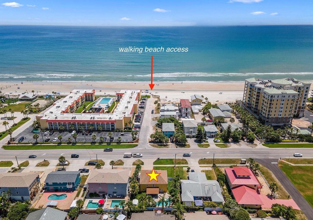 Welcome to Casa Honu, your ultimate beach retreat directly across from the 29th Ave public beach access in New Smyrna Beach. This thoughtfully designed coastal home offers ocean views, a private heated pool, and a lush backyard oasis complete with tropical landscaping, outdoor dining, loungers, and a grill. French doors from the main living area open to this inviting space, perfect for relaxing after a day in the sun. The main level features an open-concept kitchen, dining, and living area with ceiling fans throughout, plus a convenient half bath. The garage houses beach gear, toys, and bicycles for guest use, as well as two washers and a dryer. Rinse off in the outdoor shower with hot and cold water after enjoying the beach, then head up to the east-facing balcony for a gorgeous Atlantic sunrise.