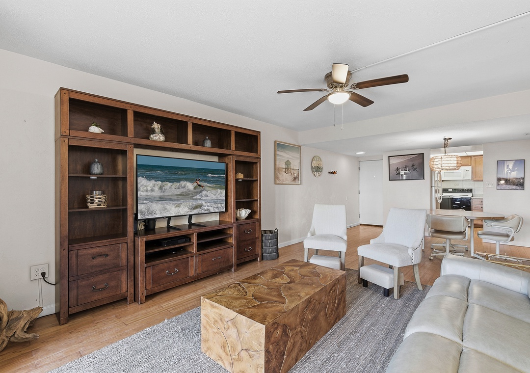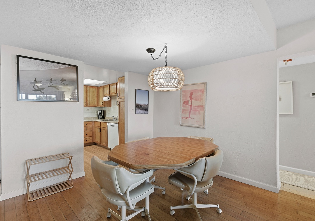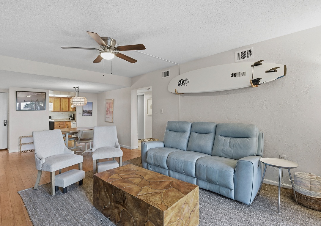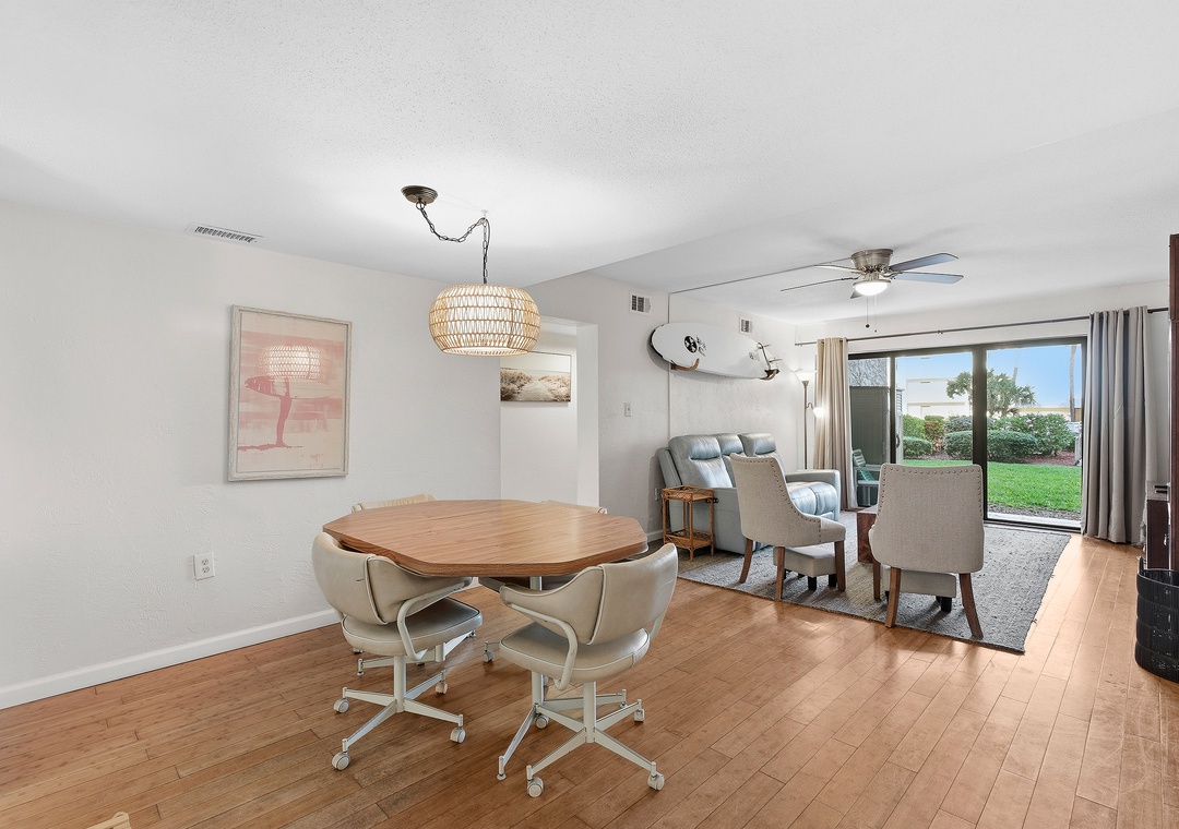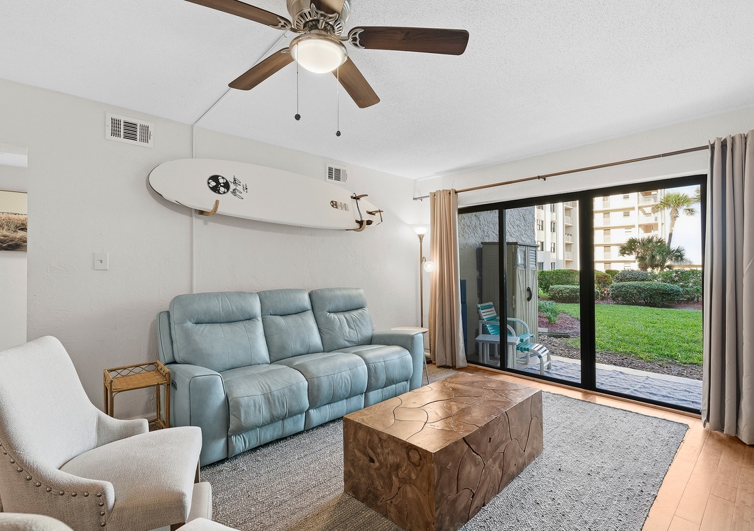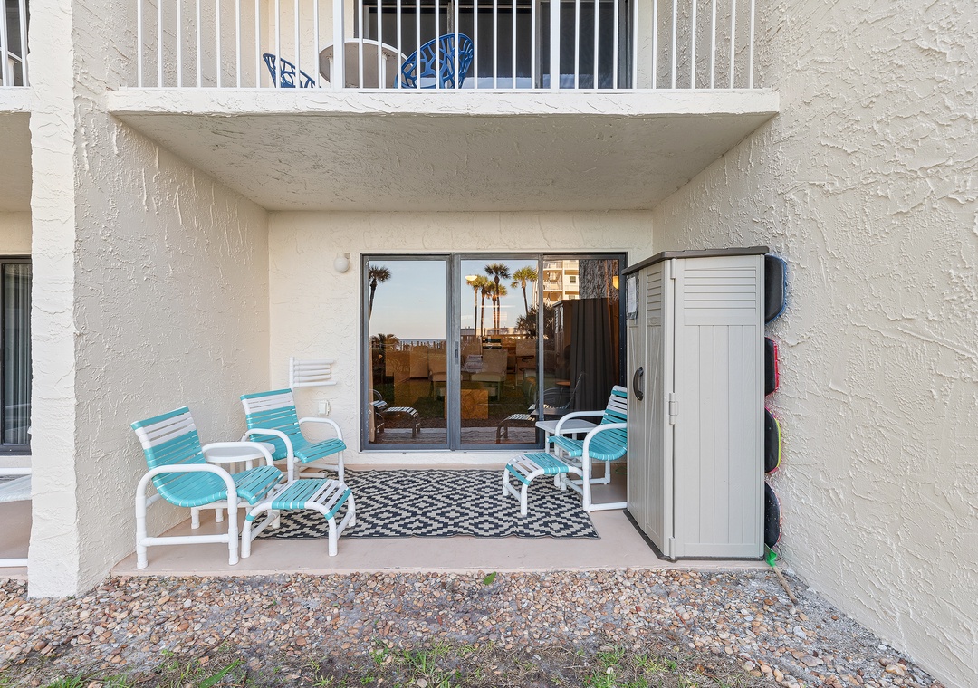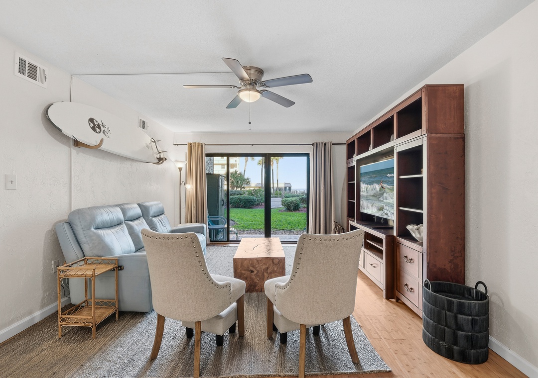 Welcome to your effortless beach escape! This convenient ground-floor 2-bedroom, 2-bath unit offers a relaxed, coastal vibe with all the comforts of home—perfect for families, couples, or anyone craving a peaceful getaway. The primary bedroom features a king bed with an ensuite bathroom, while the guest bedroom includes a twin/double bunk bed with a trundle plus an additional twin bed, allowing the unit to comfortably sleep up to seven guests. Inside, you’ll find a cozy dining table for four and light, beachy decor that brings the coastline indoors. Step outside to a private patio furnished for lounging, with beach gear conveniently stored in the outdoor storage area for easy days in the sun. A lovely, peaceful path winds through beautifully manicured lawns, leading directly to the pool and ocean with seamless beach access. With its ground-floor convenience and serene surroundings, this unit is the perfect, easy escape for families or a relaxing couple’s retreat.