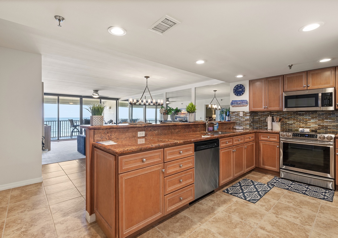 After a day at the beach, relax in the spacious living room with a new sectional sofa and entertainment options. Additional amenities include a full-size washer and dryer for added convenience.
