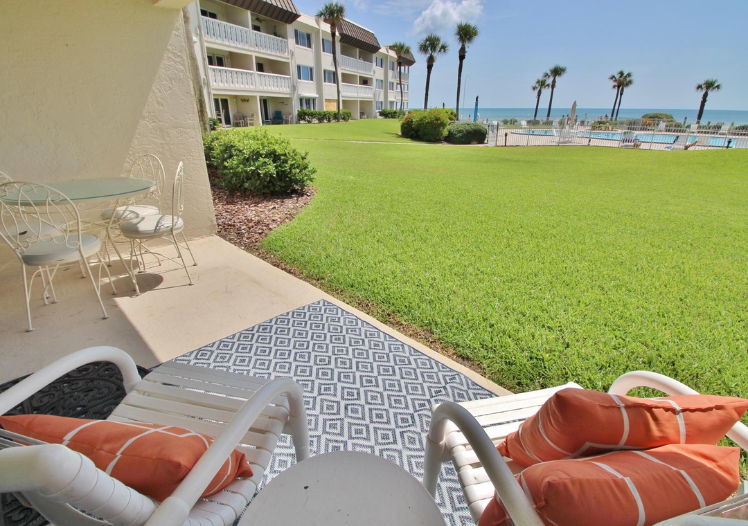 Inside, the condo offers ocean views from the kitchen, living room, and master bedroom. Step out the back slider to a spacious private patio, separated by a grassy area from the pool, just 15 yards away. Beyond that, the newly renovated complex patio offers panoramic beach views, perfect for relaxing before heading straight to the sand and surf.