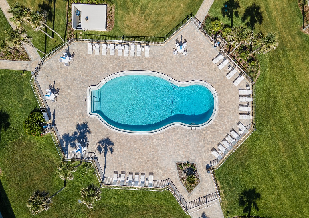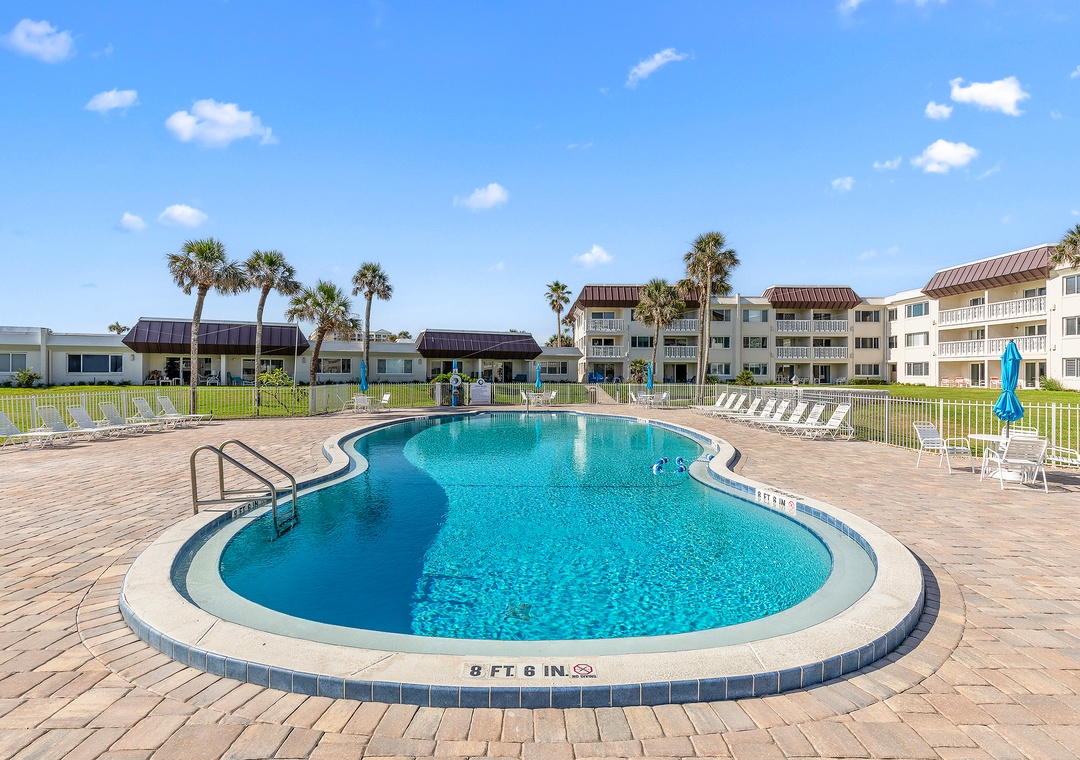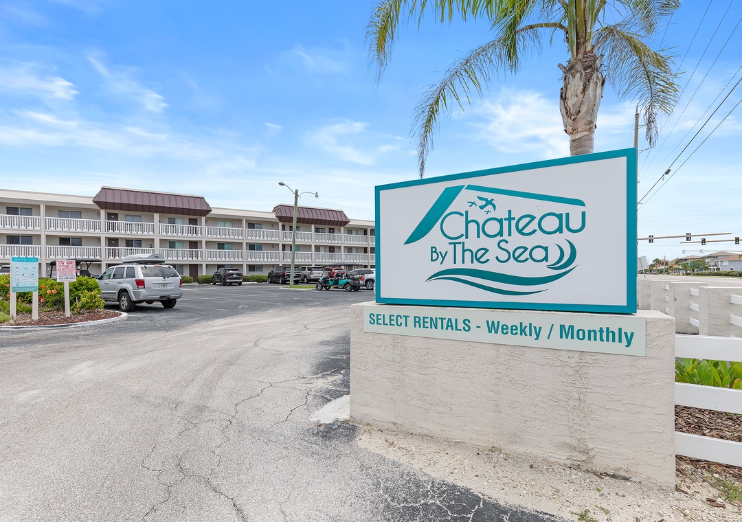 Chateau by the Sea is a peaceful haven, featuring a beautifully landscaped courtyard with lush grass, swaying palm trees, and seasonally blooming tropical plants. The expansive grassy area provides a serene buffer between the pool and the units, while the unique 'U' shape of the complex creates a private, home-like atmosphere.
