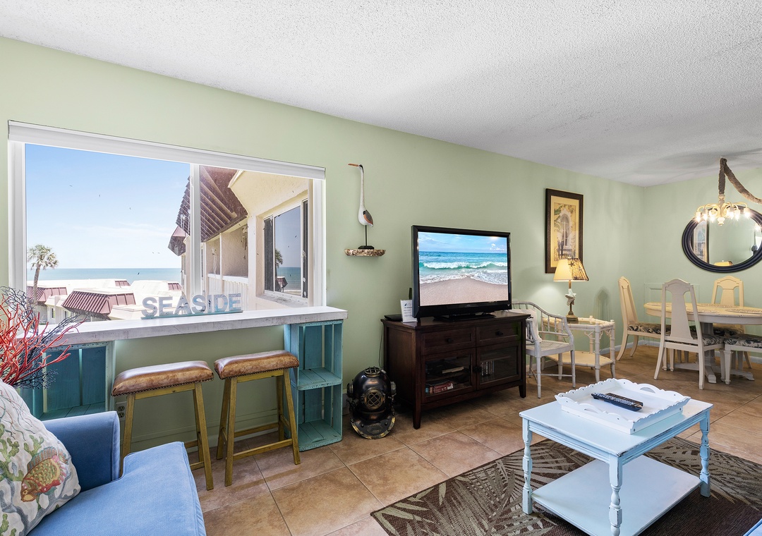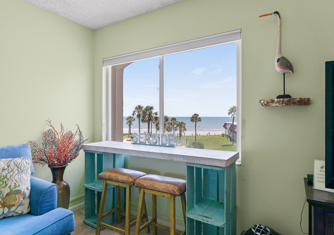 My wife and I spent three days for our 26th anniversary here. The room was very nice. The view of the ocean from the living room was awesome. It was so nice to sit at the bar in front of the window each morning while eating breakfast. The pool was nice and it was just a short walk out the back to the beach. This was our third trip to New Smyrna Beach and this was our favorite condo so far.- Reviewed On: 7/12/2025