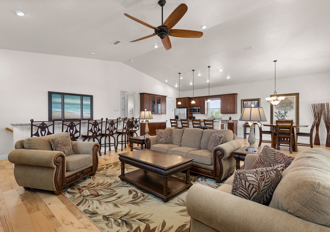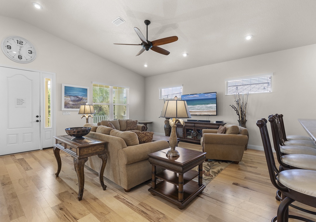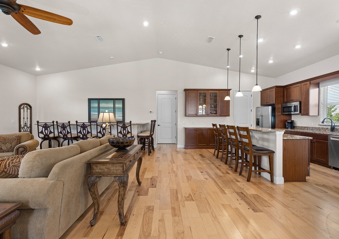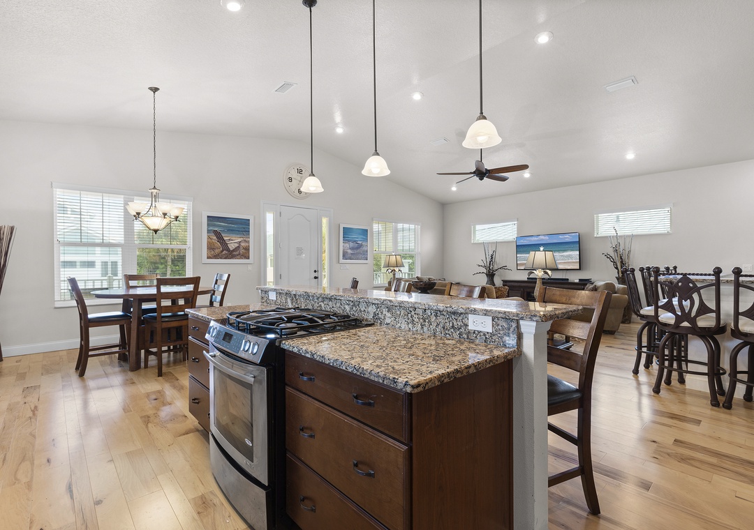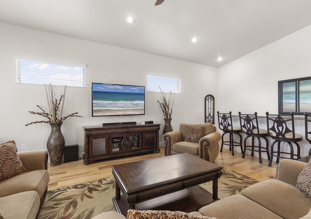 Upstairs, a spacious king ensuite primary bedroom just off the expansive open-concept kitchen and living room, with vaulted ceilings for an airy, coastal vibe, and enough seating for all family gatherings. A large east-facing balcony, perfect for sunrise coffee or evening ocean breezes, and a convenient half bath complete the upstairs.