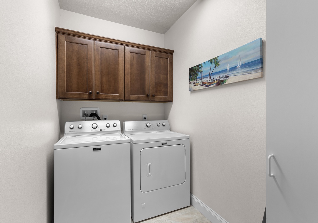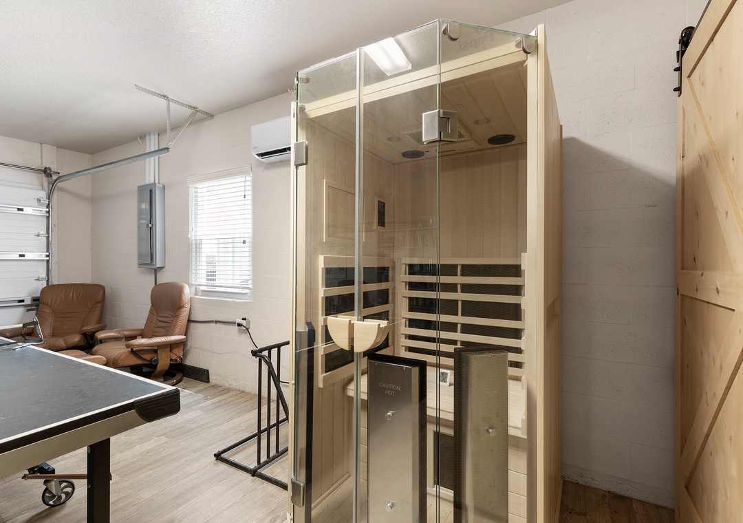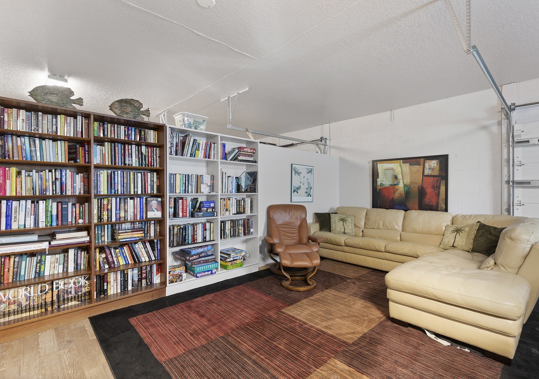 Downstairs there is a bedroom with two twin beds, another bedroom with a queen bed and a shared full bathroom, laundry room for convenience, access to the fenced backyard with room to relax and entertain on comfy outdoor seating and a table for dining al fresco. For even more fun, there is a private game and media lounge featuring large leather sectional with a sleeper sofa, a massive 70” Smart TV for movie nights or streaming your favorite shows, a ping pong table for family fun and friendly competition, and bookshelves stocked with great reads for every mood.