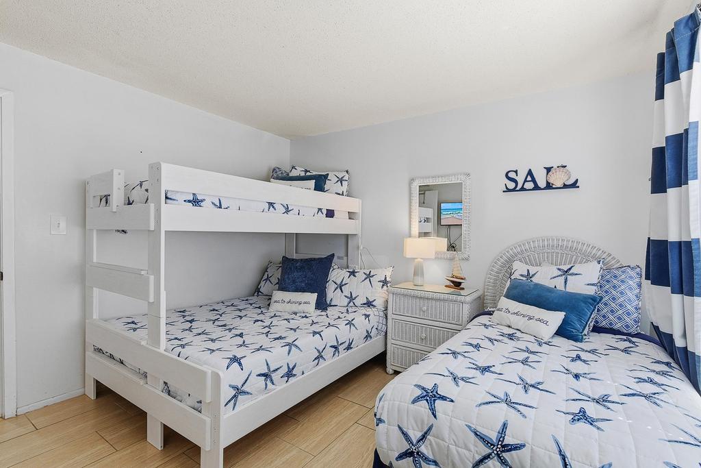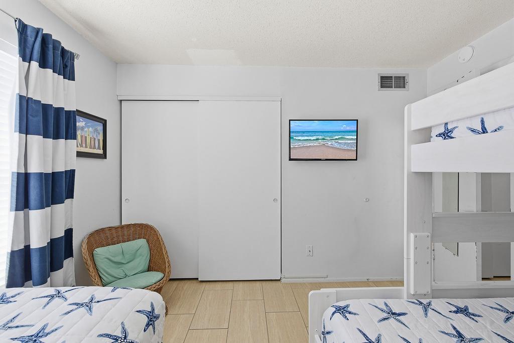 Though evening ushers the end of a fun beach day, you won't be disappointed as you have a welcoming primary suite awaiting. The primary bedroom has a comfortable king bed with a view of both the complex grounds and the flat-screen TV. Should you be working remotely, you can easily set up your "office" at the bedroom's desk. The primary bathroom is en-suite and has a large walk-in shower and plenty of bath towels.