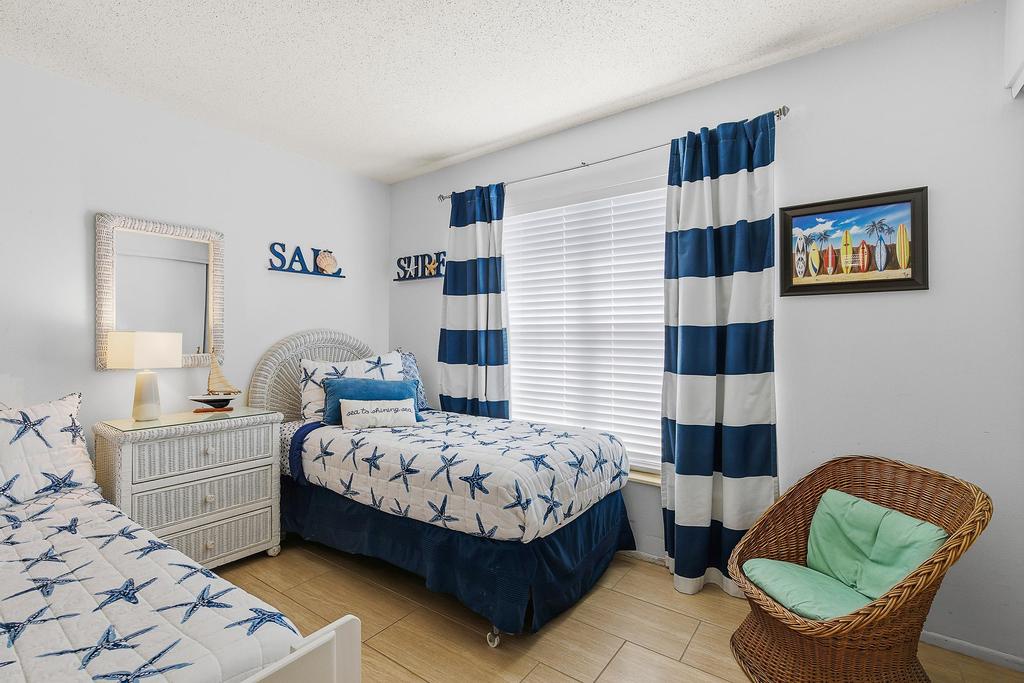 As you enjoy a peaceful 8-hour rest, the others will enjoy their time in the second bedroom. The second bedroom has a youthful appeal with its navy and white hues and coastal décor. Two twin beds and a large closet for personals are provided. The guest bathroom accommodates a standard bathtub and towels for everyone.