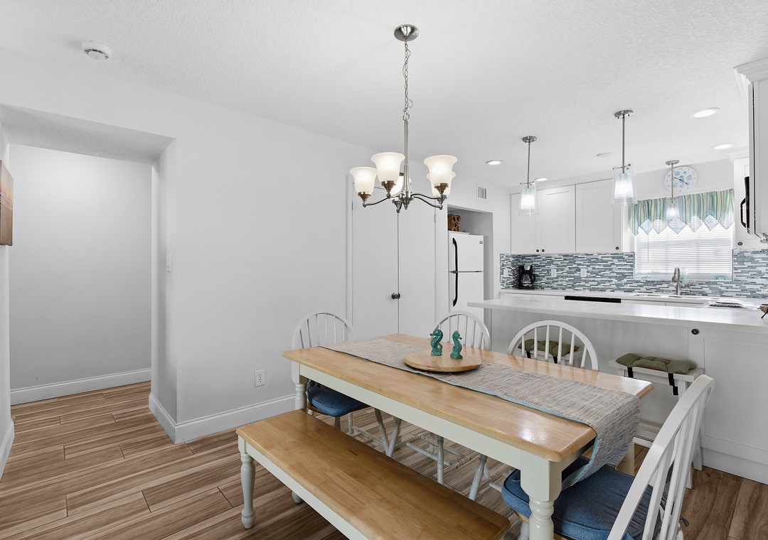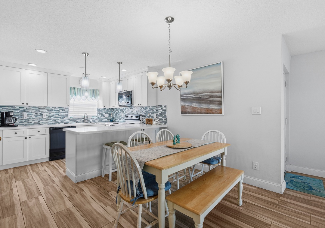The delicious aroma of a home-cooked meal will quickly draw your family around the dining room table. This farmhouse-style table seats six with its four spindle-back chairs and large bench. On the days when you are in a rush to get your toes in the sand, you'll love grabbing a quick bite at the kitchen's overhang that's lined with two bar stools.