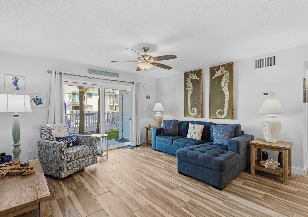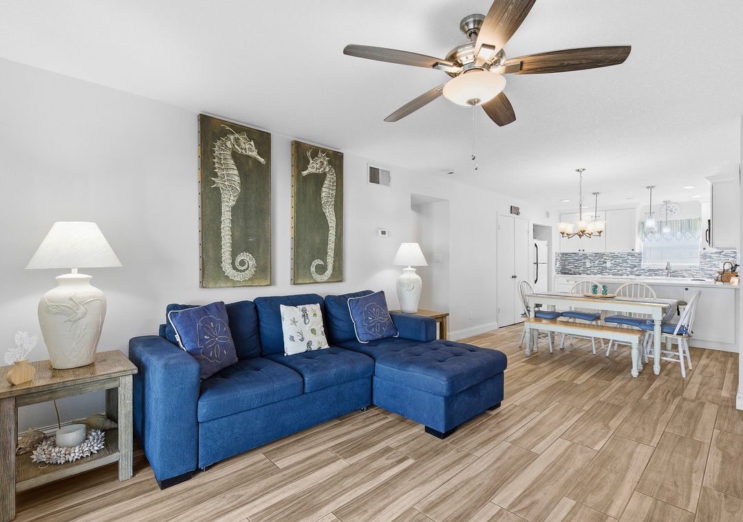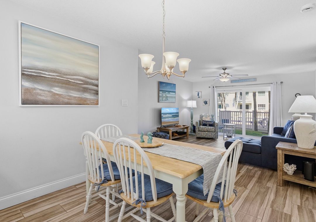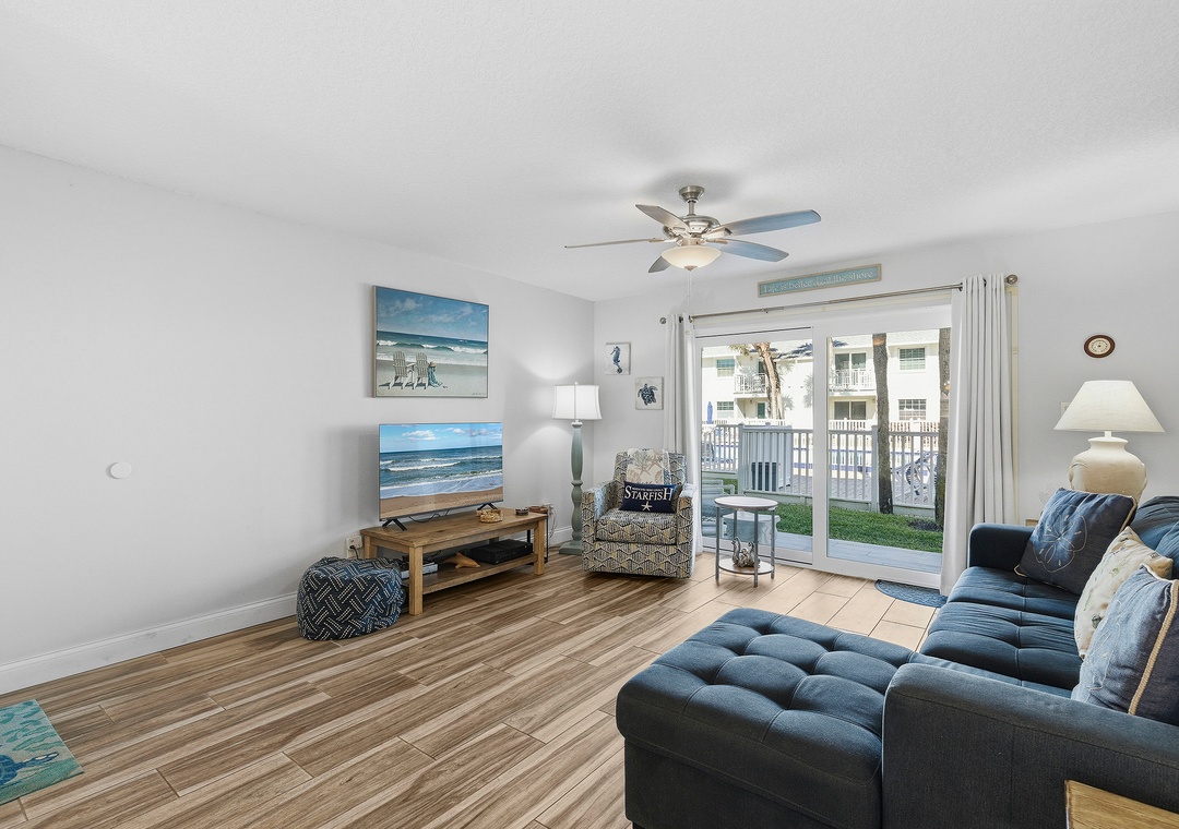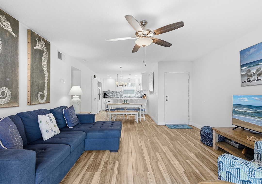As you step into this condo, you'll immediately feel as if it were your second home. The front door opens into the inviting living area that's composed of light walls, weathered wood flooring, and a soothing spectrum of warm tones. The living area beckons all to curl up on its pull-out couch and two leather recliners. While it has a home-like presence, this space whispers of the scenery outside your door with its subtle beachy accents throughout. When you're not playing in the waves, you'll find entertainment in the provided books, puzzles, and shows playing on the flat-screen TV equipped with a DVD player and DVR.
