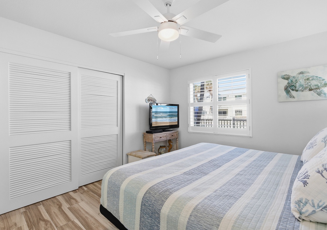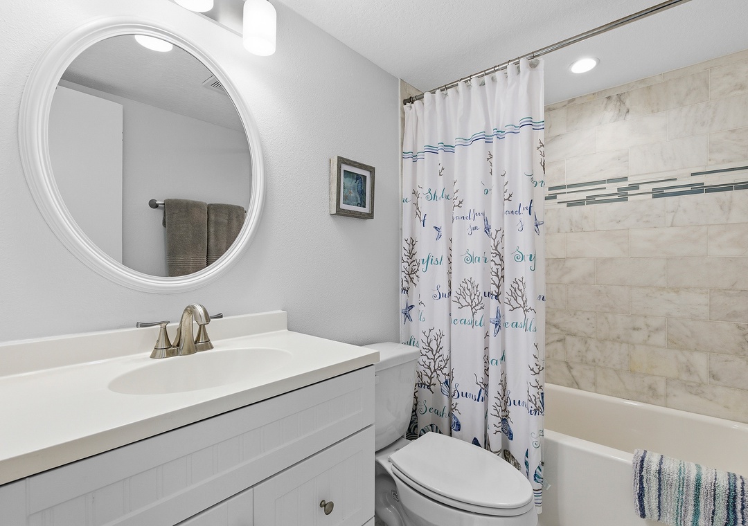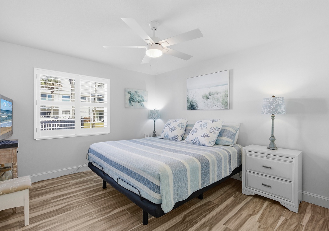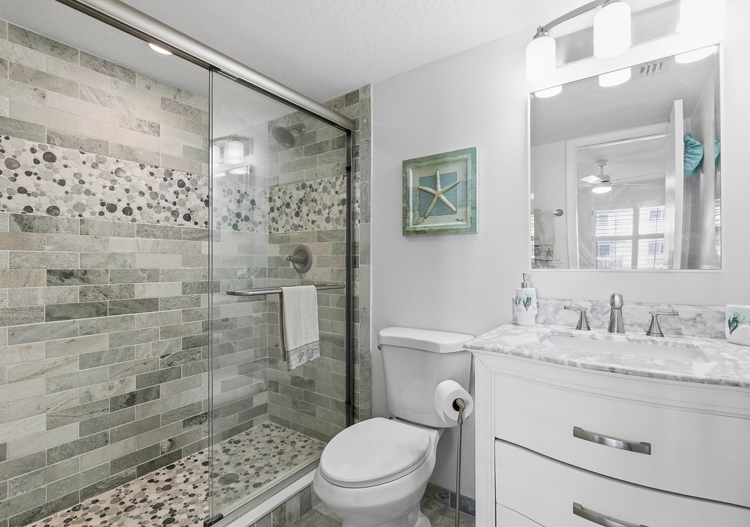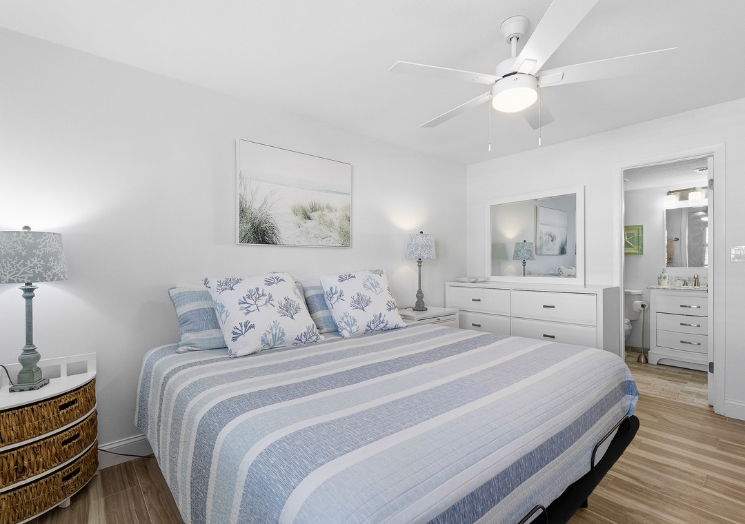 At the end of each beach-filled day, you'll be more than delighted to have a charming, cozy primary bedroom to retreat to. The primary suite holds a soft king bed, a matching dresser and side table set, and a flat-screen TV to enjoy your favorite movies. Connecting to the bedroom, you'll find the stunningly updated primary bathroom. From a custom-tiled, walk-in shower to a granite-top vanity, this bathroom will make your morning routine feel luxurious.