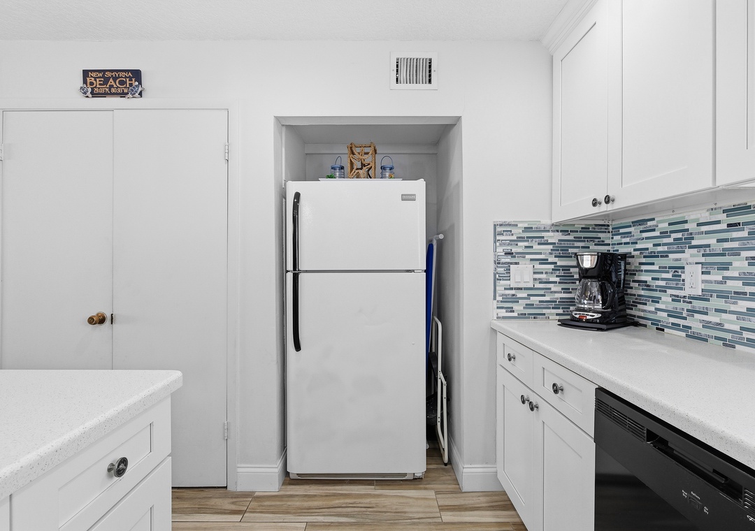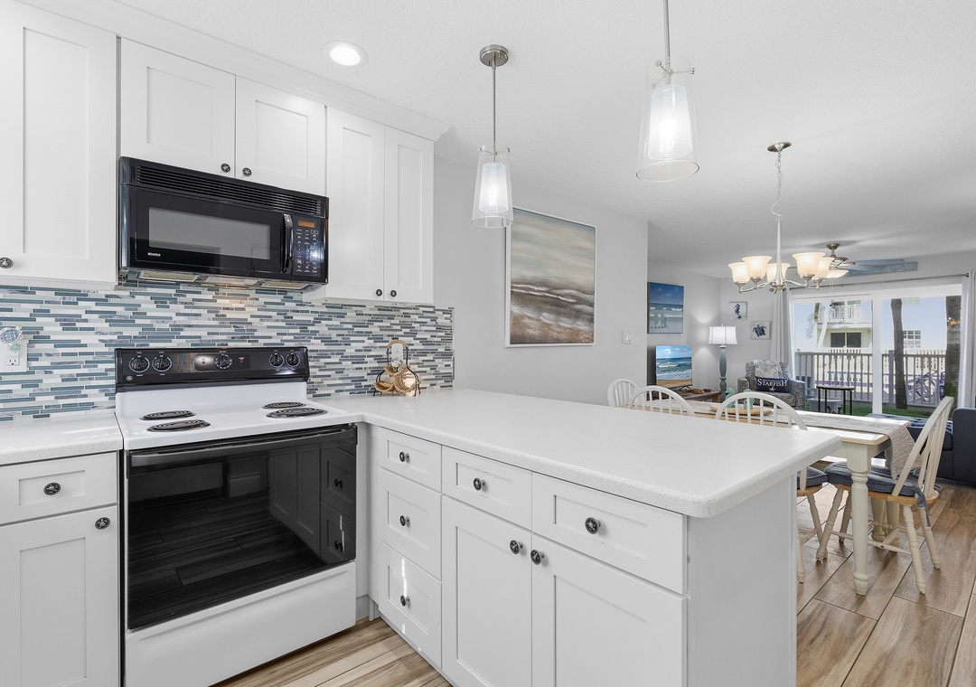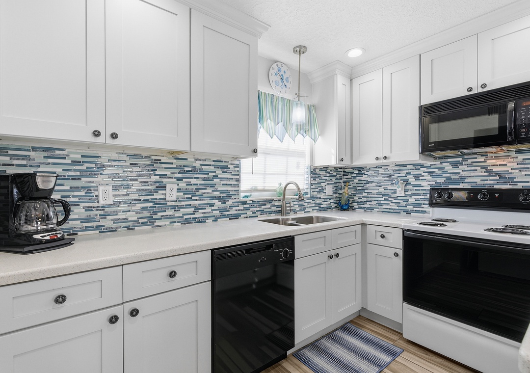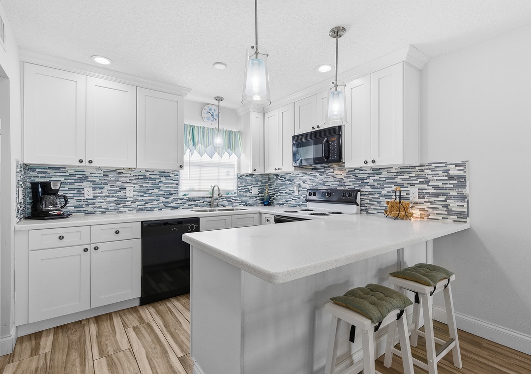 When everyone's worked up an appetite from a day on the shore, whip up an easy meal in the beautifully renovated kitchen. This space is filled with bright white cabinetry and light counters that contrast perfectly against the teal-hued backsplash. Gather your ingredients and begin preparing your entrée with all the tools and essentials this kitchen provides. Pots and pans, cooking utensils, a crockpot, a toaster oven, and even a stainless-steel coffee maker are all at your disposal.