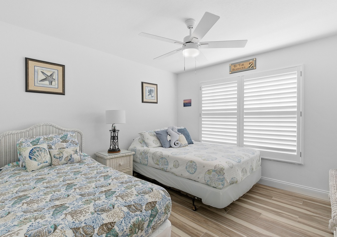 The second bedroom exudes coastal charm with its white-wicker furniture, nautical accents, and beachy bedding on the queen and twin bed. Guests can use the nearby bathroom as it has a standard bathtub with a beautifully tiled wall, a white vanity, and plenty of soft bath towels.