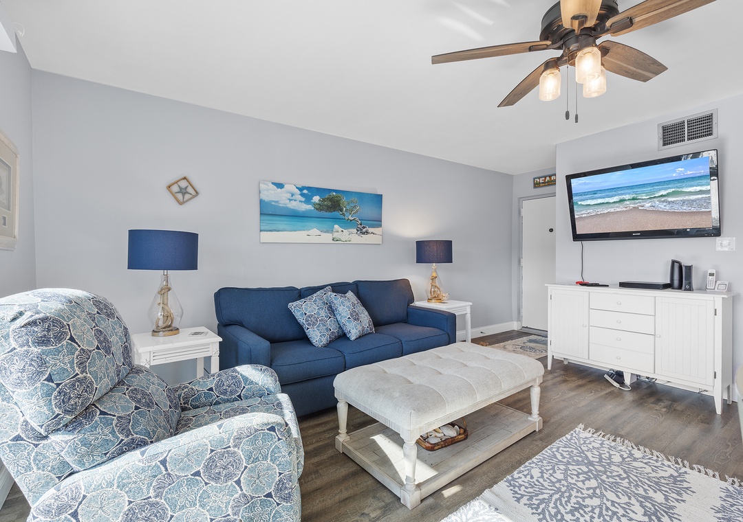 The condo starts its soul-soothing magic from the moment you walk through the door. Arrayed in subdued blue-grey hues and cream accents, you'll instantly feel your shoulders at ease from the airy atmosphere. As you step through the door, you'll find yourself in the chic, comfortable living room. Clock into vacation mode and rest from your travels on either the living room's pull-out couch or lovely patterned chair. Whether you turn on a show on the flat-screen TV (equipped with cable, DVD, and Blu-Ray players) or post your favorite beach pics using the condo's high-speed Wi-Fi, this space is one where you can kick back and relax.