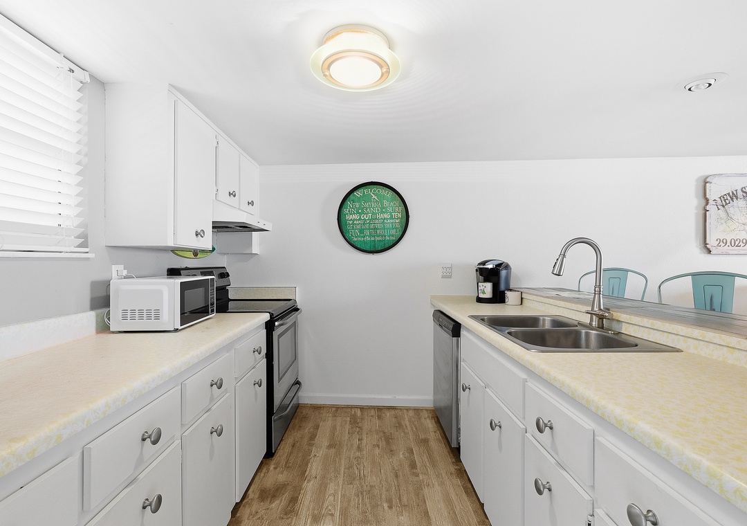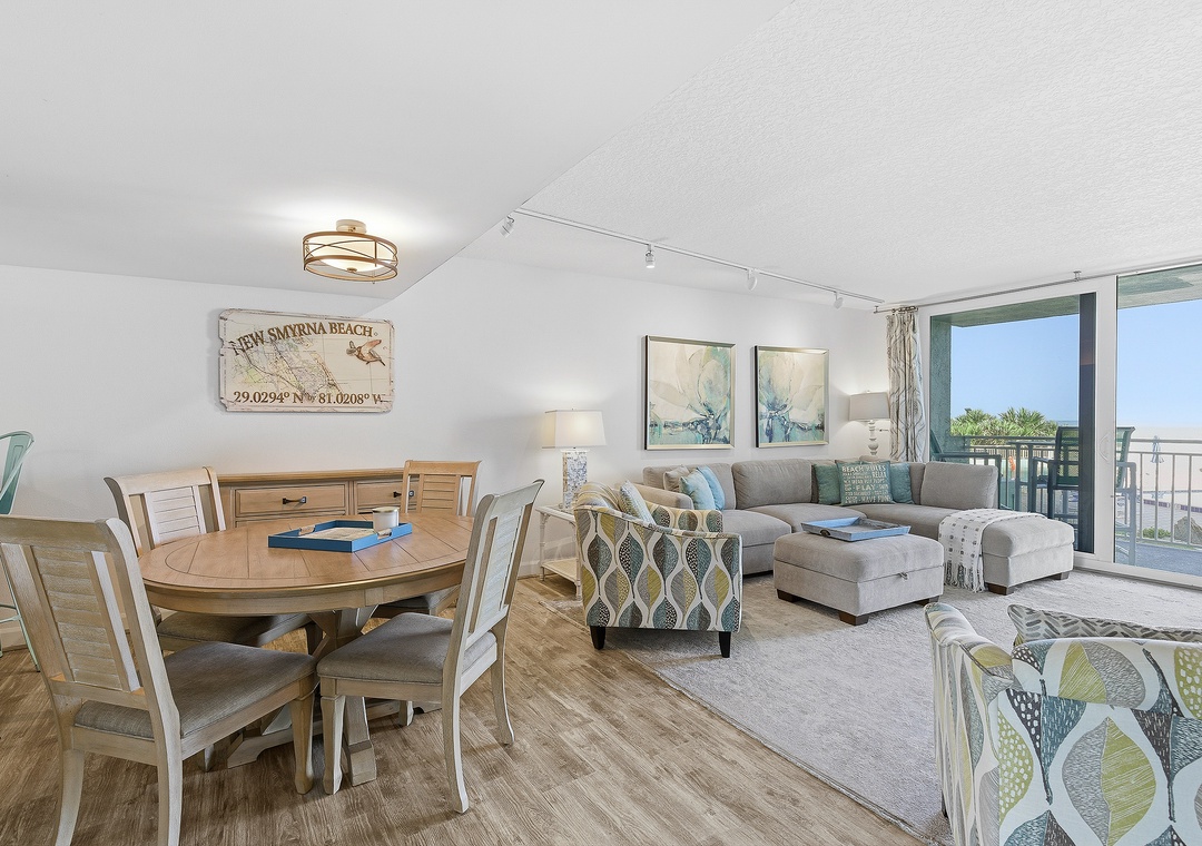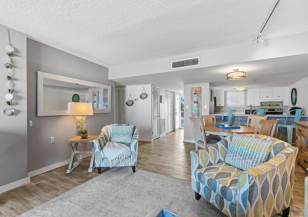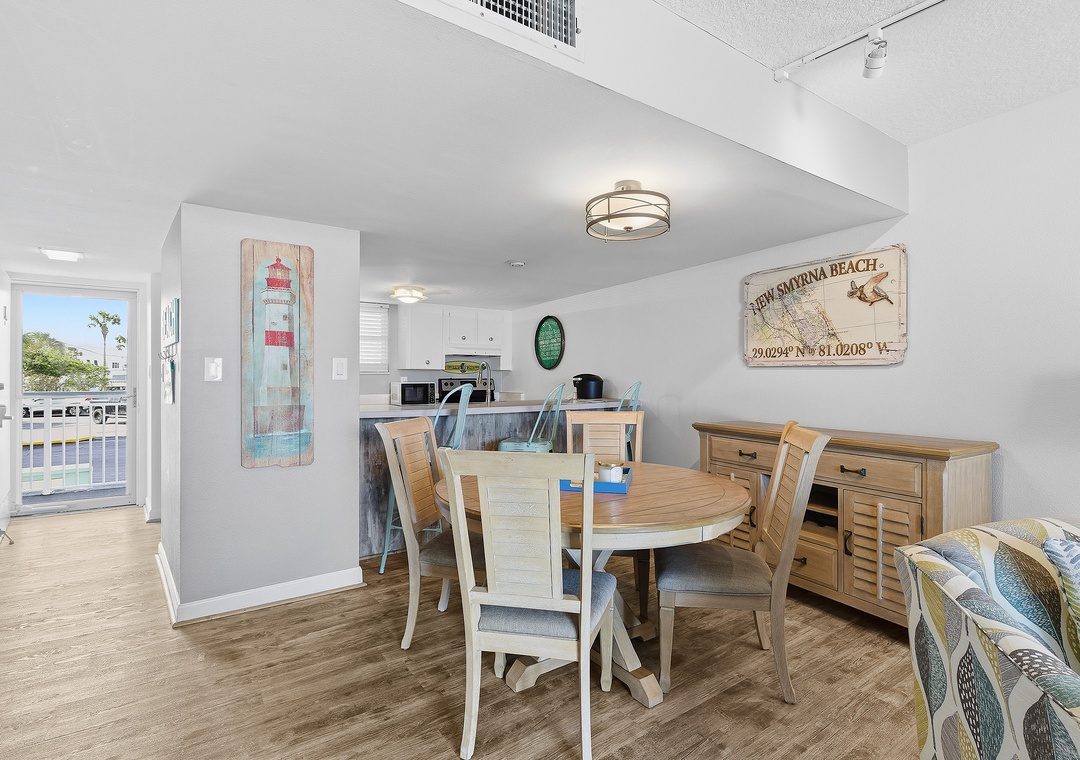 The galley kitchen is functional, well-equipped, and opens seamlessly into the dining area, which seats four, with additional bar seating for three. You’re just an easy 7-minute walk to historic Flagler Avenue, and the unit includes one assigned parking space for your stay.