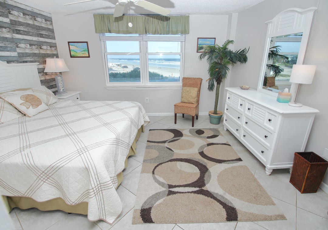 My husband and I met my sister and her husband for a one week New Smyrna Beach vacation. The unit was ideal with the bedrooms being bigger than I expected. Actually everything was bigger and better than I expected--even the closets. And the spectacular view was a big bonus because we could see everything going on all the way down the beach with the corner windows. I ended up bringing way too many things that I didn't need such as beach towels, chairs, cause everything was provided. Nice quick walks to Flagler's restaurants and bars. Will stay again!- Posted: 10/5/2015