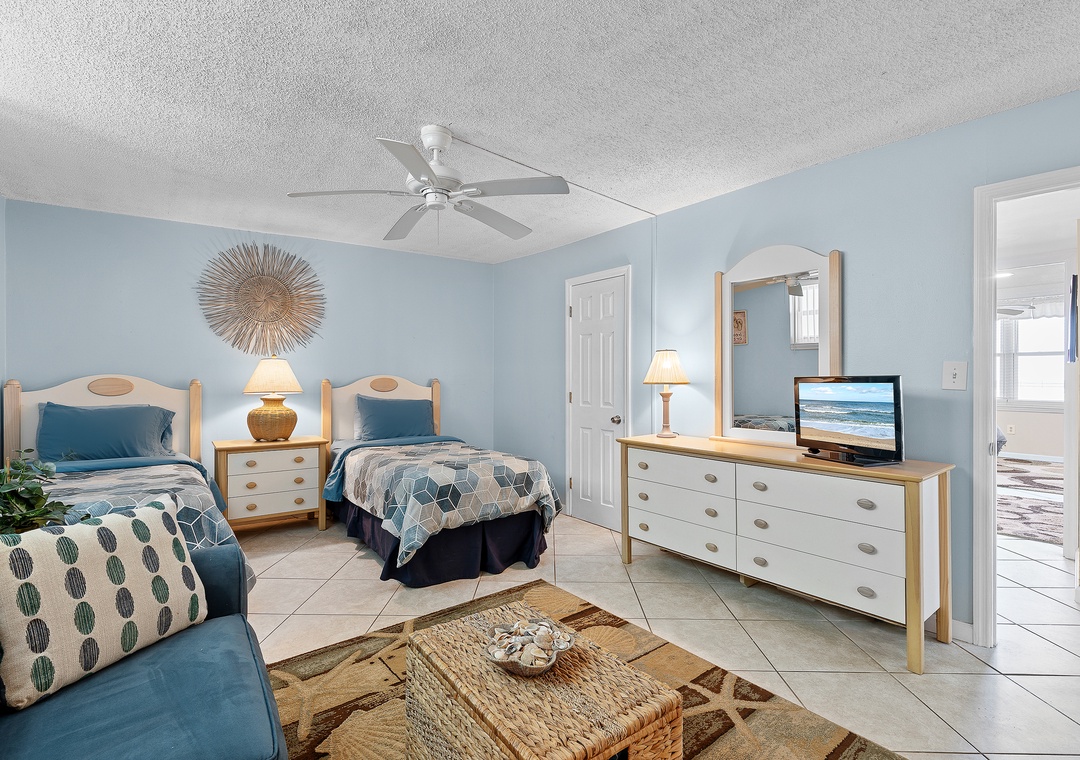 At Coronado Towers 201, you'll enjoy stunning panoramic ocean views from nearly every corner of this beachfront condo. This pet-friendly, two-bedroom, two-bath retreat offers a front-row seat to New Smyrna Beach’s sparkling waters, whether you’re relaxing on the balcony overlooking the pool and white sands or unwinding in the living room as the sun sets over the sea. With light, airy décor and cozy furnishings, you’ll feel right at home from the moment you walk in, and your furry friend can enjoy the beach alongside you. The condo’s well-equipped kitchen opens up to the living area, offering beautiful views while you prepare your morning coffee. The dining room's round glass table invites you to enjoy meals together with an ocean backdrop, and the living room, with plush seating and a flat-screen TV, is perfect for relaxation. The spacious primary bedroom features a king-size bed and large windows with stunning beach views, while the guest bedroom, with two twin beds and a fun, playful vibe, is ideal for kids. With ample linens, beach chairs, a washer/dryer, Wi-Fi, and cable TV, Coronado Towers 201 provides all the comforts of home, just steps from the beach.