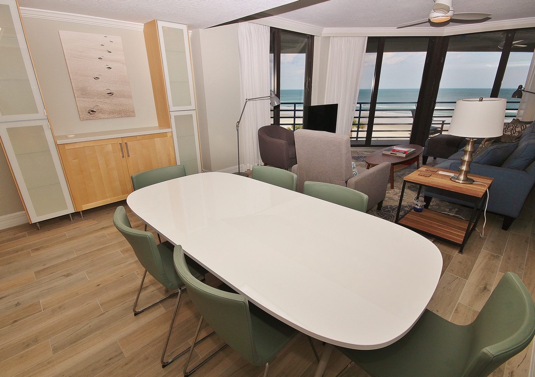 Ebb Tide 403 offers the perfect mix of convenience, comfort, and relaxation for your beach vacation. Just a short walk from New Smyrna Beach and close to shopping, dining, and golf, this charming unit provides easy beach access and a peaceful atmosphere, with a pool and spacious outdoor areas. Upon entering, you'll be greeted by a stylish living space filled with natural light and ocean views. The spacious living area is ideal for family gatherings or unwinding after a day of exploring. The fully stocked kitchen, conveniently located near the living area, is great for preparing meals, with baby-safe cabinetry for peace of mind. The open-concept dining and living space is perfect for family meals or evening card games. Step out onto the balcony to enjoy the sea breeze and sunset with your favorite drink. The master bedroom features a king-size bed for a restful night, while the second bedroom also offers a king bed. Guest bedroom 2 is perfect for kids with twin bunk beds, providing a playful space to rest after beach adventures. Whether you’re here to relax or explore, Ebb Tide 403 is the perfect spot for making lasting memories in New Smyrna Beach.