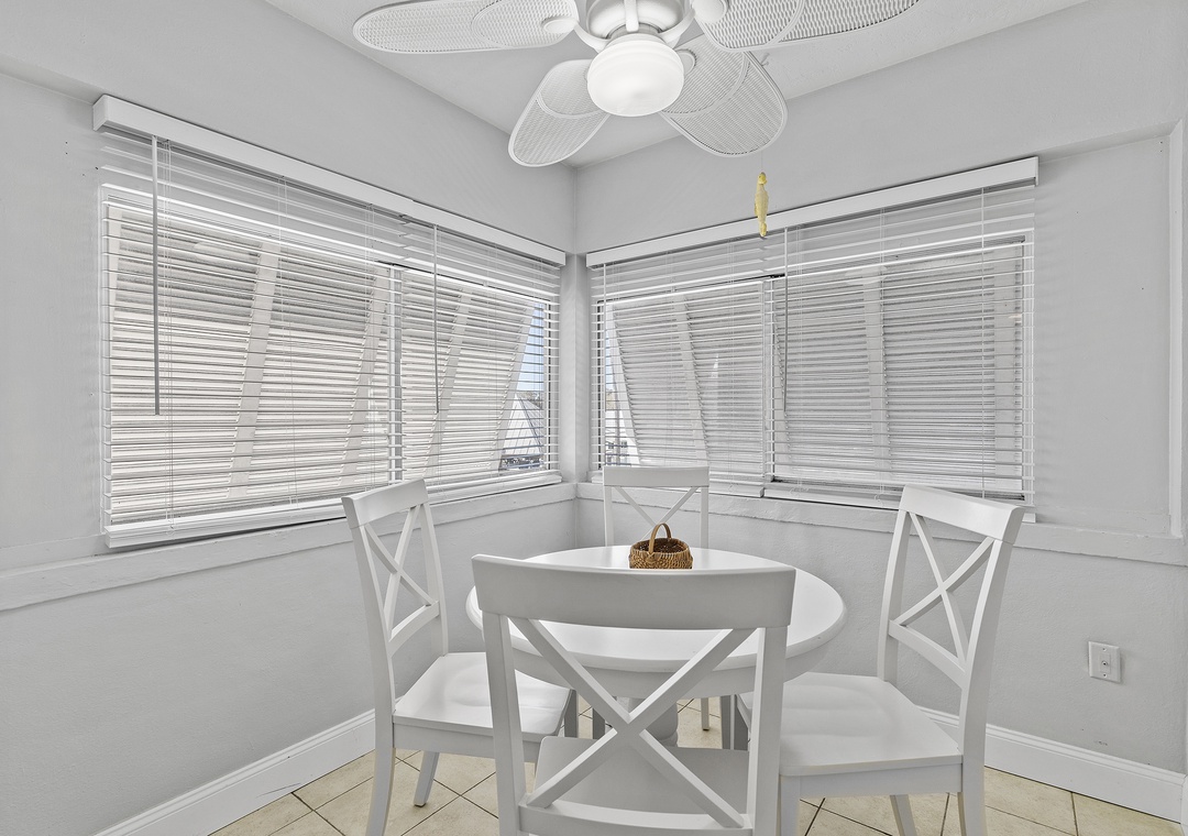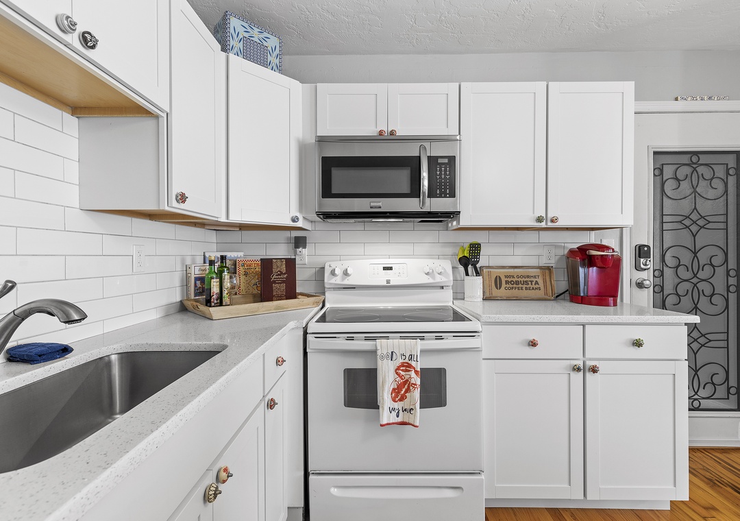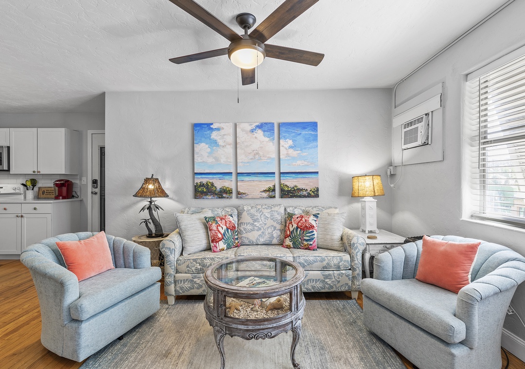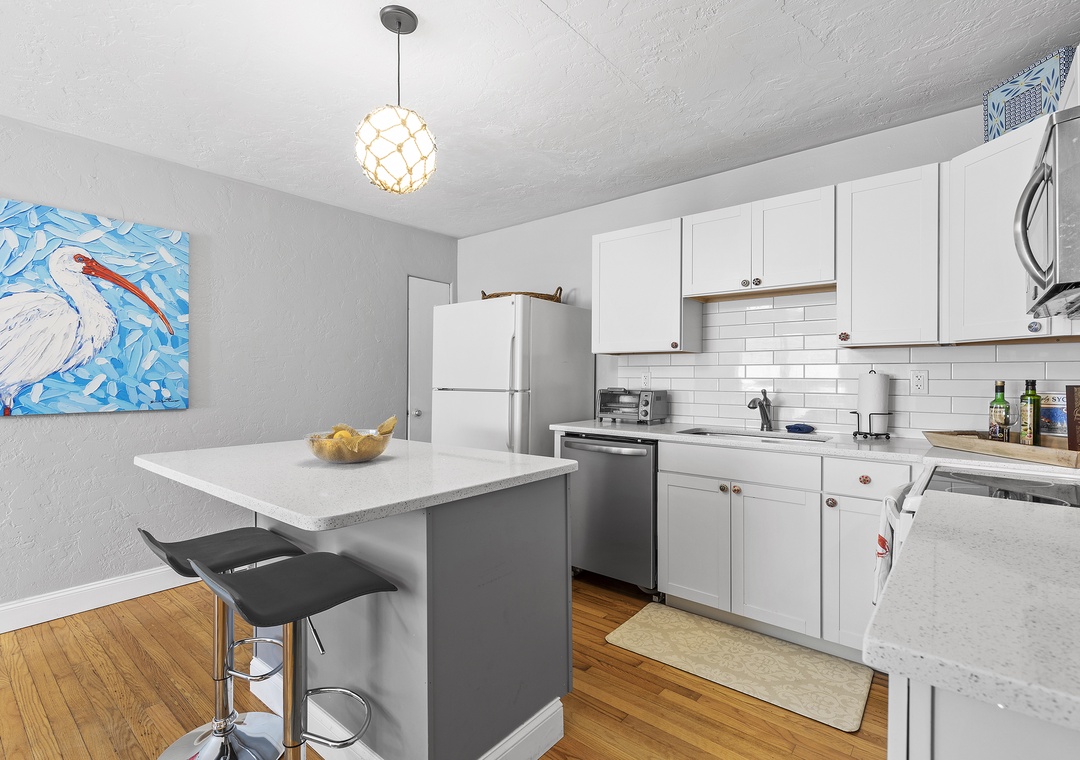 After a day of enjoying the vibrant energy of Flagler Avenue, return to your cozy suite, perfect for up to four guests. The living room offers comfortable seating for relaxing, a writing desk for remote work, and a mounted TV with cable for your favorite shows. The fully stocked kitchen has all the essentials to prepare meals, which you can enjoy at the breakfast counter or dining table for four.