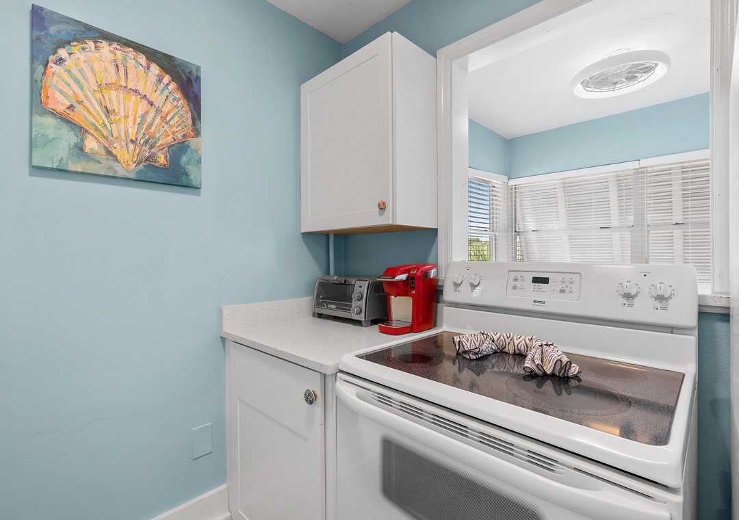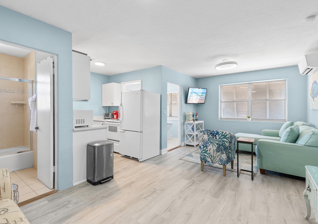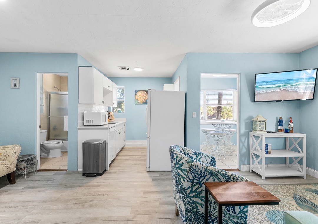 After a day of enjoying the vibrant energy of Flagler Avenue, return to your cozy suite, perfect for up to four guests. The living room offers comfortable seating for relaxing, a writing desk for remote work, and a mounted TV with cable for your favorite shows. The fully stocked kitchen has all the essentials to prepare meals, which you can enjoy at the breakfast counter or dining table for four.