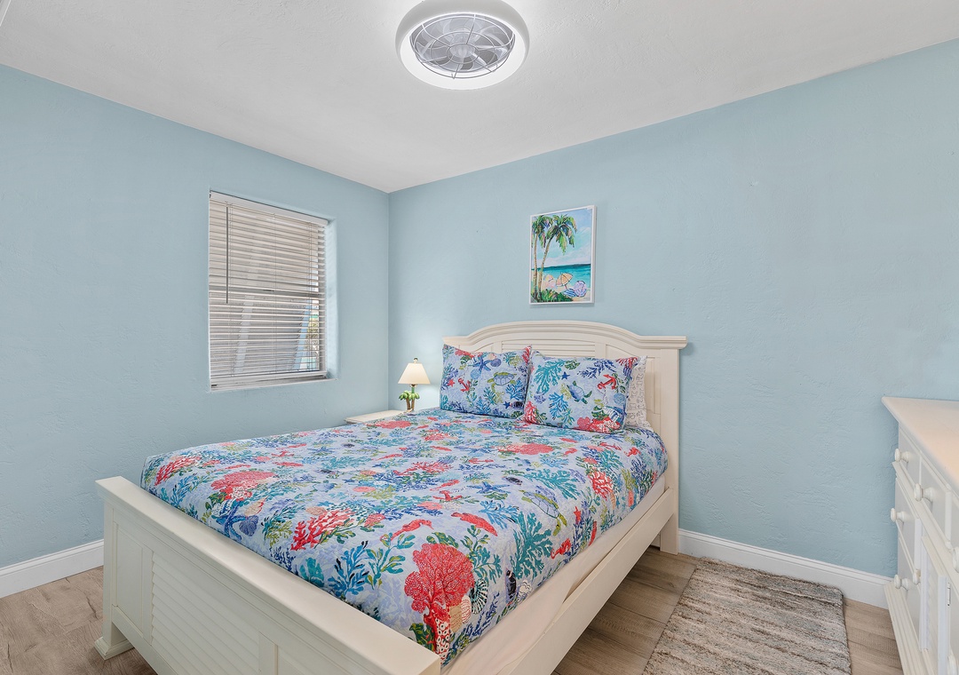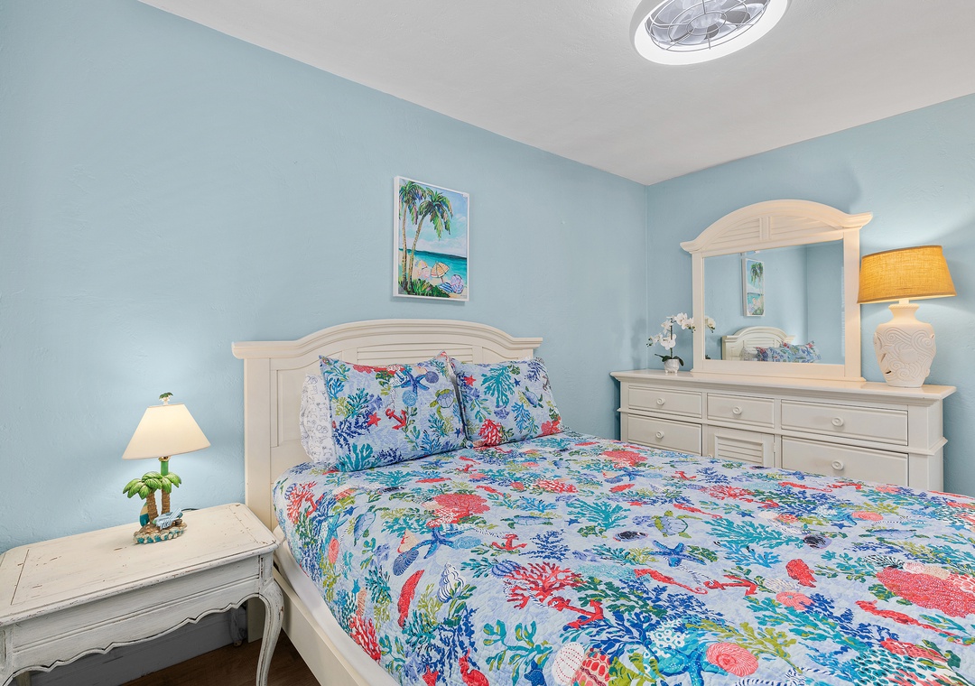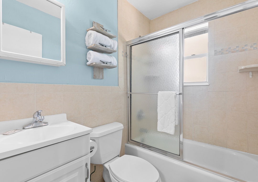 When it's time to unwind, the bedroom features a queen bed and dresser for a restful night’s sleep. The nearby bathroom includes a standard bathtub and plenty of bath linens to ensure your comfort.