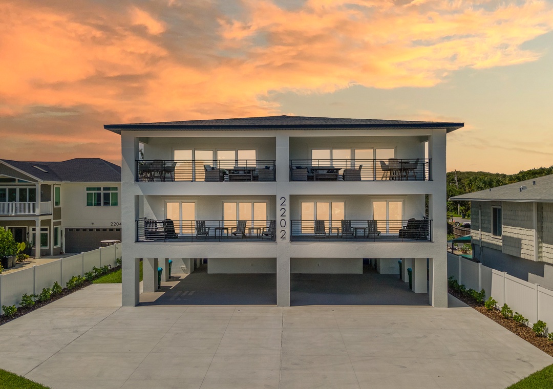 Welcome to your ultimate luxury beach escape! This brand-new, elevated 3-story pet-friendly coastal home is just 400 steps from the sand and thoughtfully designed with two identical, fully equipped sides, making it perfect for large groups, multiple families, or multi-generational vacations. Each side features 4 spacious bedrooms, a dedicated bunk room with two twin-over-double bunk beds, and a private king studio suite complete with a kitchenette, sleeper sofa, full bathroom, and its own laundry room—bringing each side to 5 sleeping areas, bunk area, 4 full bathrooms, 2 half baths, and 2 laundry spaces. Altogether, the home includes 10 sleeping areas, 2 bunk areas, 8 full bathrooms, 4 half baths, 4 laundry rooms, and comfortably sleeps up to 36 guests, plus room for more with 2 extra twin mattresses included for a total of 38. On the third floor, each side offers a gourmet kitchen with premium appliances, a dining table that seats 8, island seating for 6, a family room with 2 large smart TVs, a king master suite with a spa-style ensuite and oversized walk-in closet, a half bath, a dedicated workspace, and a sprawling balcony with plenty of seating. A connecting door on the third floor links both sides, allowing guests to enjoy privacy when needed and easy access when gathering together. The second floor of each side includes 3 additional bedrooms (one with balcony access), the bunk room, 2 full bathrooms, a living room with smart TV, a large furnished balcony, and a full laundry room. The first floor hosts the private studio suite on each side, along with entry foyers, half baths, elevator access, outdoor showers, gas grills, and storage for beach gear. For entertainment, there are 20 smart TVs total—one in every bedroom, each bunk room, each living room, and 2 in each family room. With high-speed Wi-Fi, generous closet space, four expansive balconies, and flexible sleeping arrangements, this luxury retreat offers the ideal setup for reunions, retreats, or any large-group getaway—just steps from the Atlantic.