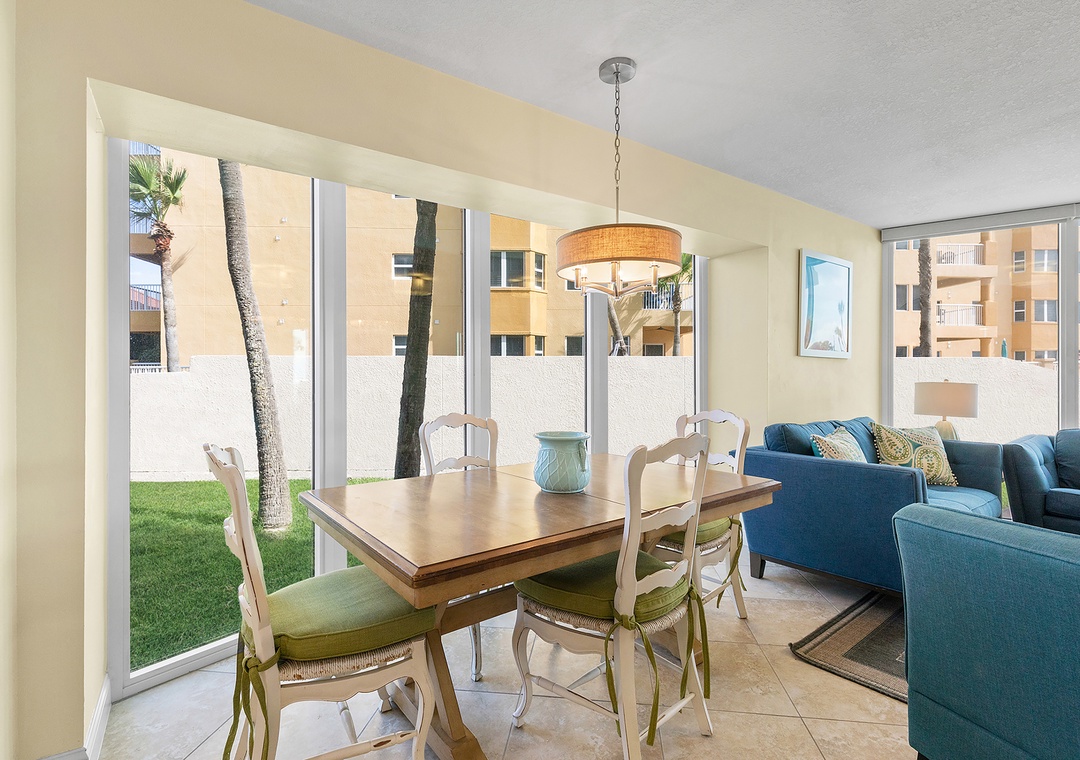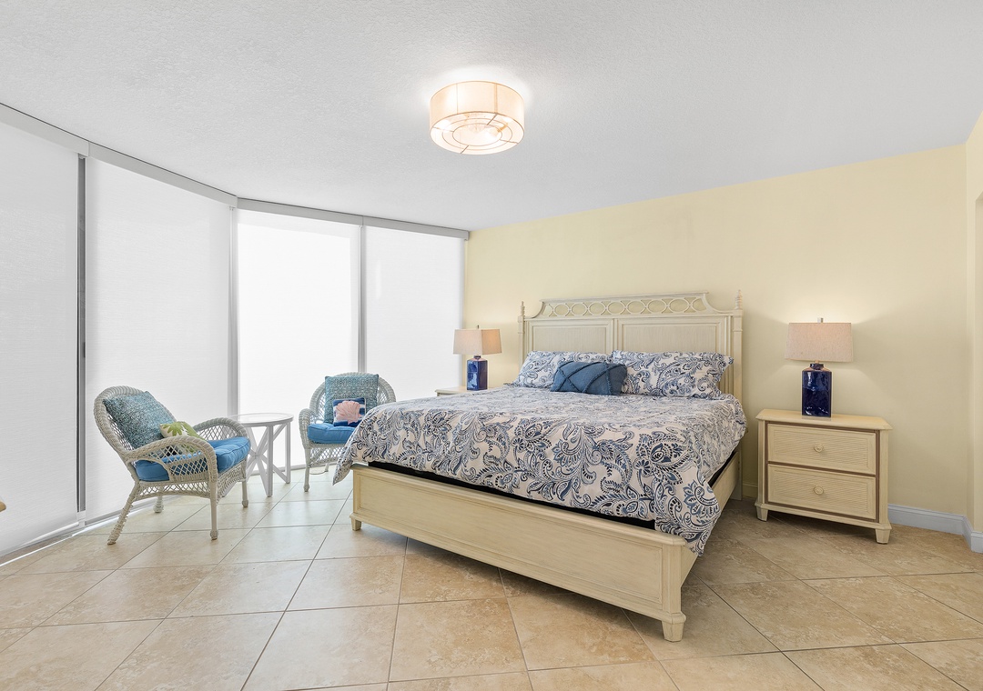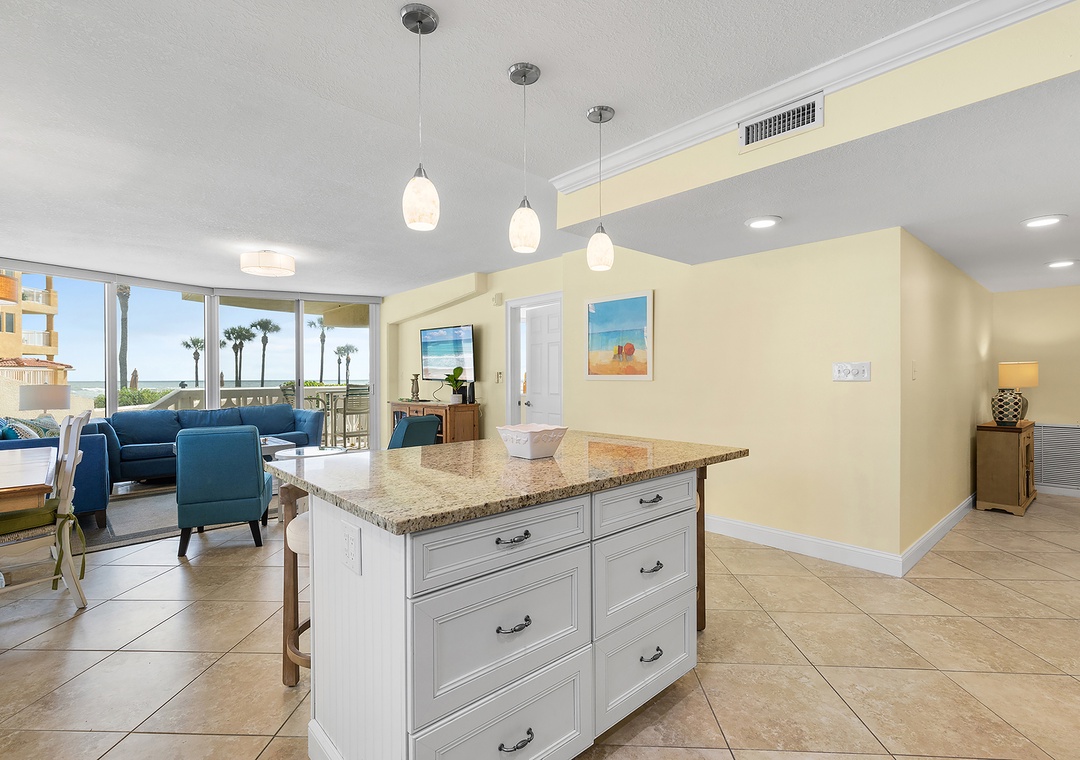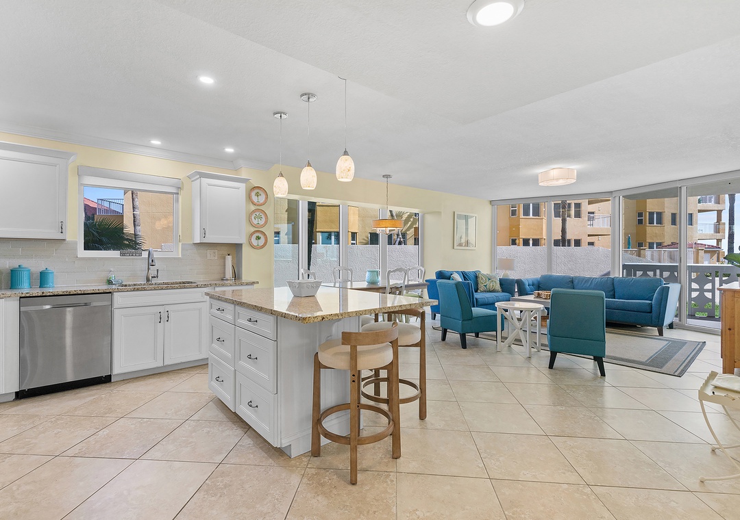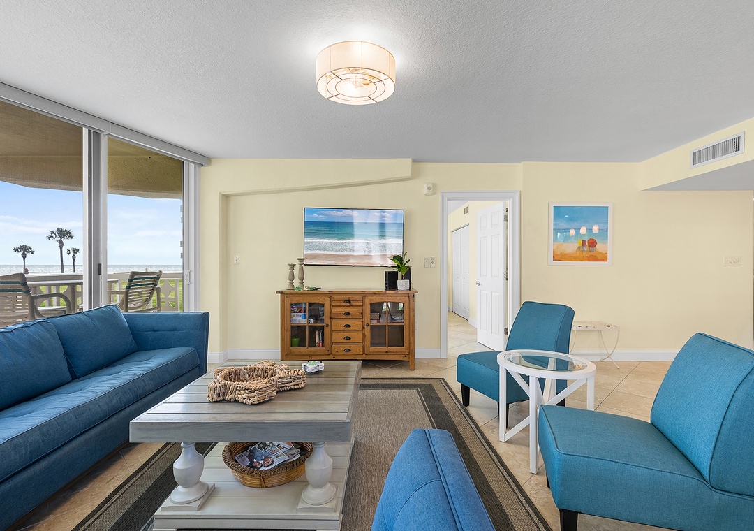Treat yourself to sweeping, 24/7 views of the Atlantic Ocean at Golden Arms 101, a beautiful two-bedroom, two-bathroom condo on the 1st floor of Golden Arms. Perfect for groups of up to 7, this retreat features brand new floor-to-ceiling windows and sliders that invite you into the beautiful blue waters beyond. As you step inside, the ocean greets you, drawing you in. Enjoy meals at the dining table before walking out to explore the nearby beach, pool, or Flagler Avenue’s vibrant dining and shopping scene.