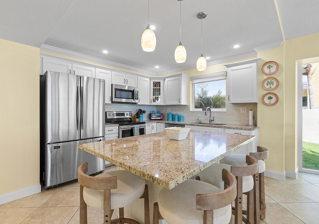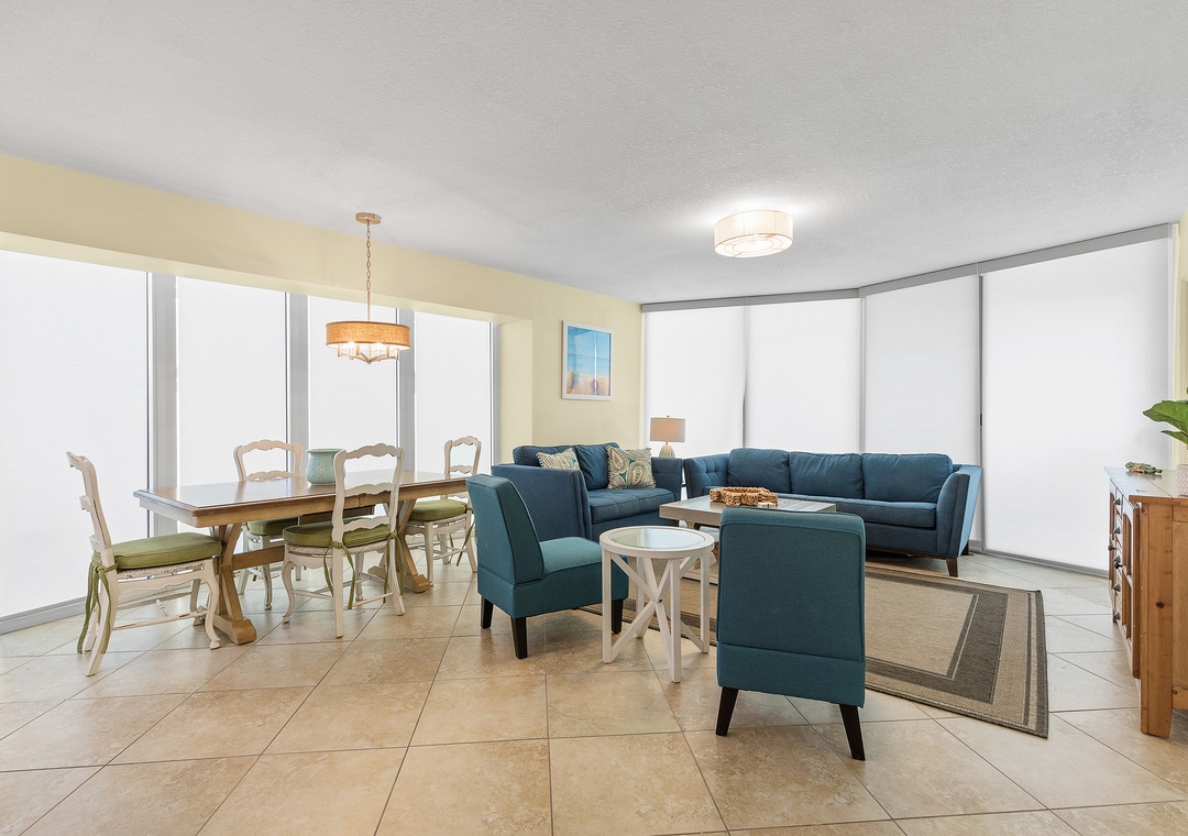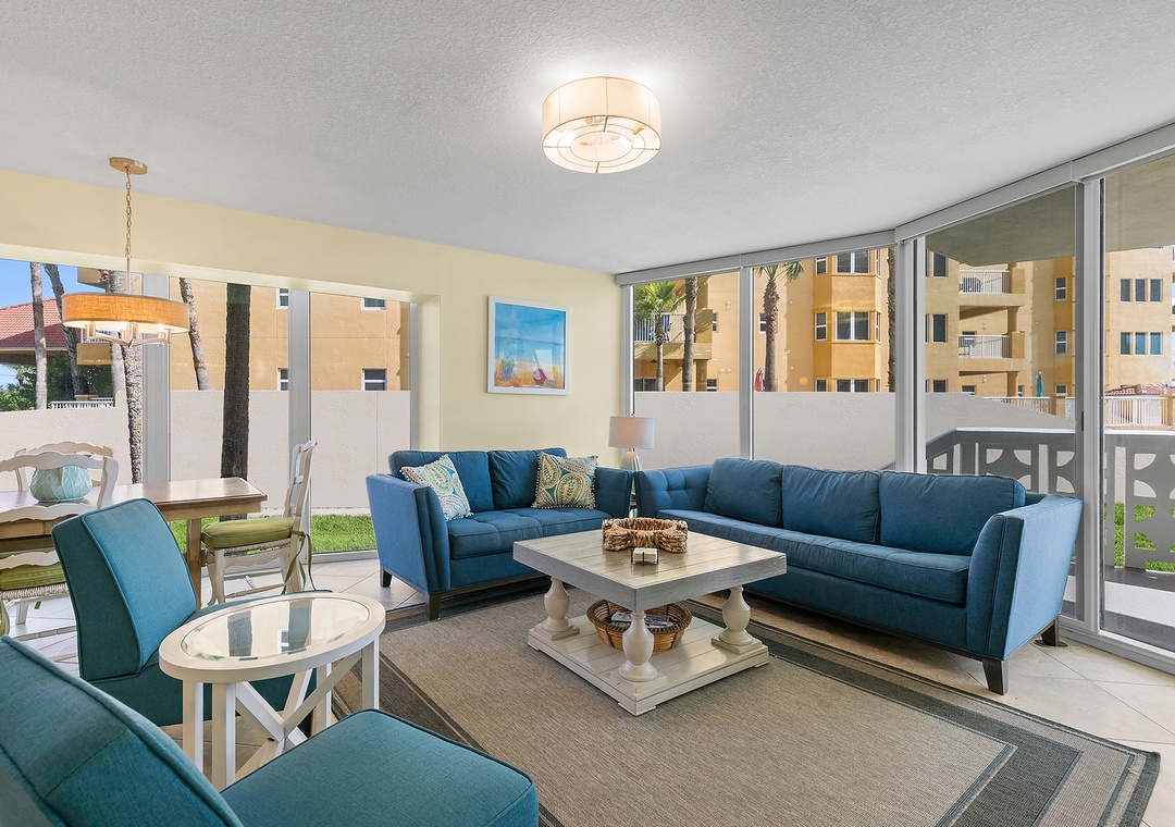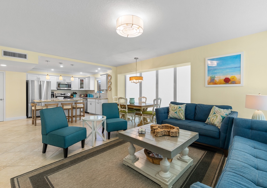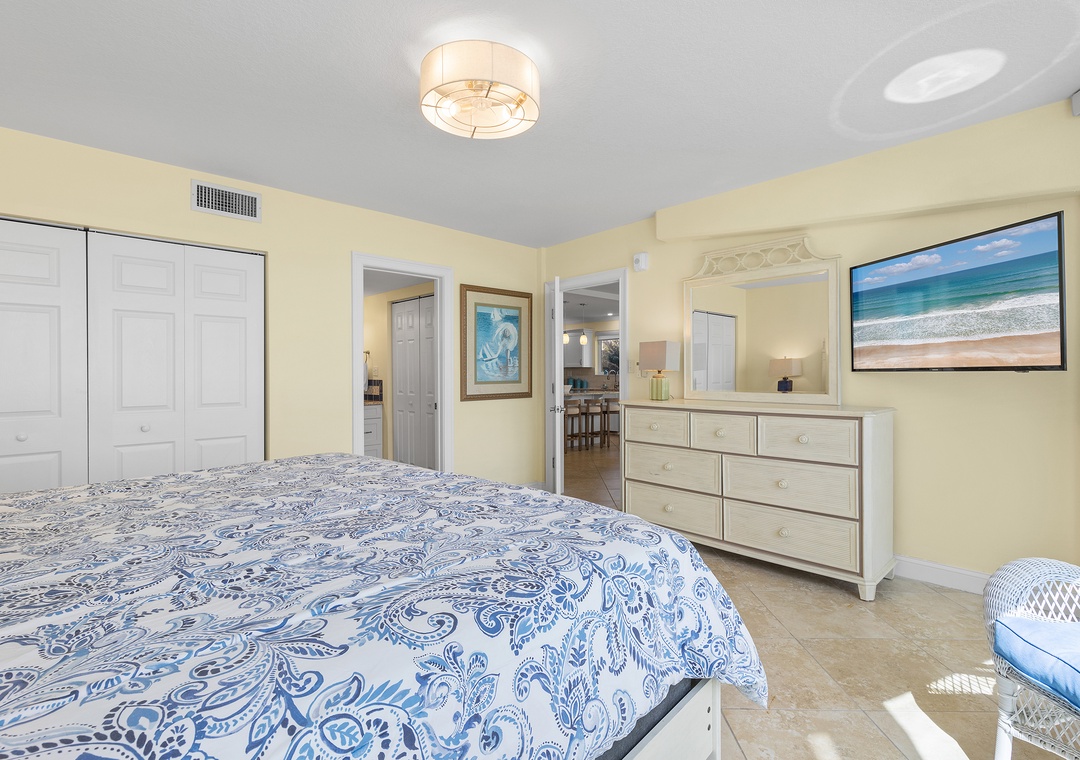Treat yourself to sweeping, 24/7 views of the Atlantic Ocean at Golden Arms 101, a beautiful two-bedroom, two-bathroom condo on the 1st floor of Golden Arms. Perfect for groups of up to 7, this retreat features brand new floor-to-ceiling windows and sliders that invite you into the beautiful blue waters beyond. As you step inside, the ocean greets you, drawing you in. Enjoy meals at the dining table before walking out to explore the nearby beach, pool, or Flagler Avenue’s vibrant dining and shopping scene.