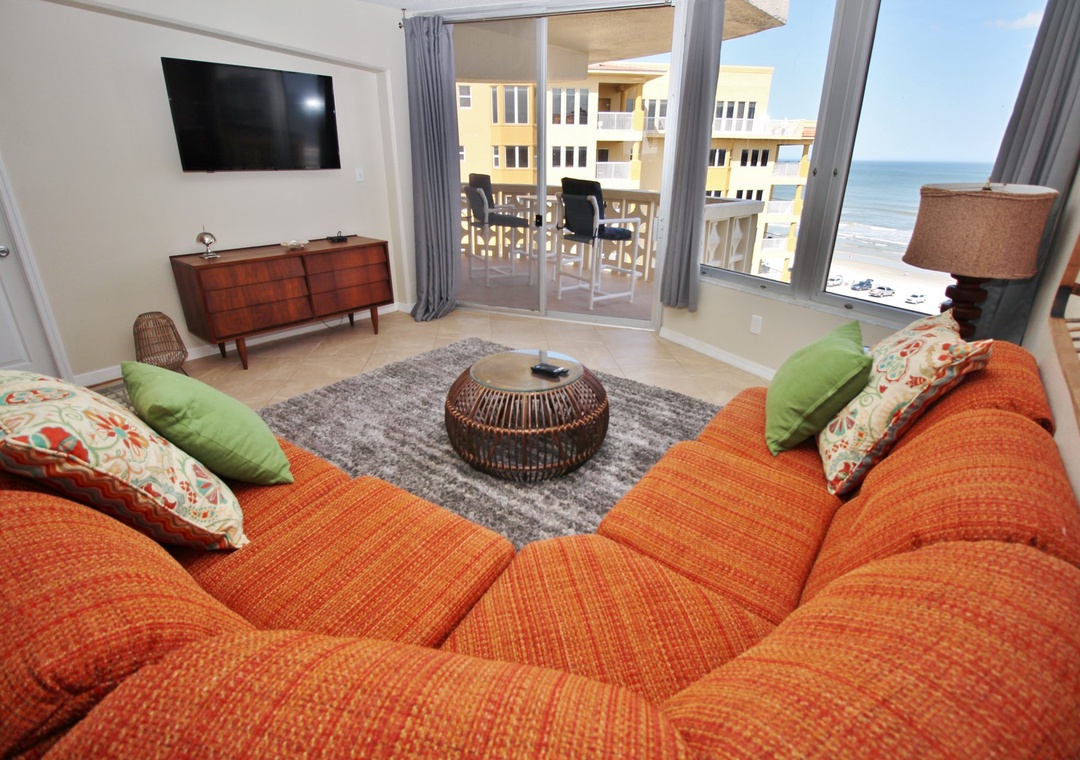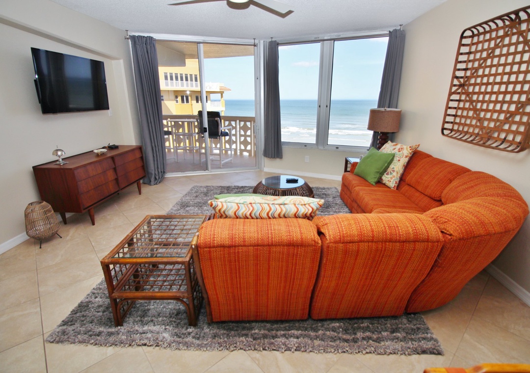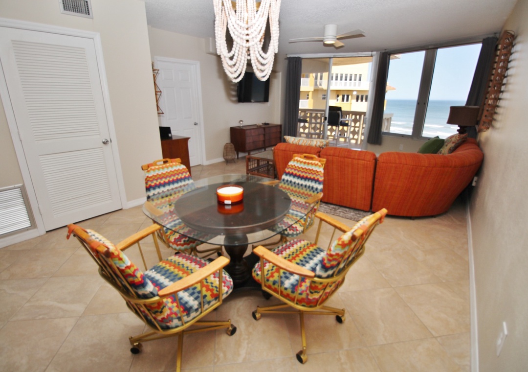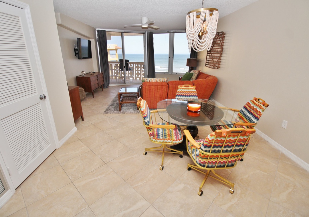 Enjoy meals at the dining room table, which seats four with rolling mid-century chairs under a striking chandelier. After dinner, unwind in the spacious living room on the orange sectional, soaking in panoramic ocean views or watching shows on the flat-screen TV with DVR and DVD player. The wrap-around balcony offers a tranquil spot to sip evening drinks and take in breathtaking views of the Atlantic, the pool, and the grounds, with seating for two at a high-top table. At night, retreat to the primary suite, featuring a king bed, private balcony access, flat-screen TV, and a cozy reading nook. The en-suite bathroom includes a sit-down vanity and a tub with a moveable showerhead. The guest bedroom offers two twin beds, light bedding, a dresser, and an adjacent bathroom with a tiled shower. Complete with high-speed wireless internet, cable TV, linens, towels, beach chairs, and all the comforts of home, this condo promises a memorable and relaxing beach escape.