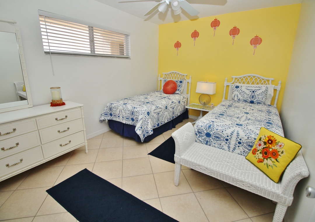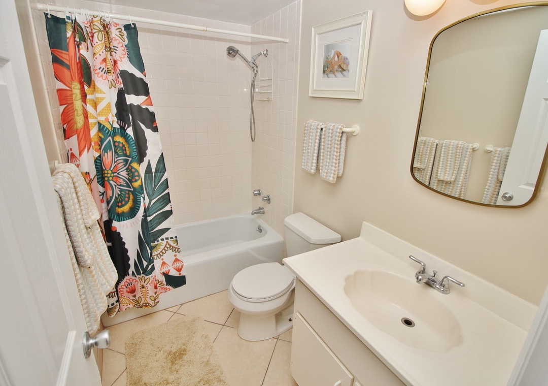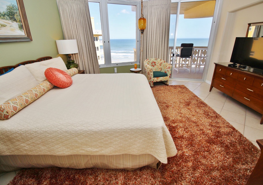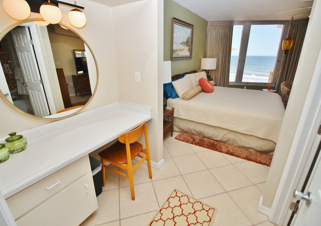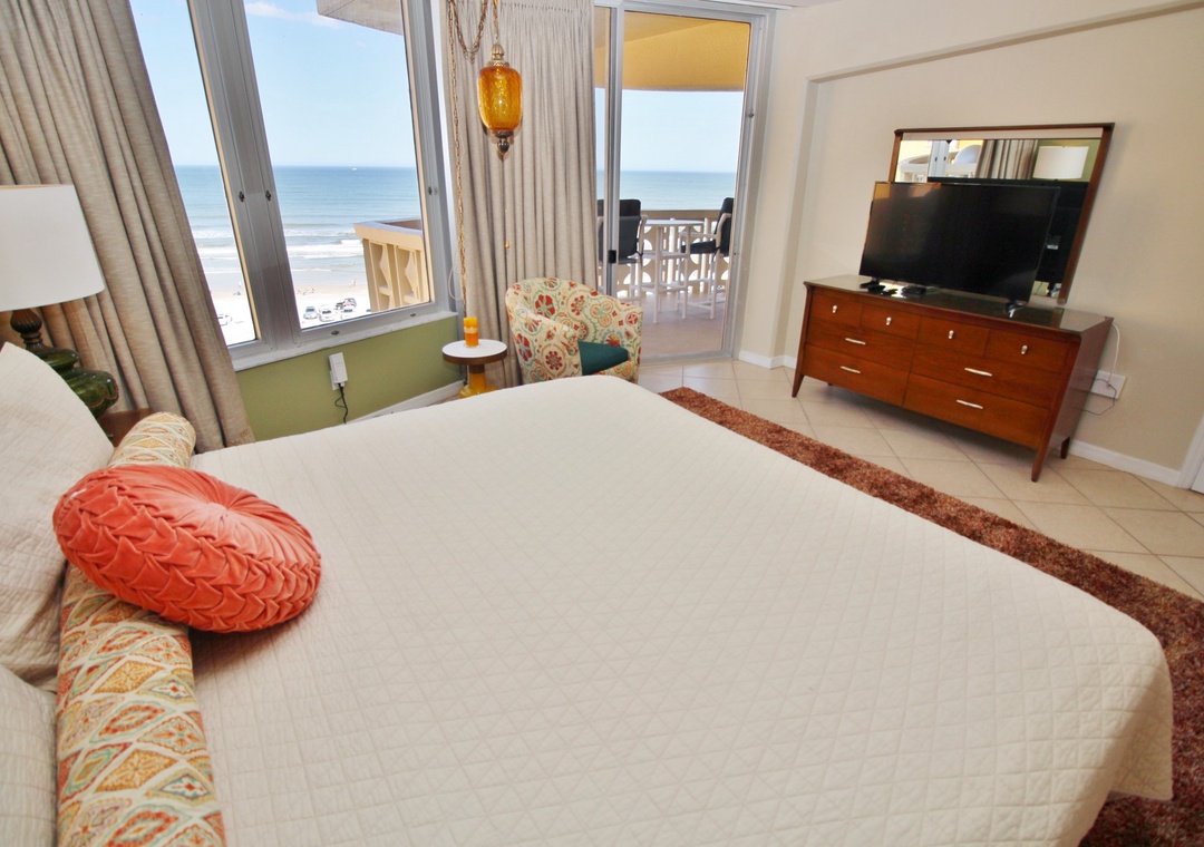 Enjoy meals at the dining room table, which seats four with rolling mid-century chairs under a striking chandelier. After dinner, unwind in the spacious living room on the orange sectional, soaking in panoramic ocean views or watching shows on the flat-screen TV with DVR and DVD player. The wrap-around balcony offers a tranquil spot to sip evening drinks and take in breathtaking views of the Atlantic, the pool, and the grounds, with seating for two at a high-top table. At night, retreat to the primary suite, featuring a king bed, private balcony access, flat-screen TV, and a cozy reading nook. The en-suite bathroom includes a sit-down vanity and a tub with a moveable showerhead. The guest bedroom offers two twin beds, light bedding, a dresser, and an adjacent bathroom with a tiled shower. Complete with high-speed wireless internet, cable TV, linens, towels, beach chairs, and all the comforts of home, this condo promises a memorable and relaxing beach escape.