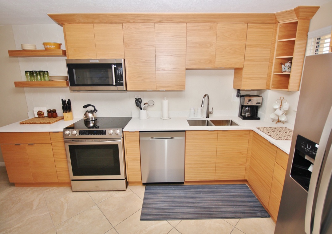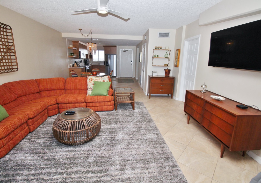 With its midcentury charm and stunning oceanfront views, Golden Arms 802 is the ultimate beach getaway. Situated on the 8th floor, this two-bedroom, two-bathroom condo overlooks New Smyrna’s golden sands and blue waters, while also being a short stroll from the vibrant dining and shopping scene on Flagler Avenue. Pops of orange, warm wood tones, and natural light greet you upon entry, leading to a newly renovated kitchen inspired by Scandinavian modern design, featuring wood cabinetry, stainless steel appliances, and open shelving. Stocked with all the essentials, from a drip coffee maker to a blender, the kitchen provides a functional and stylish space for your culinary needs.