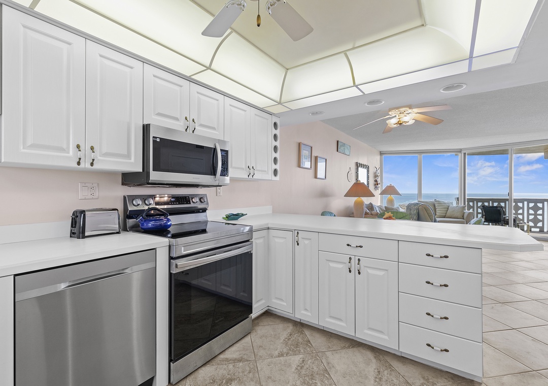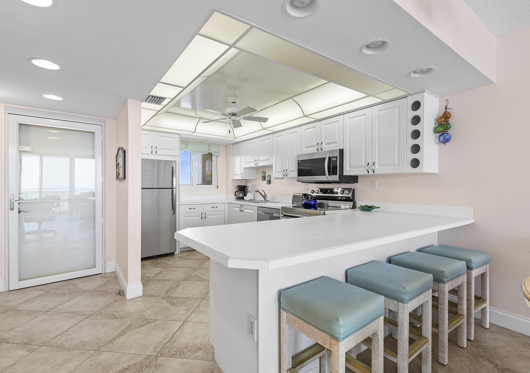 Treat yourself to sweeping, 24/7 views of the Atlantic Ocean at Golden Arms 803, a beautiful two-bedroom, two-bathroom condo on the 8th floor of New Smyrna Beach. Perfect for groups of up to six, this retreat features warm golden hues and tile flooring that contrast beautifully with the blue waters beyond. As you step inside, the ocean greets you, drawing you into a bright, fully stocked kitchen complete with white cabinetry, countertops, stainless steel appliances, and all the essentials for home-cooked meals, including a drip coffee maker, toaster, and blender. Enjoy meals at the dining table or the breakfast bar, each seating four, before heading out to explore the nearby beach, pool, or Flagler Avenue’s vibrant dining and shopping scene.
