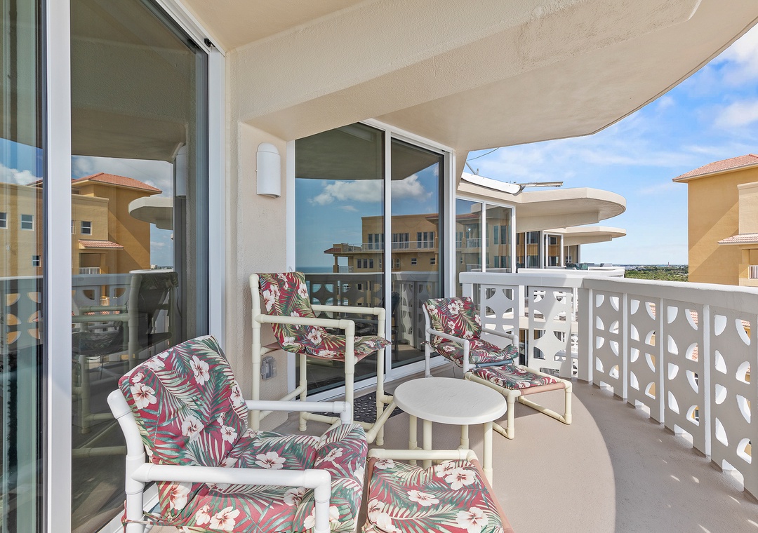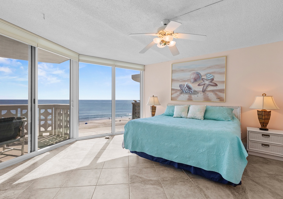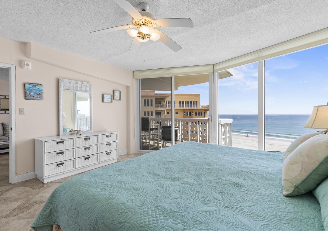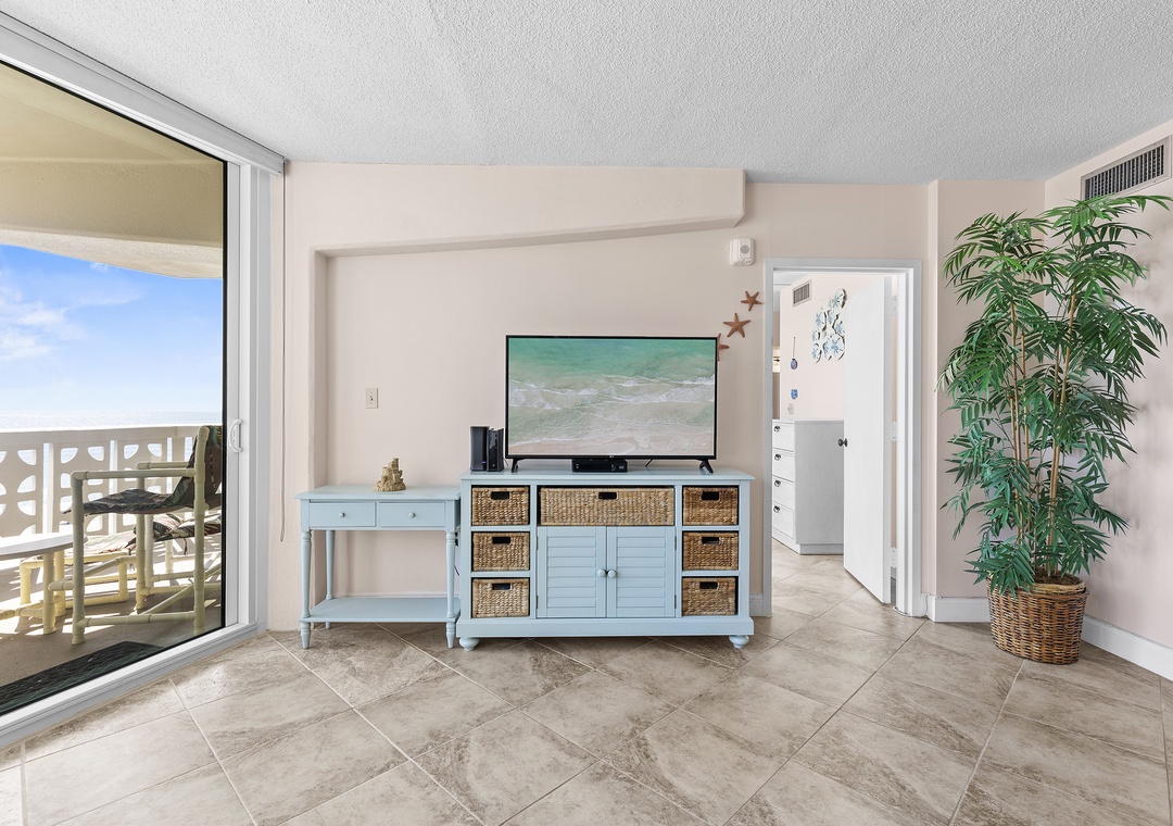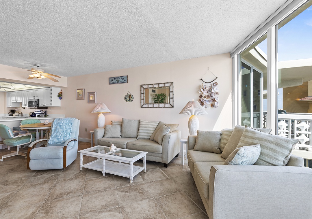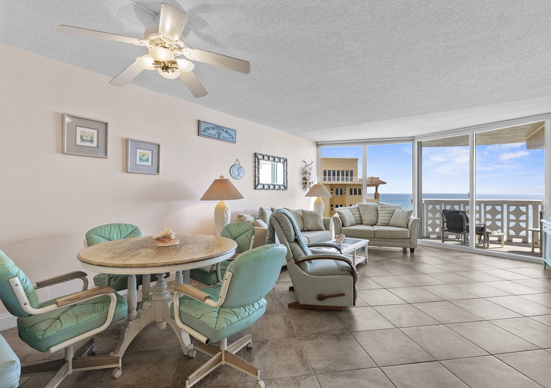 After a day of adventure, unwind in the comfortable living room, furnished with a pull-out couch, loveseat, and recliner, all offering the best ocean views. Catch your favorite shows on the Smart TV with cable or step out onto the oceanfront balcony for a glass of wine, listening to the waves and soaking in views of the ebbing tide, beach, and pool. At bedtime, the primary king ensuite bedroom provides an escape with a king bed, dresser, vanity, and private balcony access. The second bedroom accommodates two guests with twin beds, TV, and guest bathroom in hall. Complete with WiFi, cable, garage parking, beach chairs, a cooler, and plenty of linens and towels, this condo offers all the comforts of home, plus the best views in New Smyrna Beach.