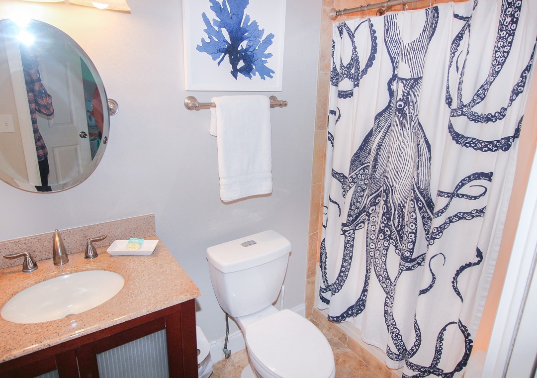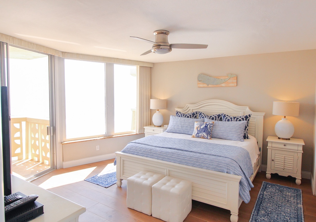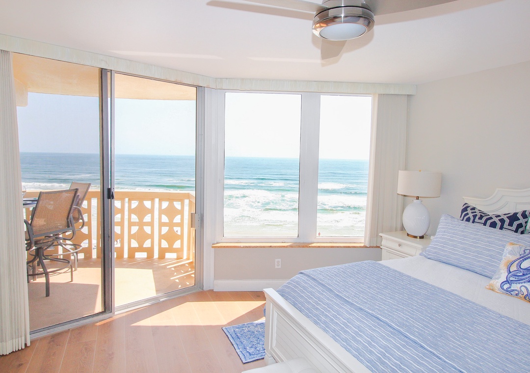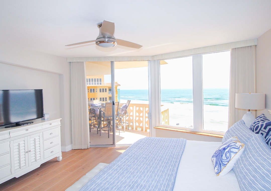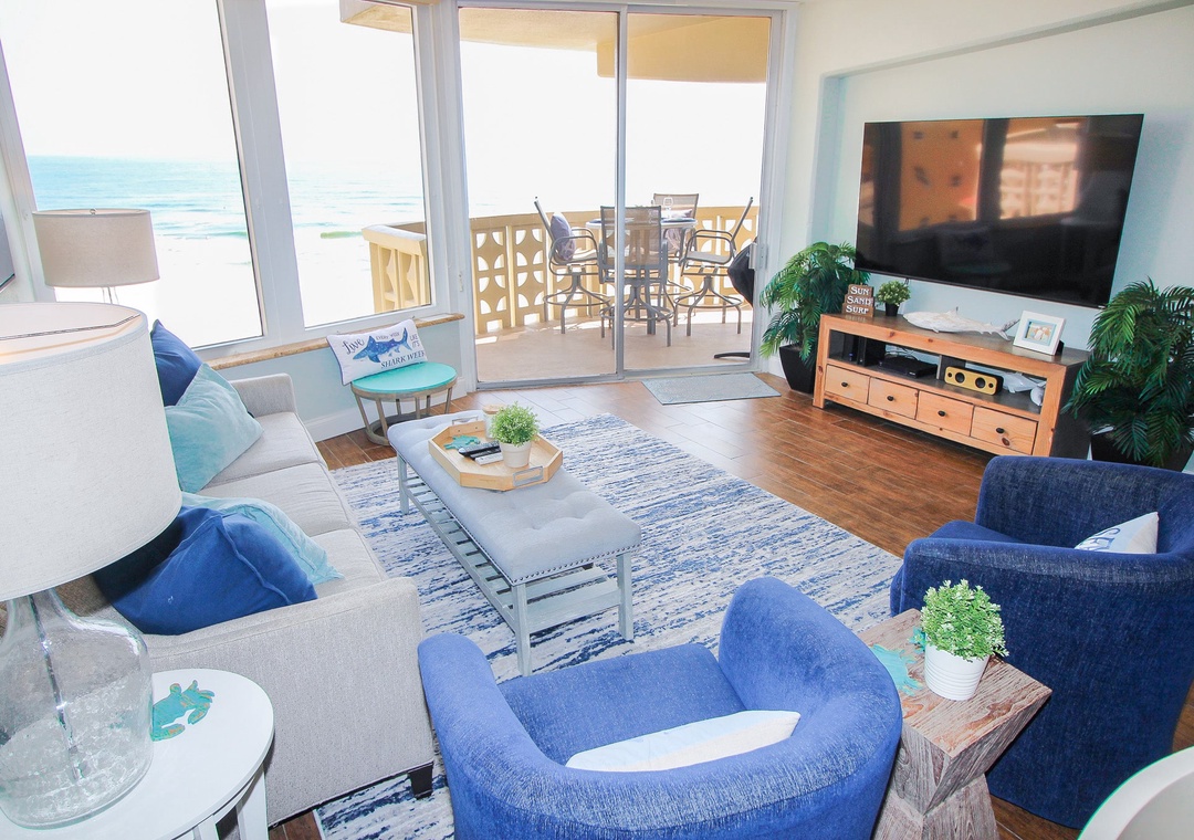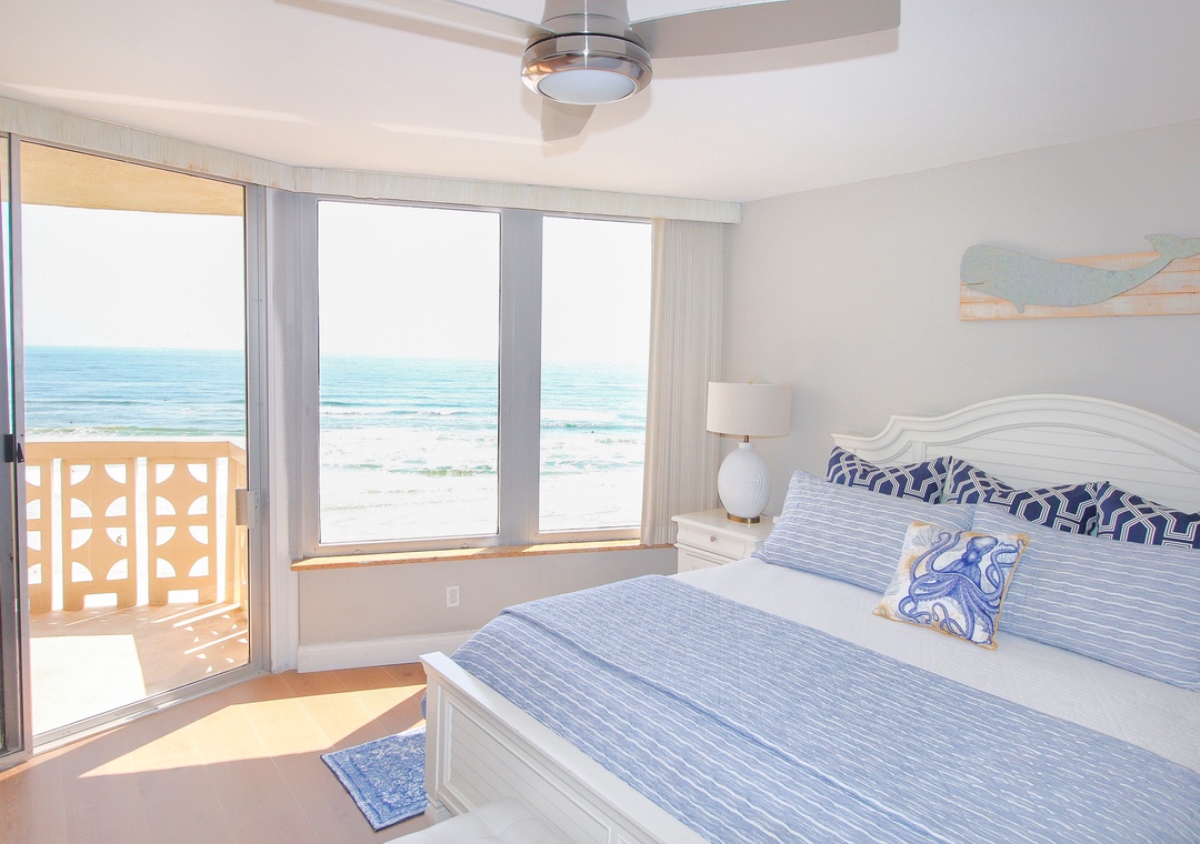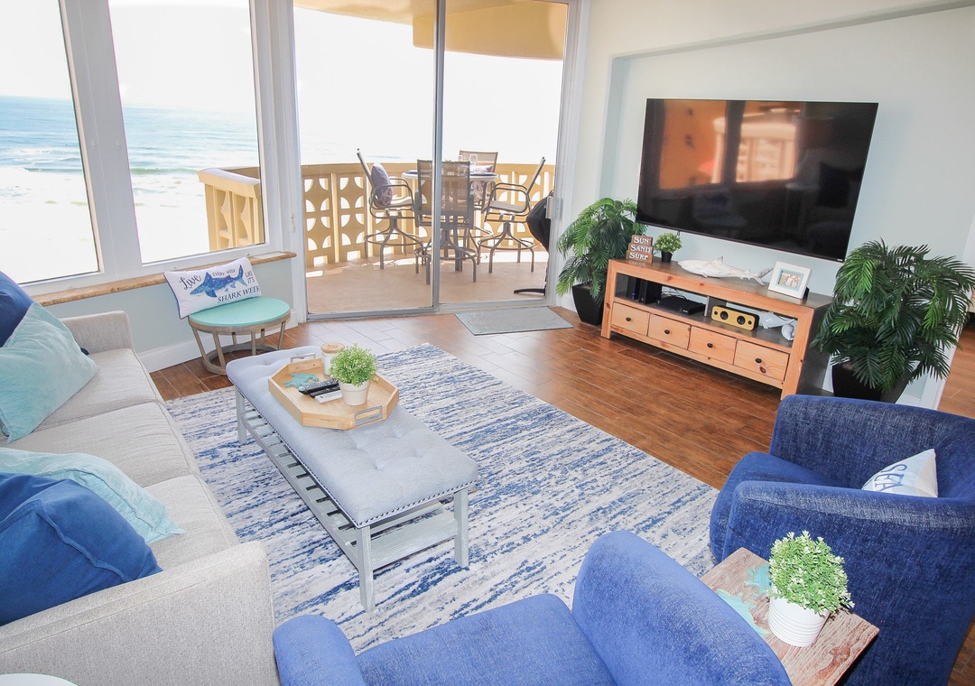 The dining area exudes beach cottage charm with a round table for four, complemented by two more seats at the kitchen’s granite overhang, all with a perfect ocean view through sliding glass doors. The chic, coastal-themed living room invites you to relax on a comfy grey L-shaped couch facing both a 70" flat-screen TV and the crystal waters outside, with royal blue armchairs and beachy decor tying it all together. The real showstopper is the balcony, equipped with an outdoor dining table, electric George Foreman grill, and panoramic ocean views, making it the ultimate spot for sunset dinners and salty breezes. The primary suite, accessible through a private balcony entrance, features a brand-new king bed, wrap-around ocean views, a flat-screen TV, and an en-suite bathroom with a double vanity and tiled walk-in shower. The guest bedroom is equally inviting, sleeping four with a king bed and a twin daybed with a pull-out trundle, while the nearby bathroom features a tub and coastal accents. Complete with linens, towels, beach chairs, garage parking, a washer/dryer, WiFi, and cable, this condo ensures a perfectly comfortable and unforgettable beach escape.