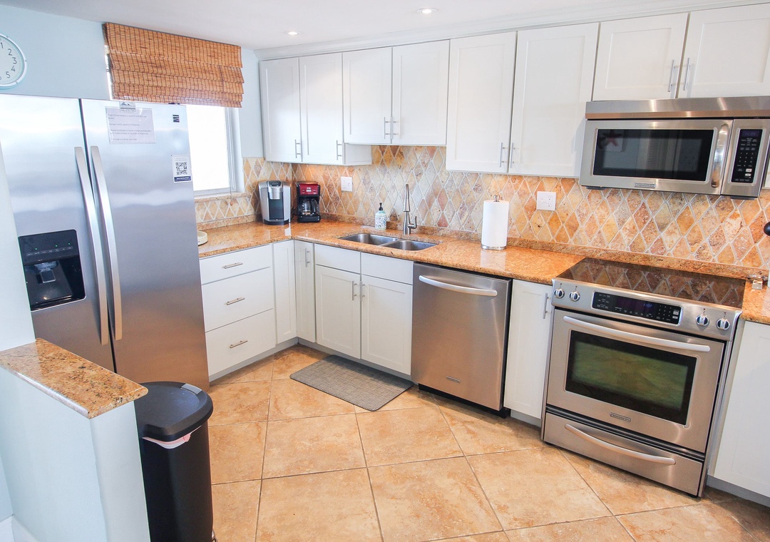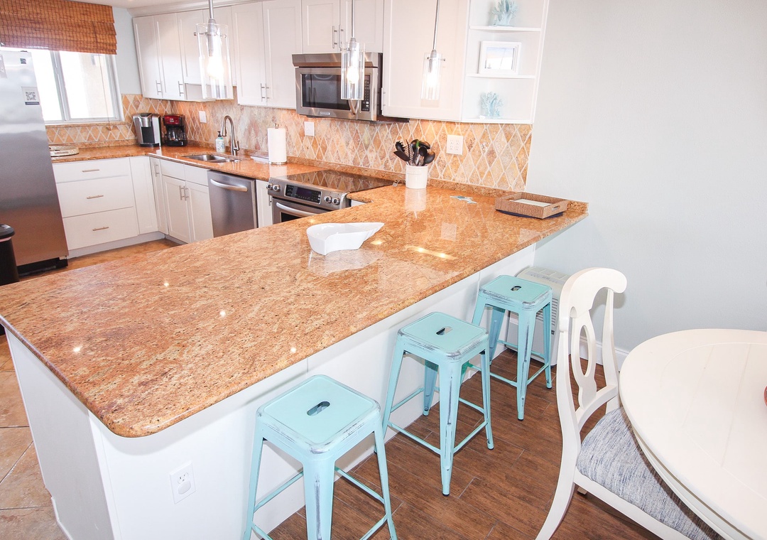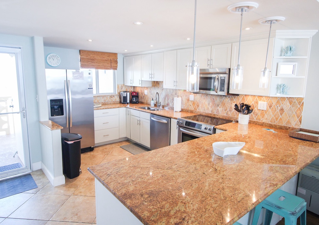 Golden Arms 805 is your perfect slice of paradise, offering al fresco dining and breathtaking bird's-eye views of crashing waves and clear skies. This top-floor, two-bedroom, two-bathroom condo boasts an oceanfront location with a bright, newly renovated interior and is only a short walk from Flagler Avenue’s dining and shopping. As you enter, you’ll be greeted by an expansive view of blue waters stretching endlessly to the horizon, a sight that makes unpacking secondary. The light-filled kitchen charms with white cabinetry, stainless steel appliances, and custom tile backsplash, and it’s stocked with everything you need, from two coffee makers (Drip and Keurig) to a toaster. Breakfasts here, with a warm cup of coffee and an Atlantic view, are simply heavenly.